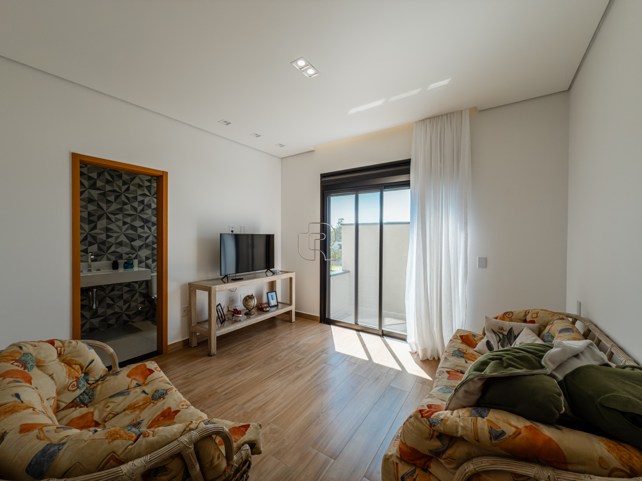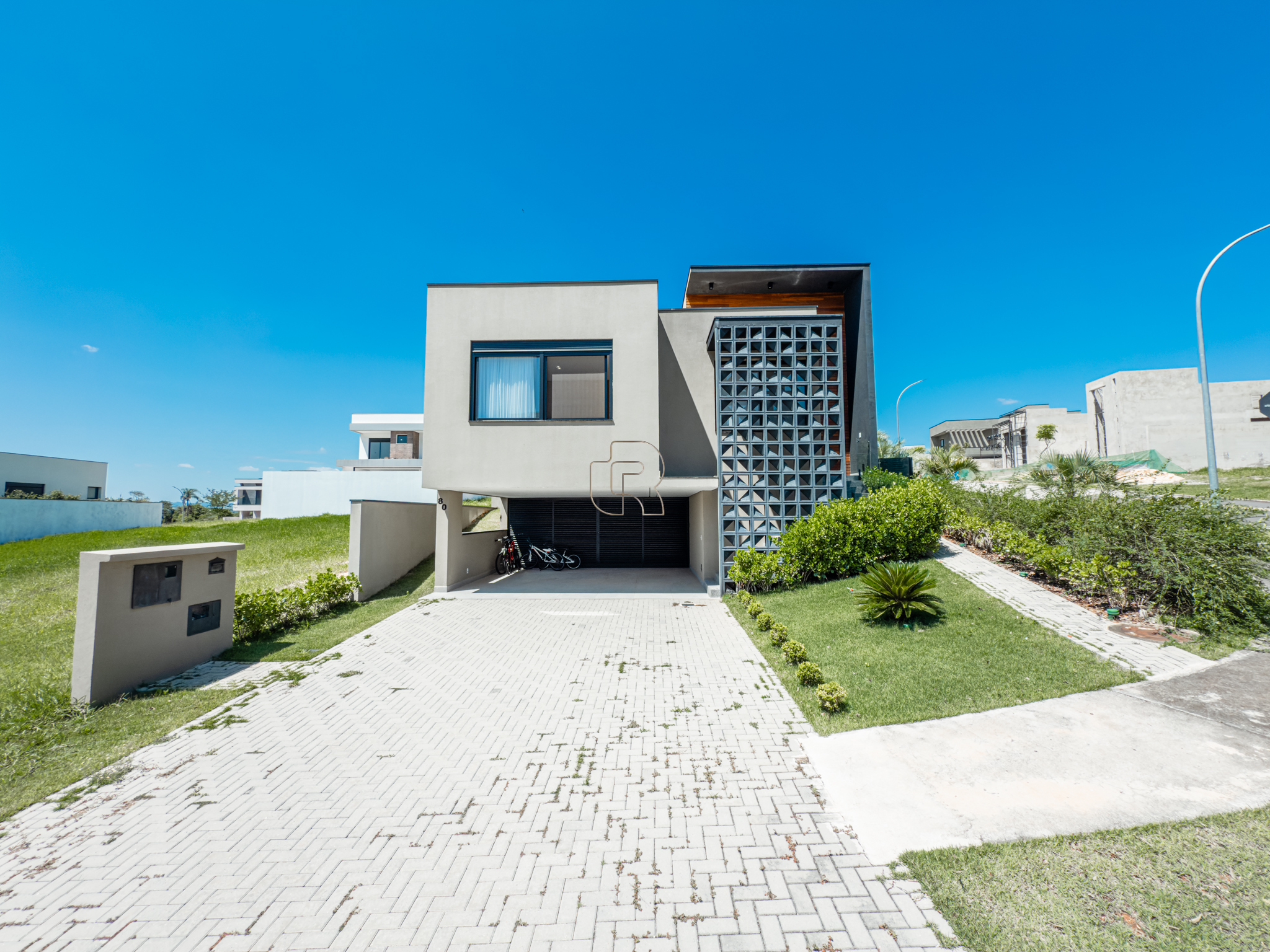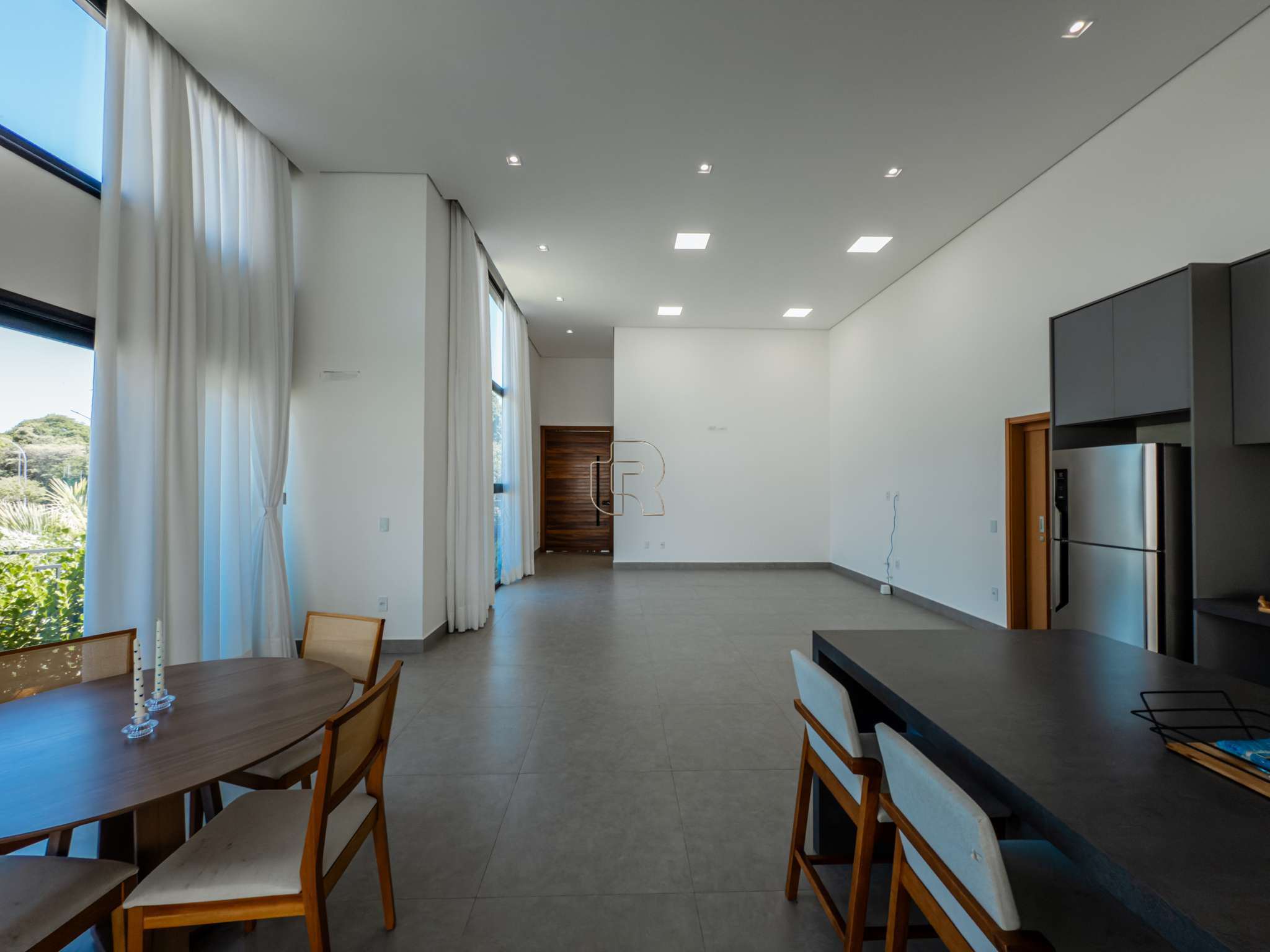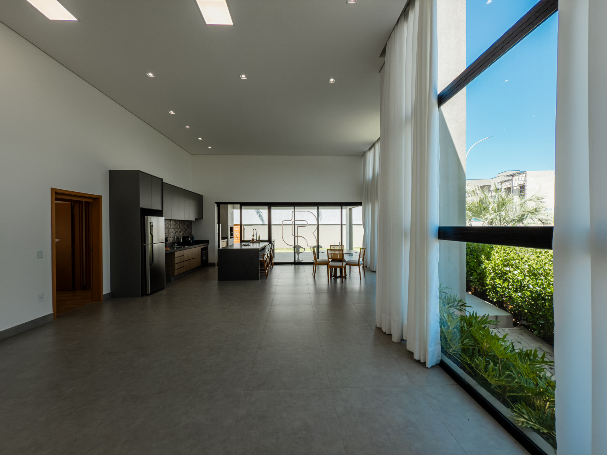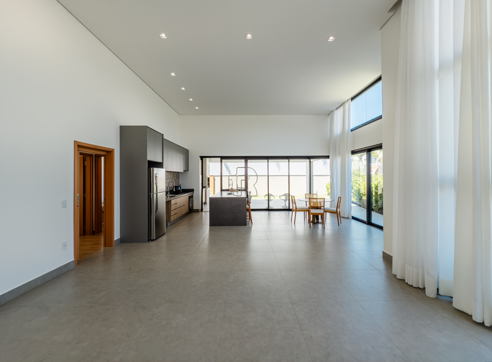 Residência contemporânea com projeto funcional e bem distribuído, composta por três suítes, sendo uma master, além de um dormitório destinado a hóspedes ou home office. O imóvel conta ainda com dois banheiros adicionais, um lavabo interno e outro externo, ambos equipados com chuveiro elétrico. As áreas sociais são totalmente integradas, com cozinha, sala de jantar e sala de TV/estar em um ambiente amplo, valorizado pelo pé-direito elevado, que proporciona maior iluminação e sensação de amplitude.