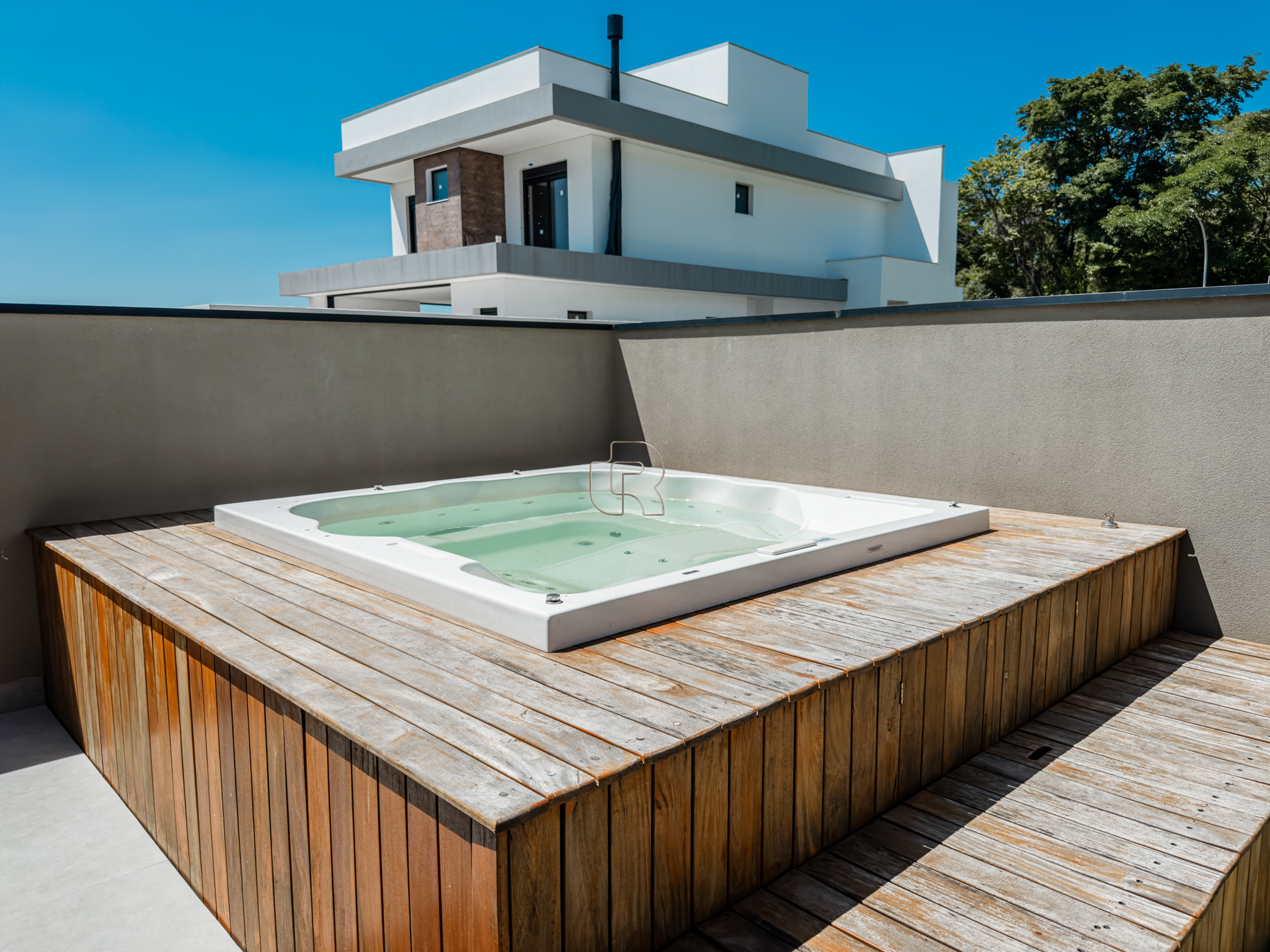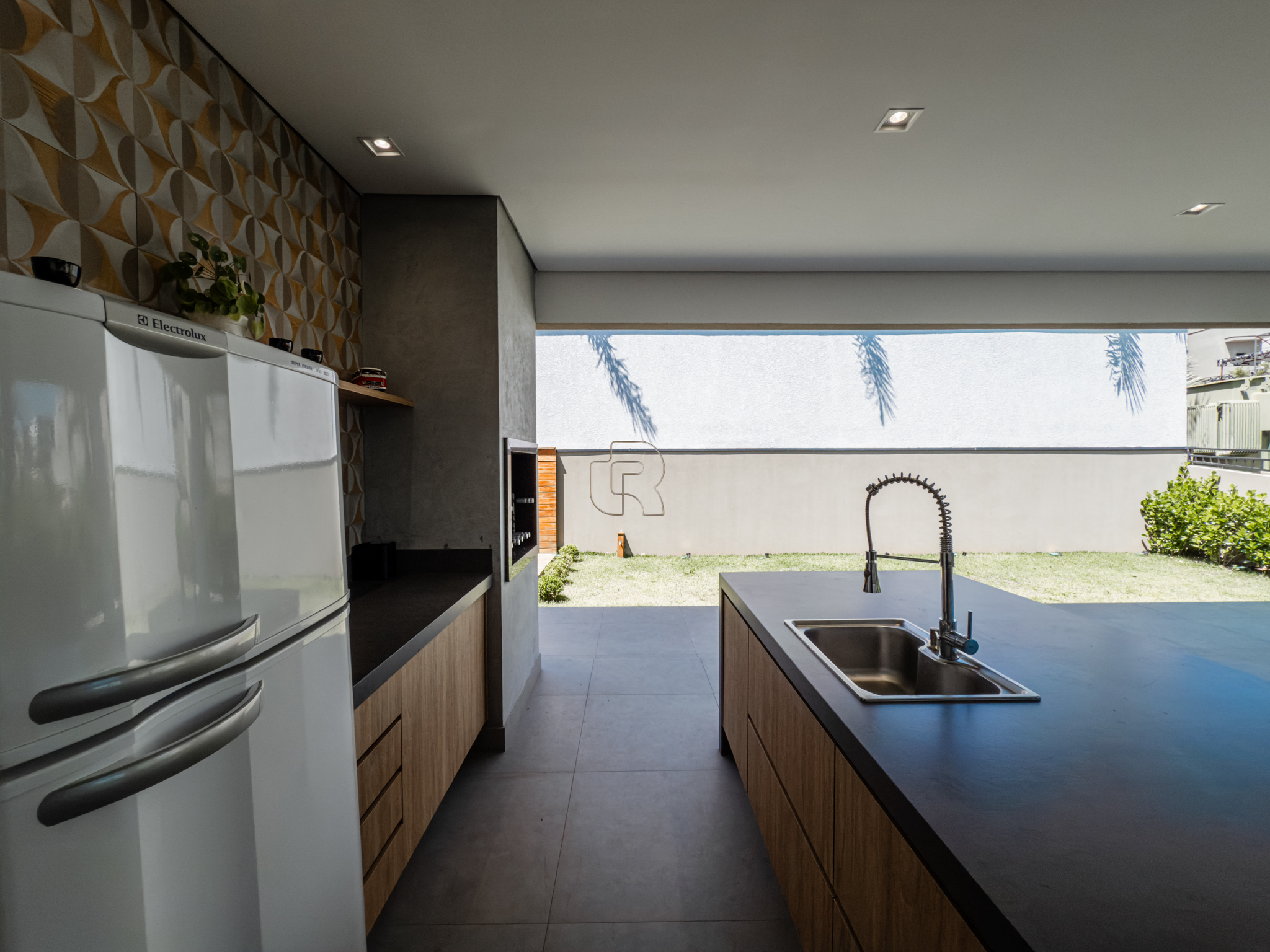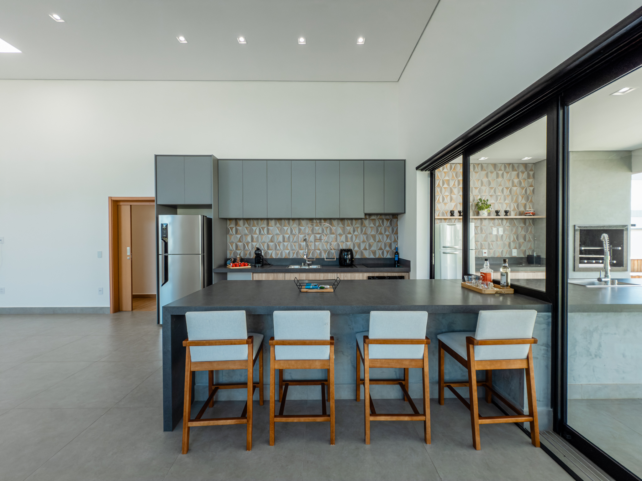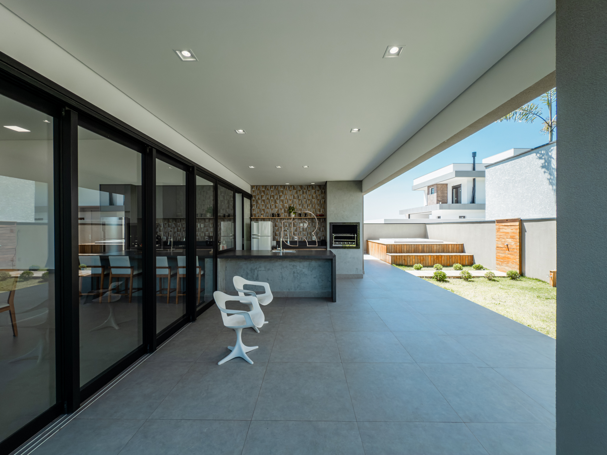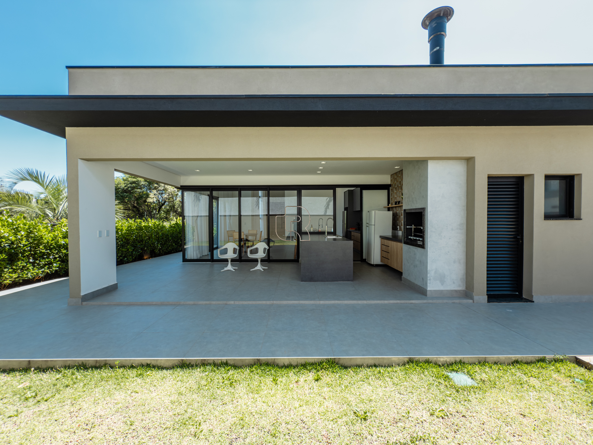 O espaço gourmet integra-se harmoniosamente à cozinha, ambos com ilha central, criando um ambiente ideal para convivência e recepções. A residência dispõe de garagem para quatro veículos, sendo duas vagas cobertas, além de um amplo armário destinado a depósito. Conta também com lavanderia independente, garantindo praticidade no dia a dia.