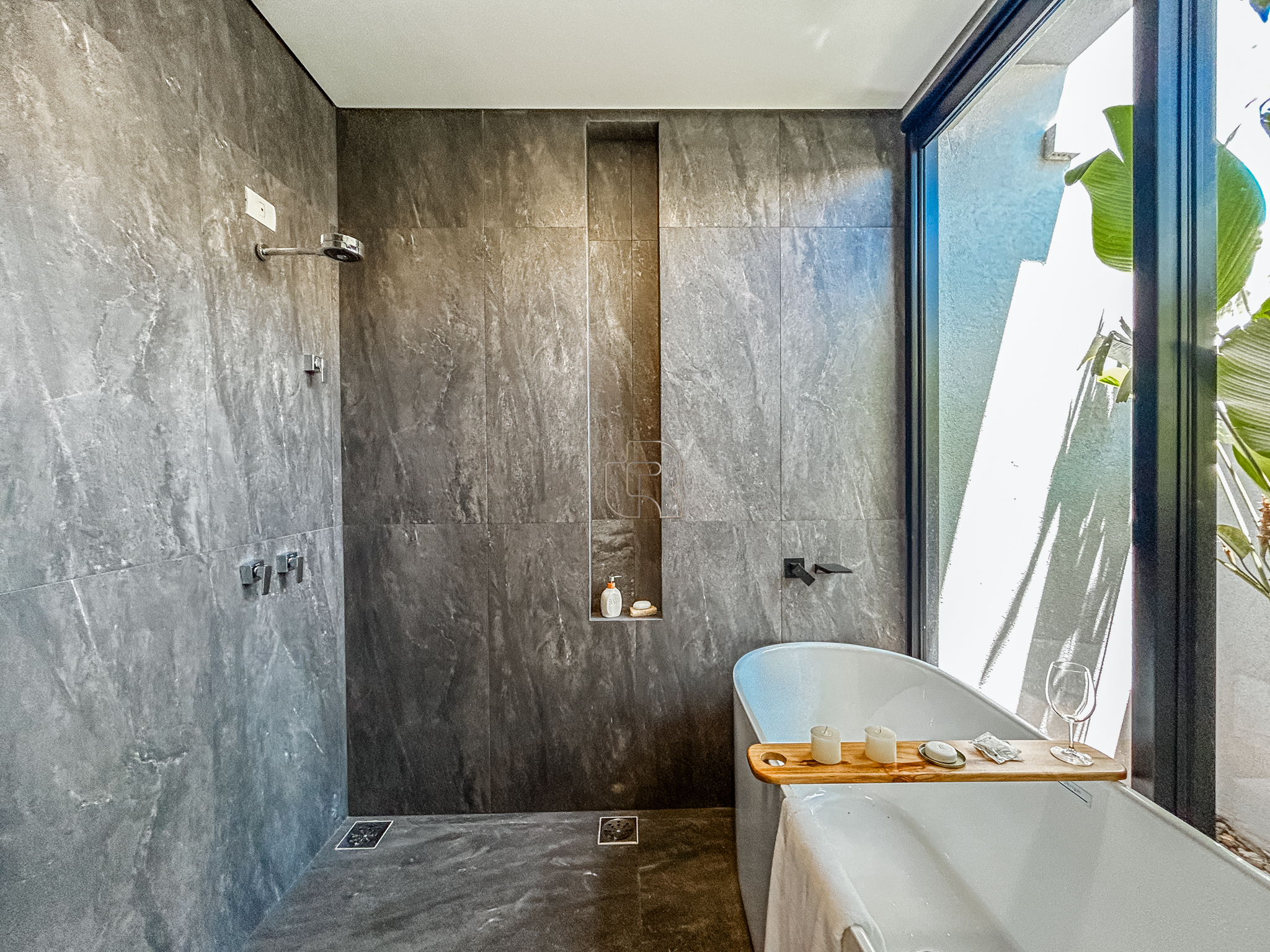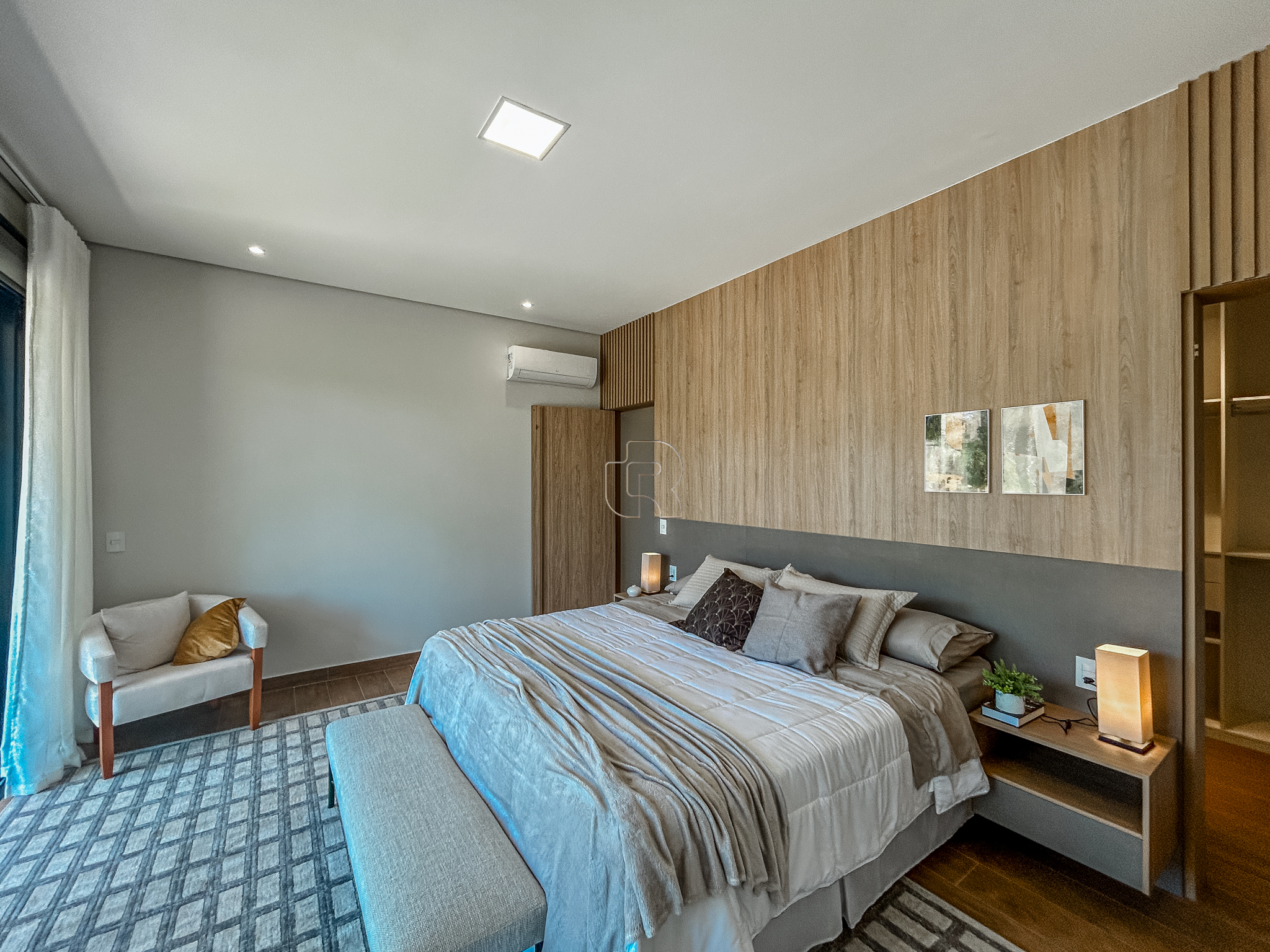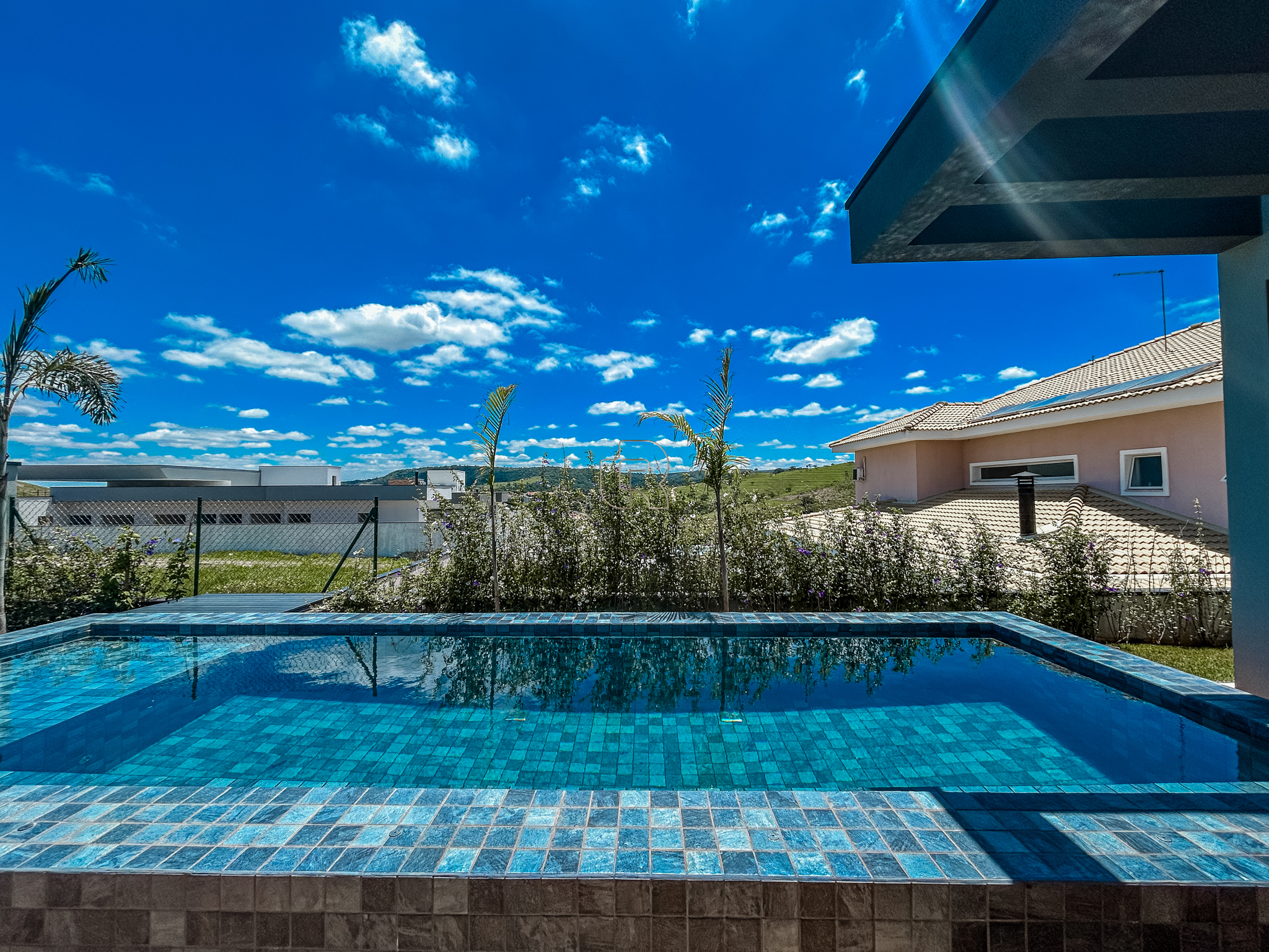 O imóvel conta com quatro suítes, sendo uma máster com closet, banheira de imersão, jardim de inverno e varanda com vista para a área de preservação do condomínio, além de seis banheiros, sala de TV, escritório e roupeiro. A área social e gourmet é ampla e integrada, complementada por piscina, jardim, pomar, vestiário externo e seis vagas de garagem.
