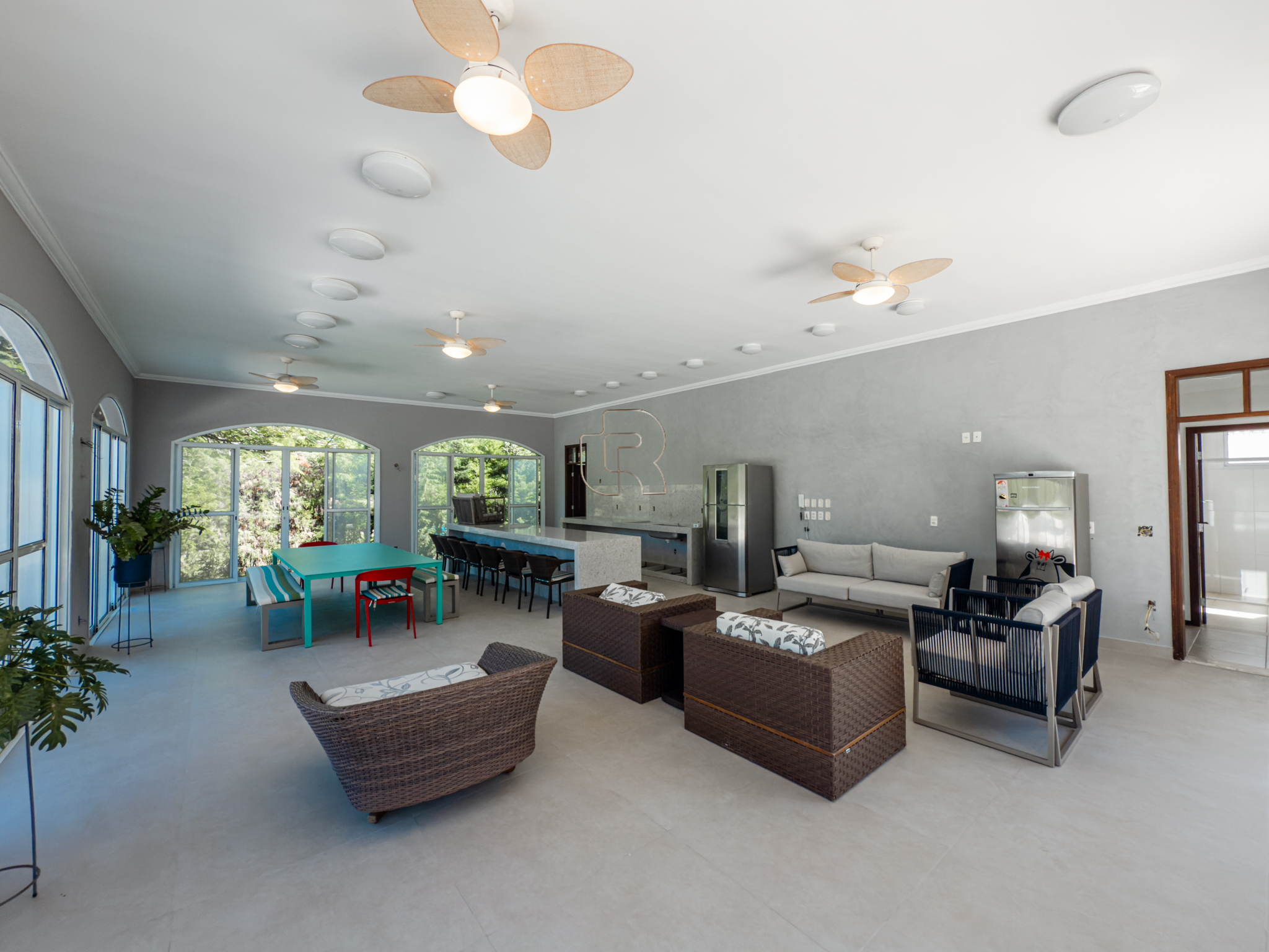 Área externa com espaçoso salão gourmet envidraçado, equipado com ilha, balcão, sofás e geladeiras, além de sauna, suíte de hóspedes, banheiros de apoio e espaço para brinquedoteca. Piscina com deck em pedra São Tomé, jardim com coqueiros e lareira móvel.