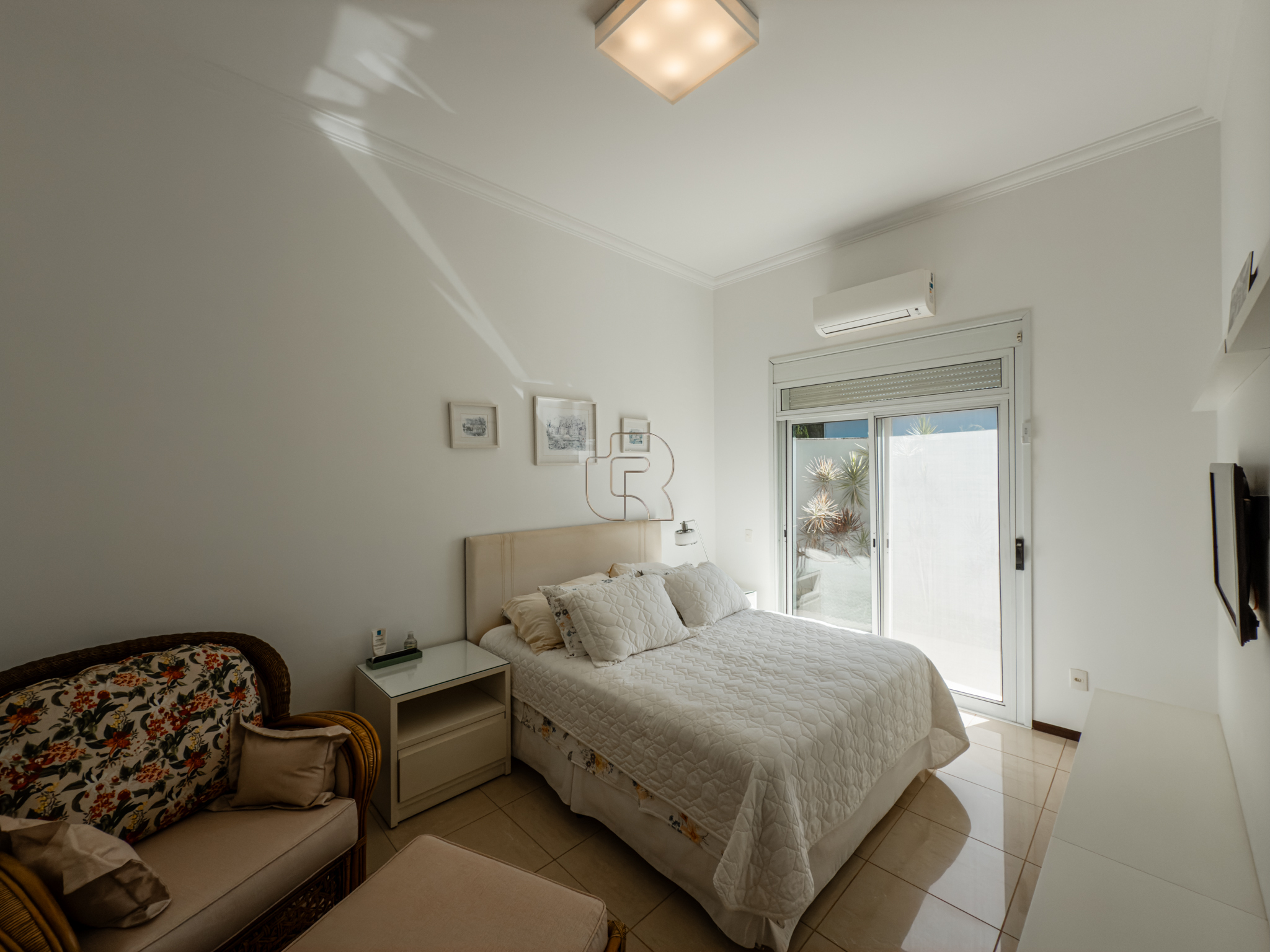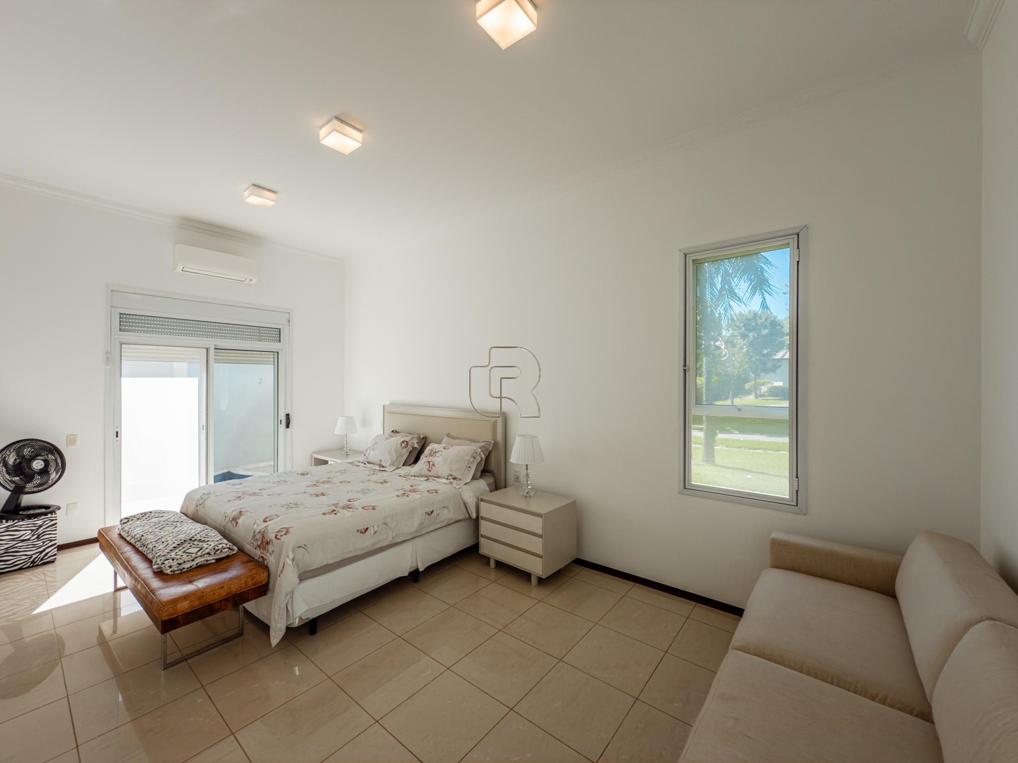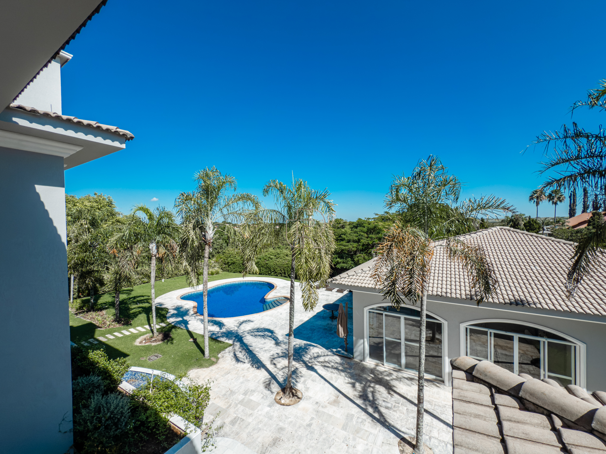 No térreo: hall de entrada, escritório com adega climatizada, sala de TV privativa, sala de estar com pé-direito duplo e lareira, sala de jantar, jardim de inverno, copa, cozinha planejada, lavanderia e dependência de serviço. A suíte master tem closet, banheiro amplo e varanda privativa. Outras suítes possuem ar-condicionado, armários e varandas.