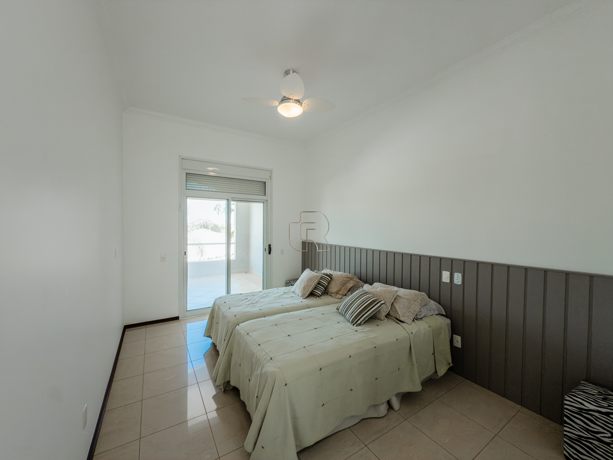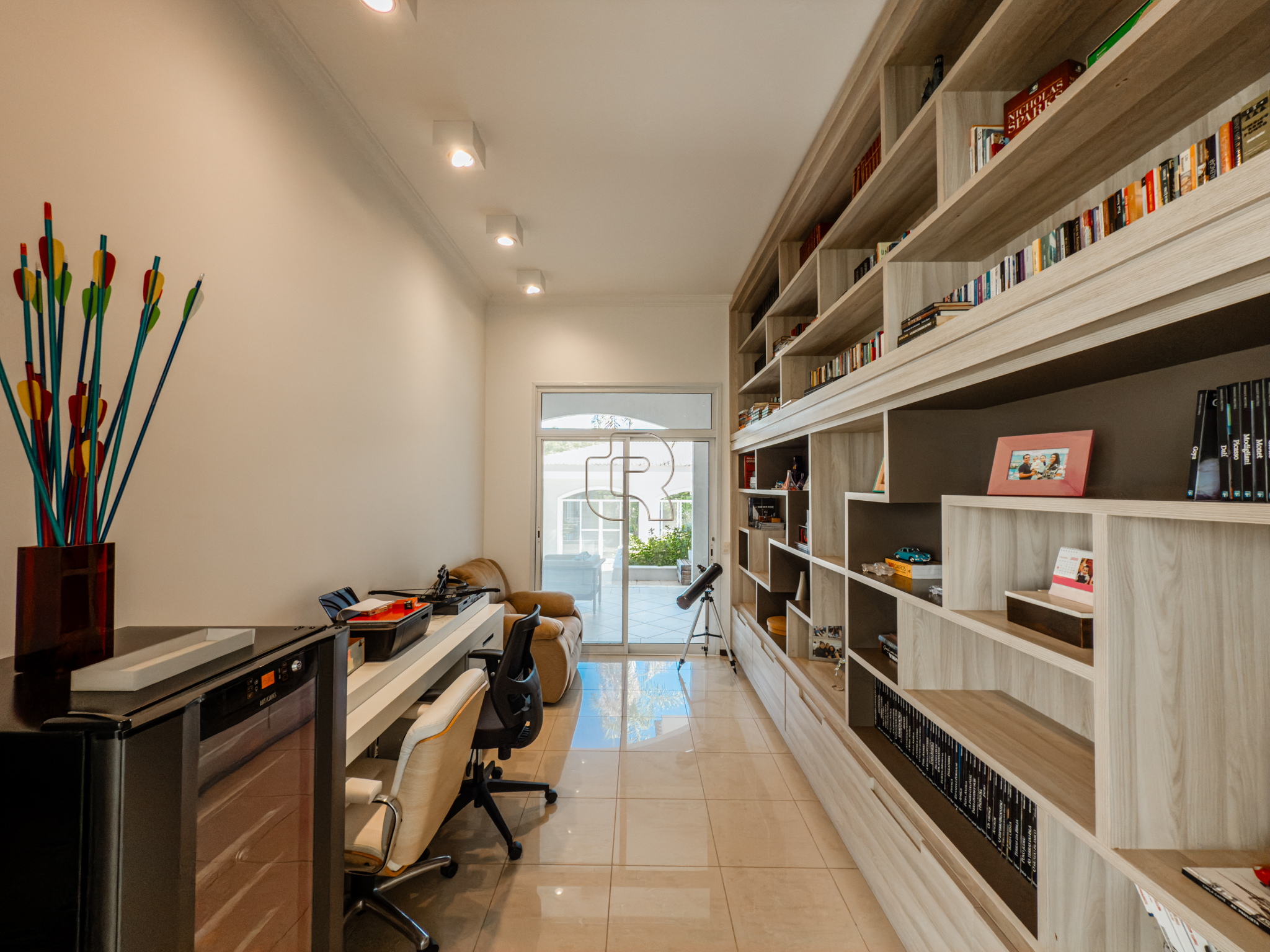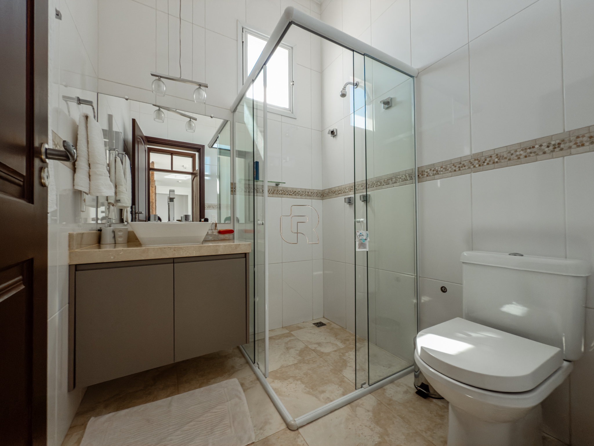 No térreo: hall de entrada, escritório com adega climatizada, sala de TV privativa, sala de estar com pé-direito duplo e lareira, sala de jantar, jardim de inverno, copa, cozinha planejada, lavanderia e dependência de serviço. A suíte master tem closet, banheiro amplo e varanda privativa. Outras suítes possuem ar-condicionado, armários e varandas.
