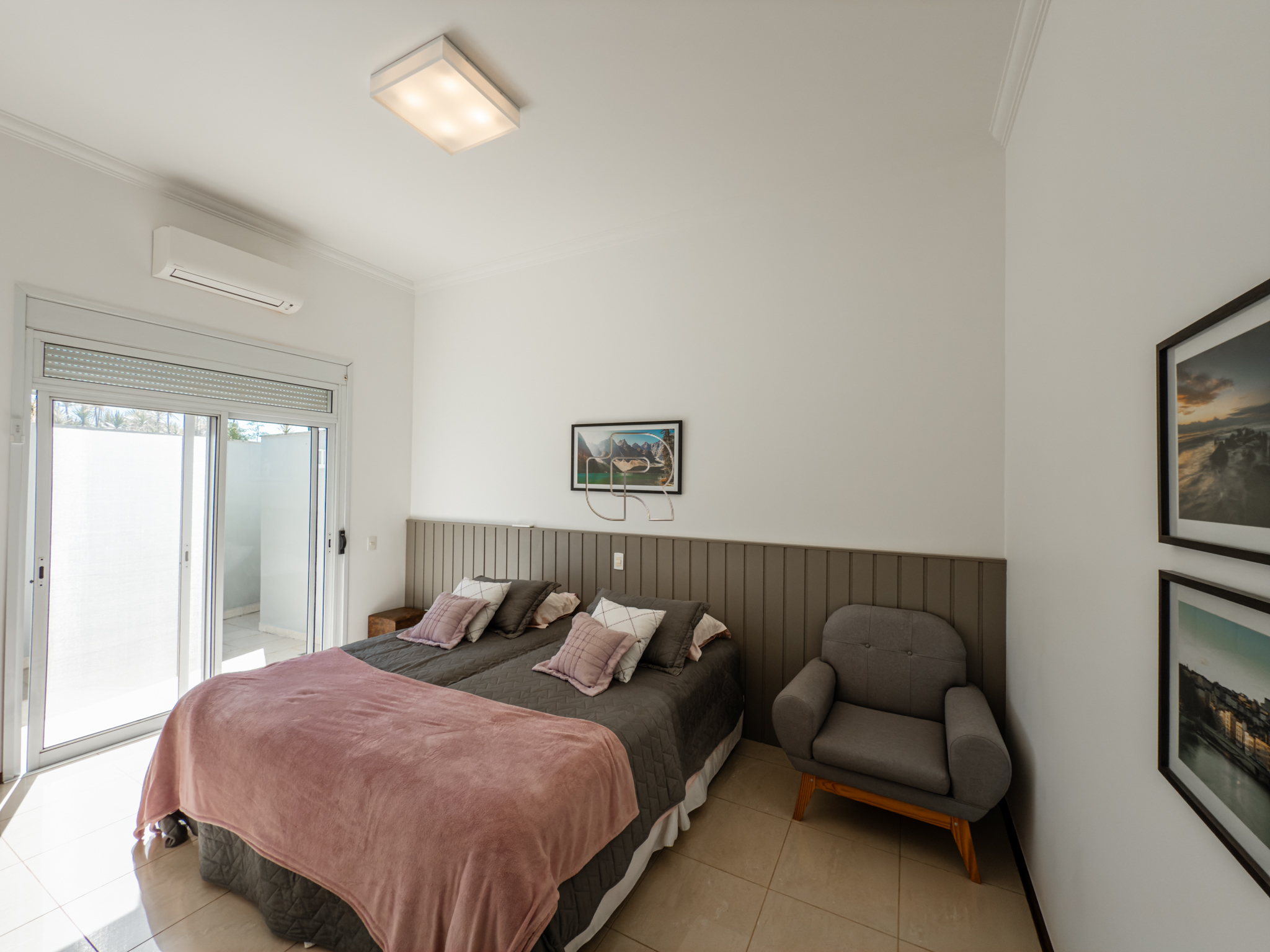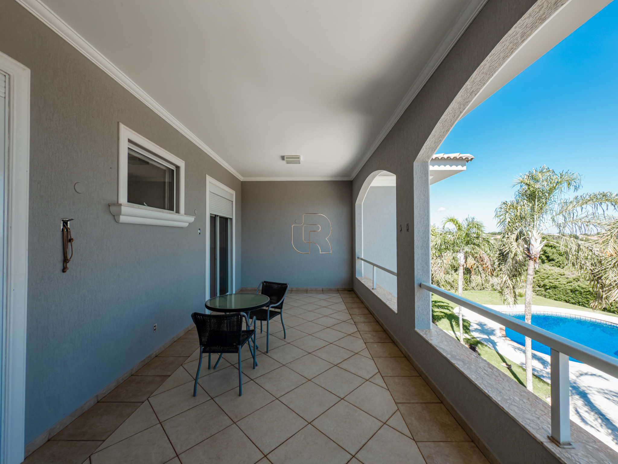 A casa tem acabamento refinado em porcelanato e grafiato, garagem para 8 veículos, poço artesiano e sistema de reservatórios.