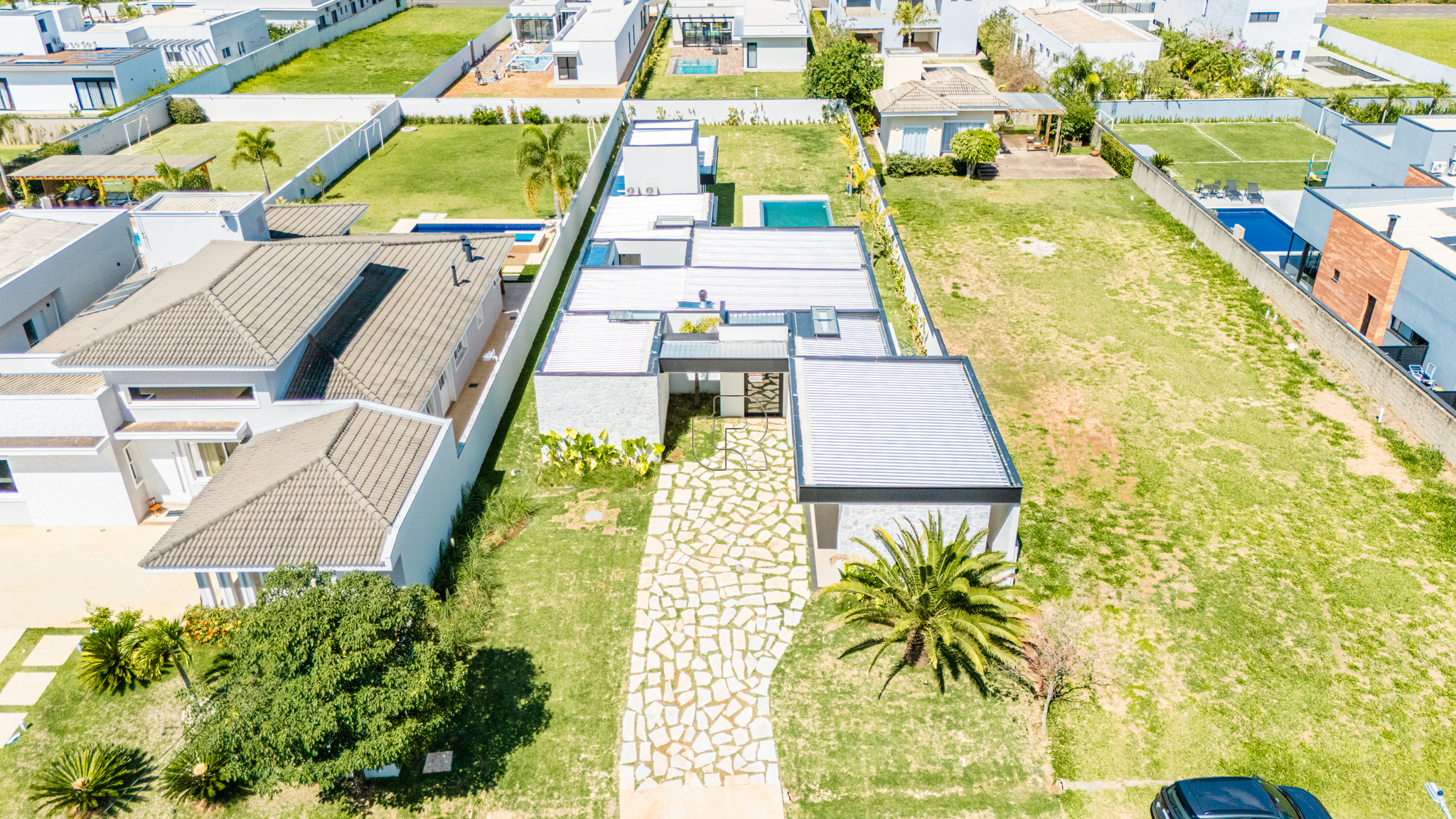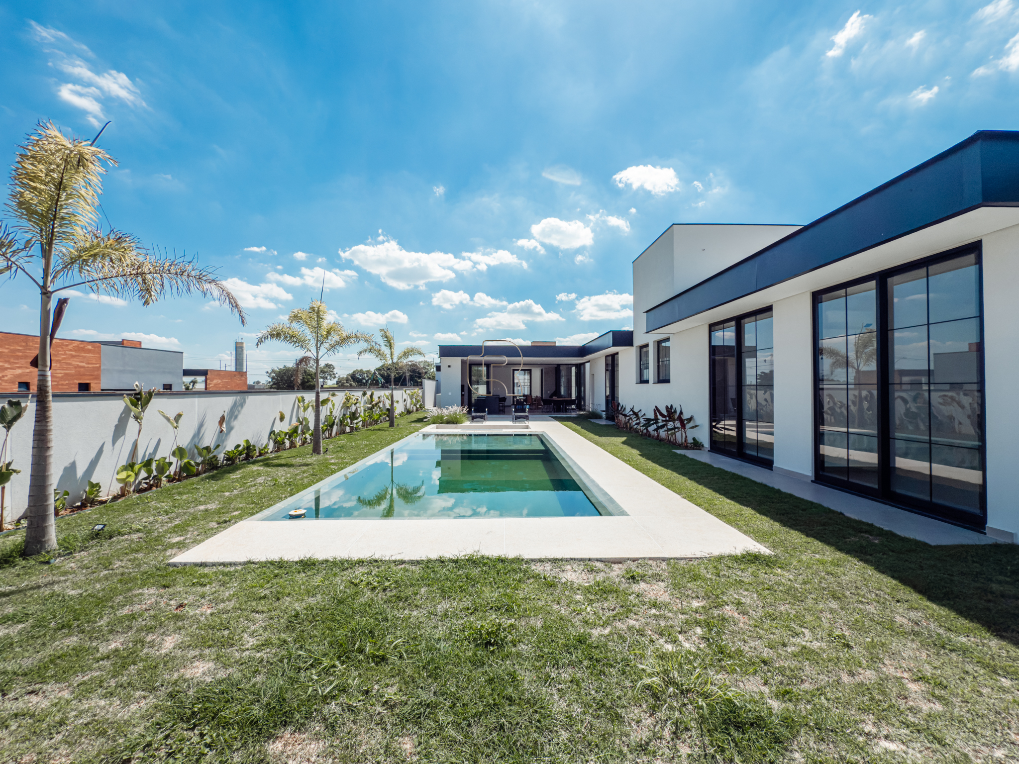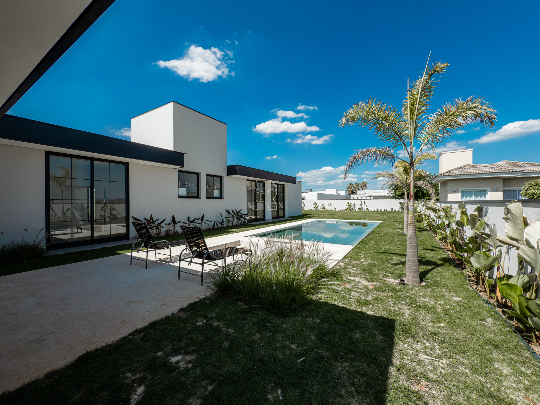 A residência possui escritório, três suítes com closet, sendo a suíte master diferenciada por seu closet mais amplo. O projeto contempla paisagismo completo, churrasqueira a gás, sistema de ar-condicionado e fechadura eletrônica. A garagem coberta acomoda até três veículos. A infraestrutura hidráulica inclui cisterna de 5.000 litros e caixa d’água de 2.500 litros. Há ainda a possibilidade de implantação de uma quadra de beach tênis, mediante valor adicional. Trata-se de um imóvel em construção que alia alto padrão, funcionalidade e qualidade de vida.