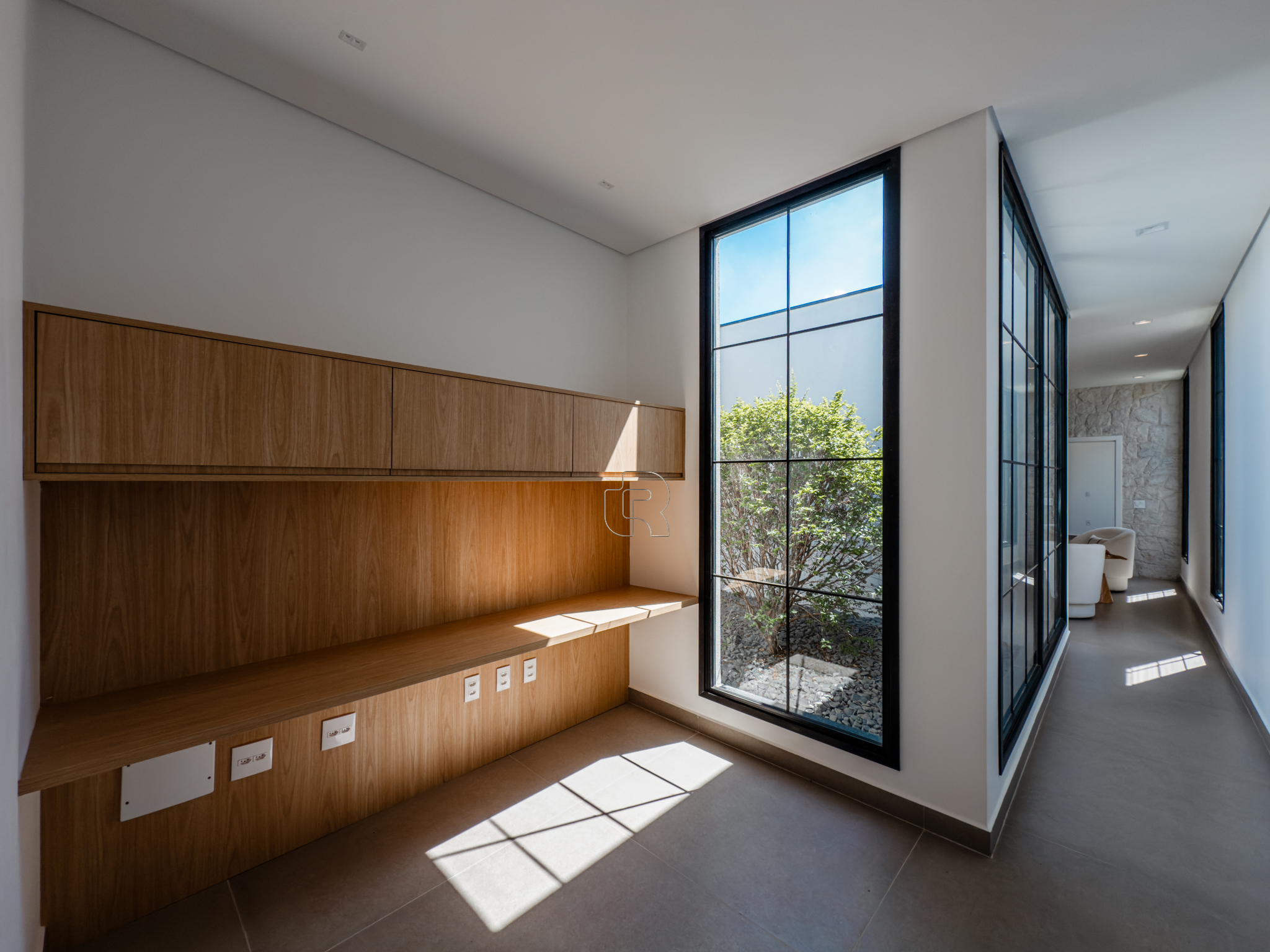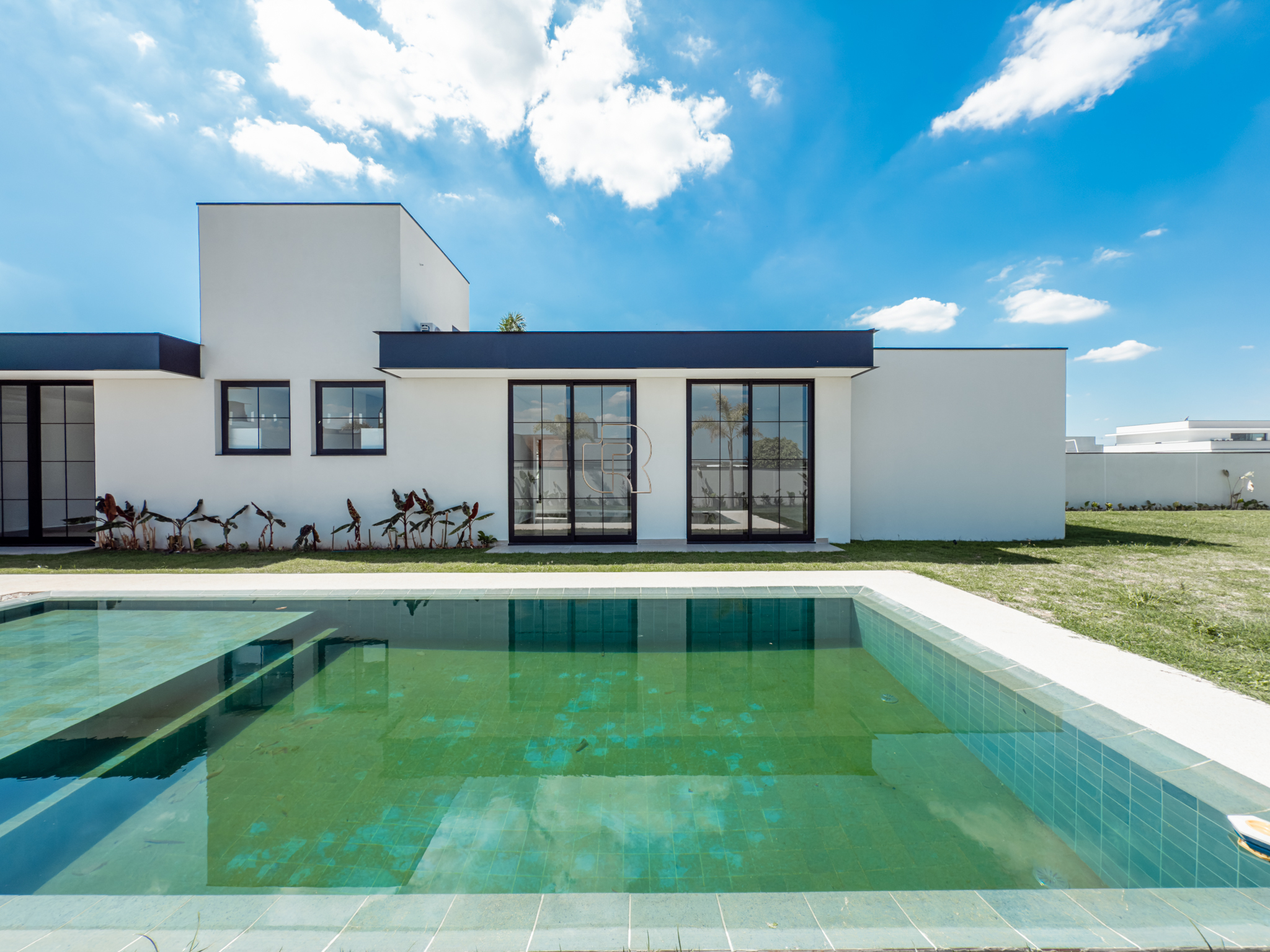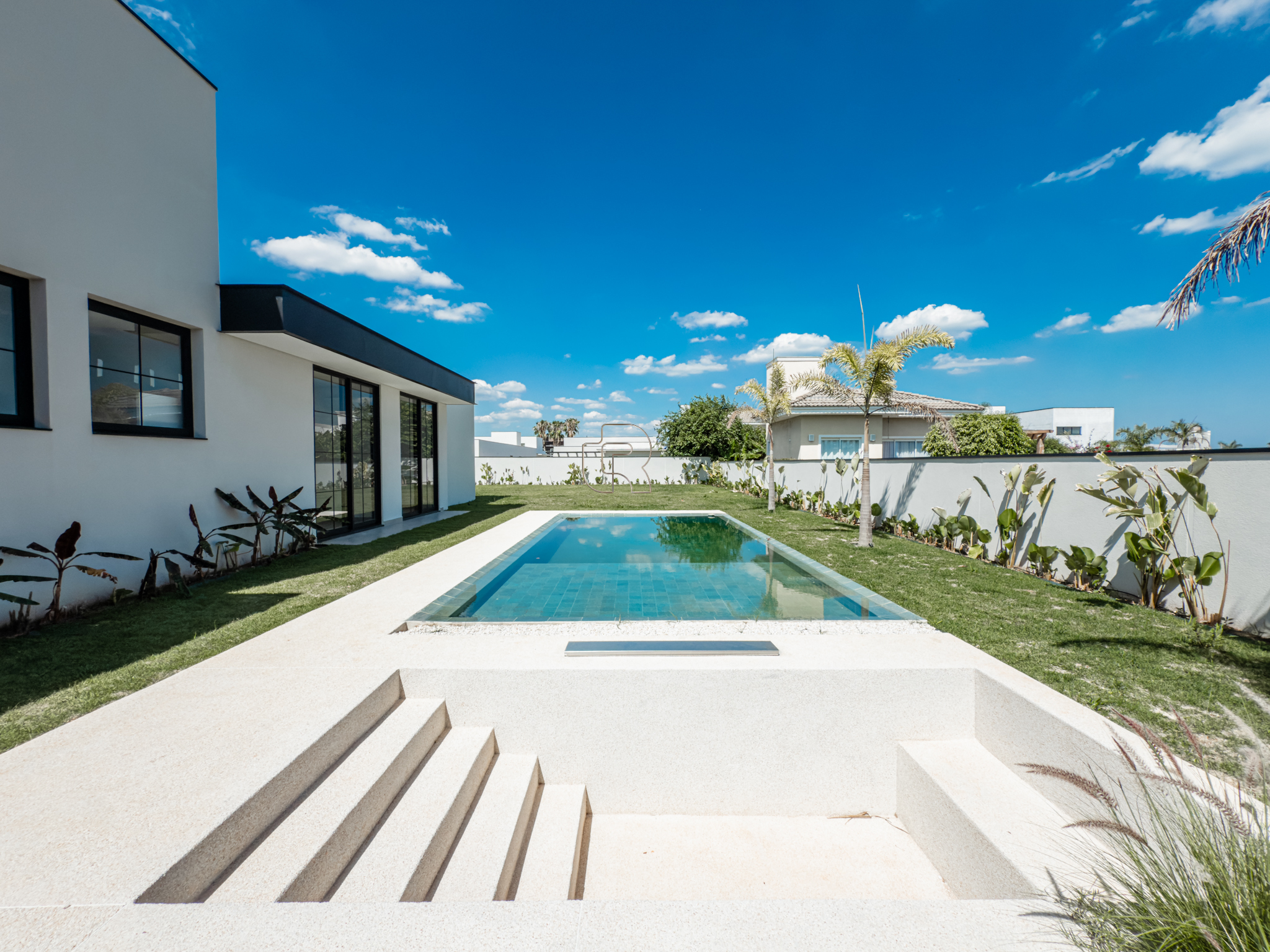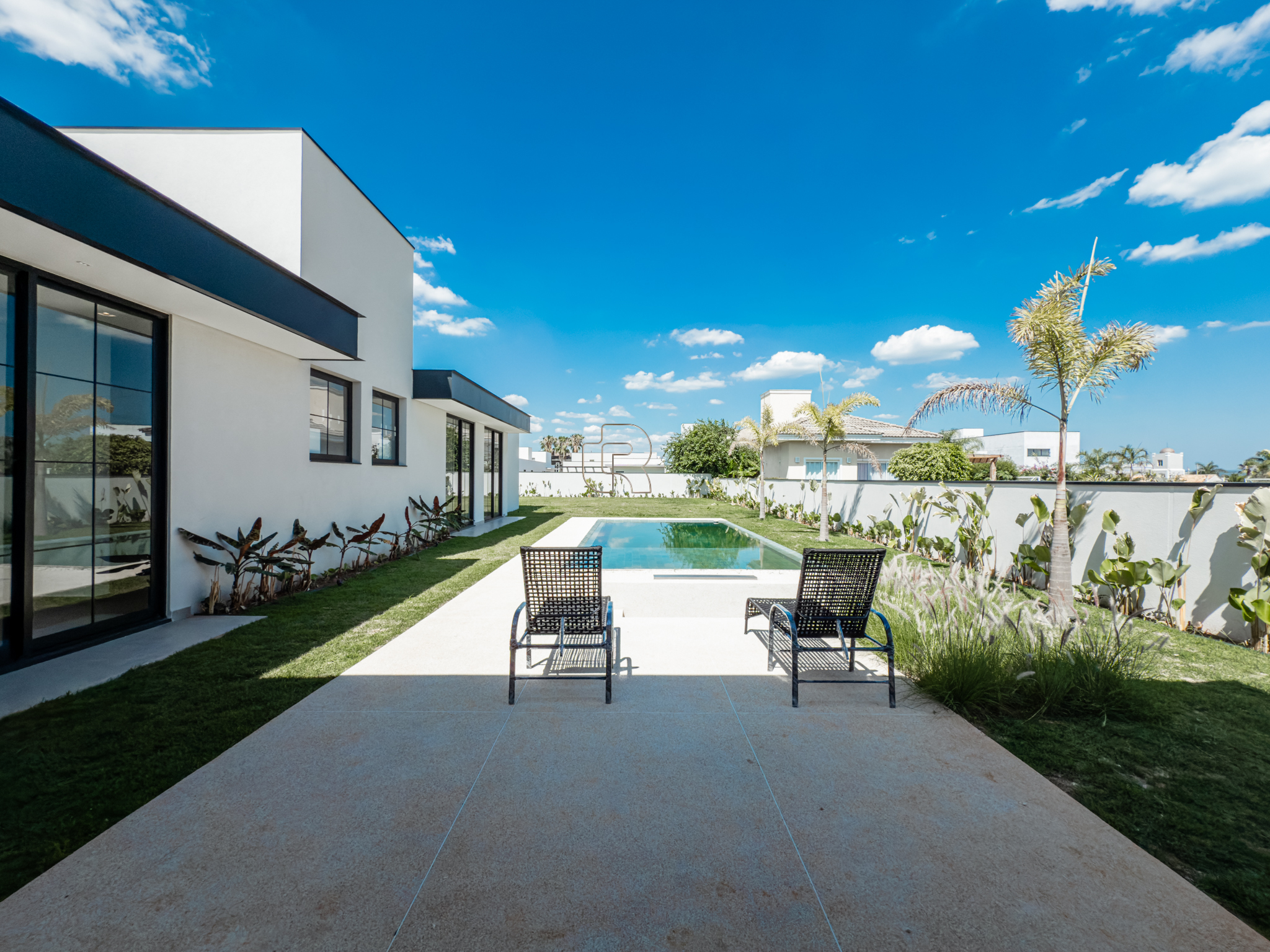 A residência possui escritório, três suítes com closet, sendo a suíte master diferenciada por seu closet mais amplo. O projeto contempla paisagismo completo, churrasqueira a gás, sistema de ar-condicionado e fechadura eletrônica. A garagem coberta acomoda até três veículos. A infraestrutura hidráulica inclui cisterna de 5.000 litros e caixa d’água de 2.500 litros. Há ainda a possibilidade de implantação de uma quadra de beach tênis, mediante valor adicional. Trata-se de um imóvel em construção que alia alto padrão, funcionalidade e qualidade de vida.