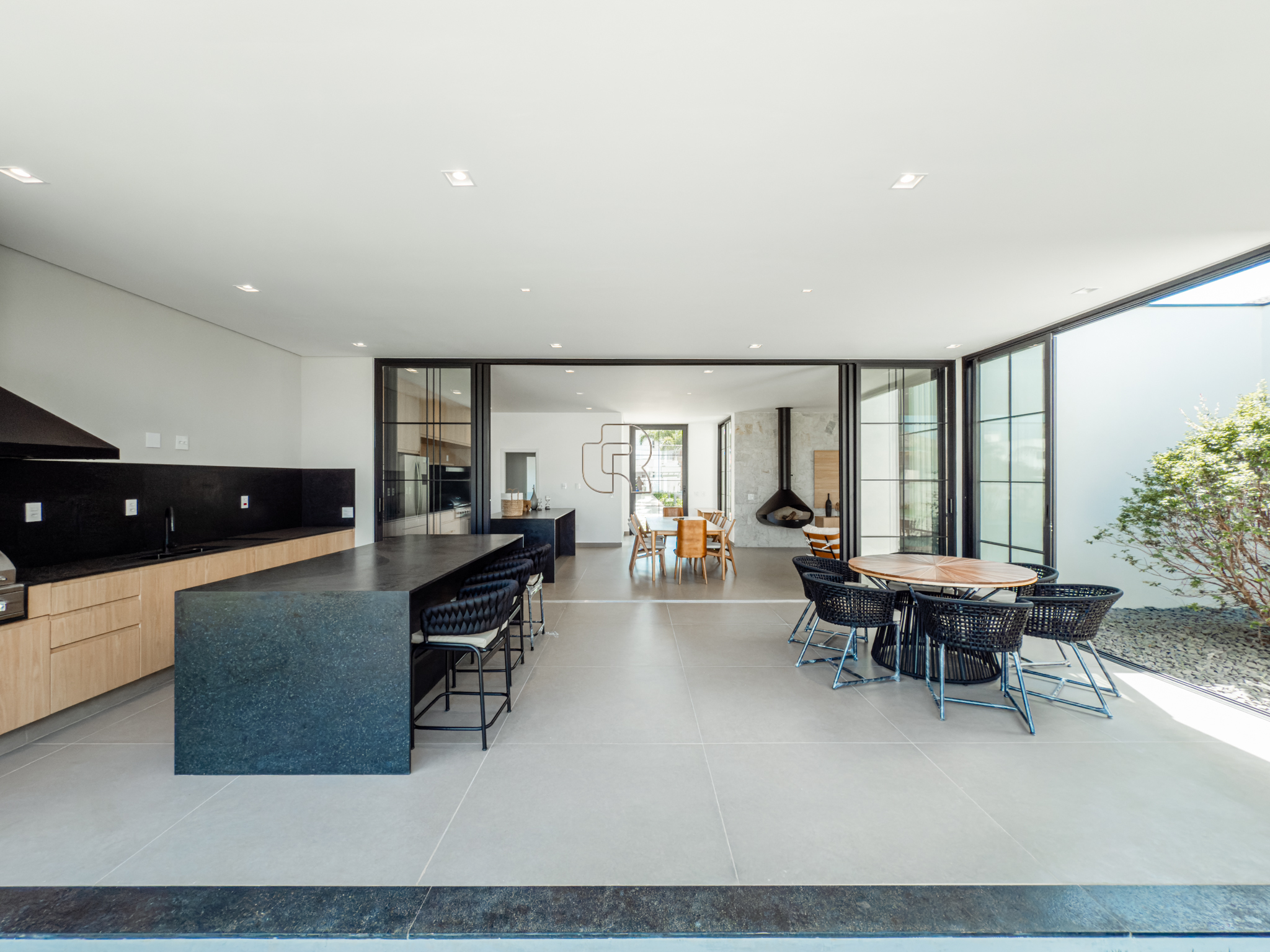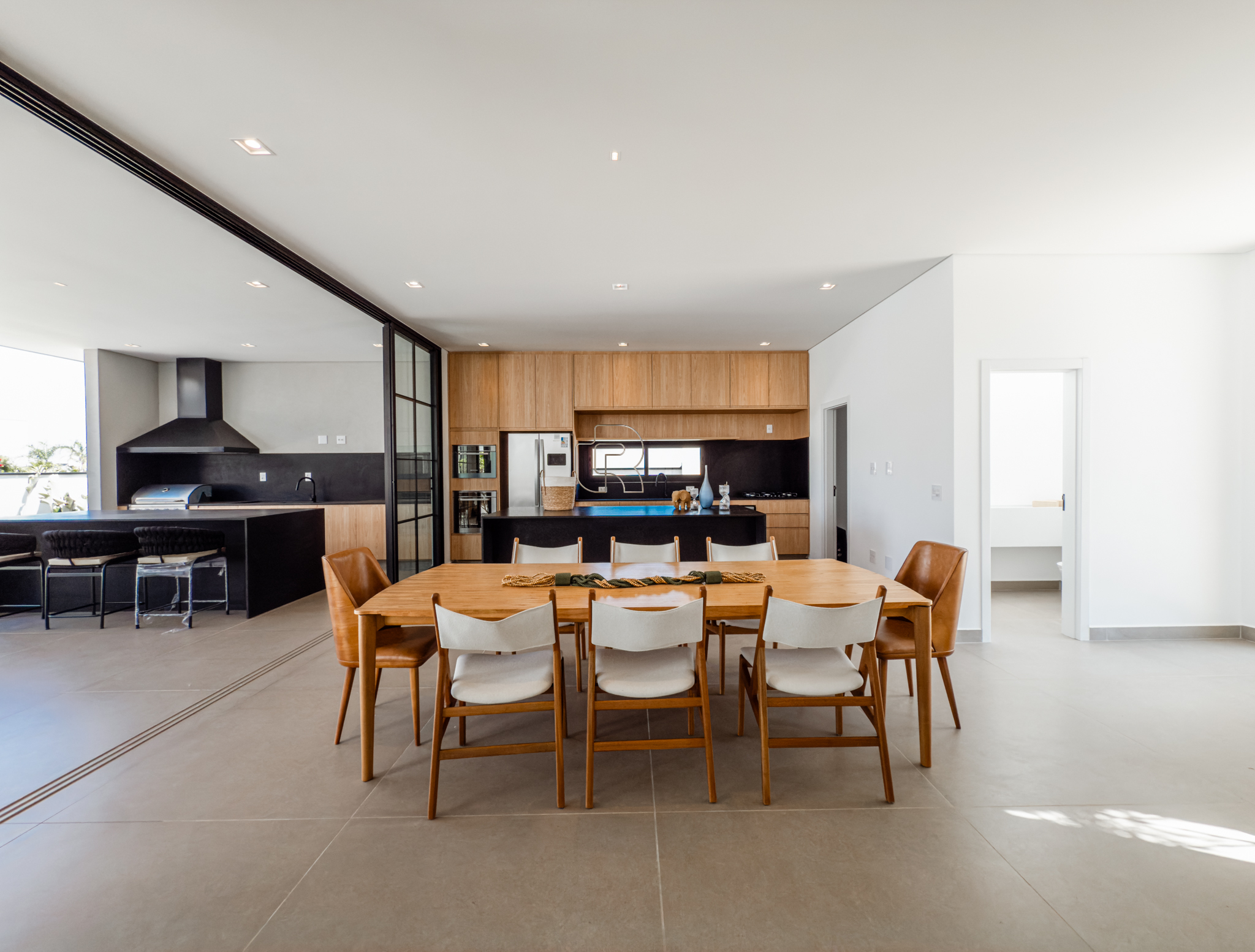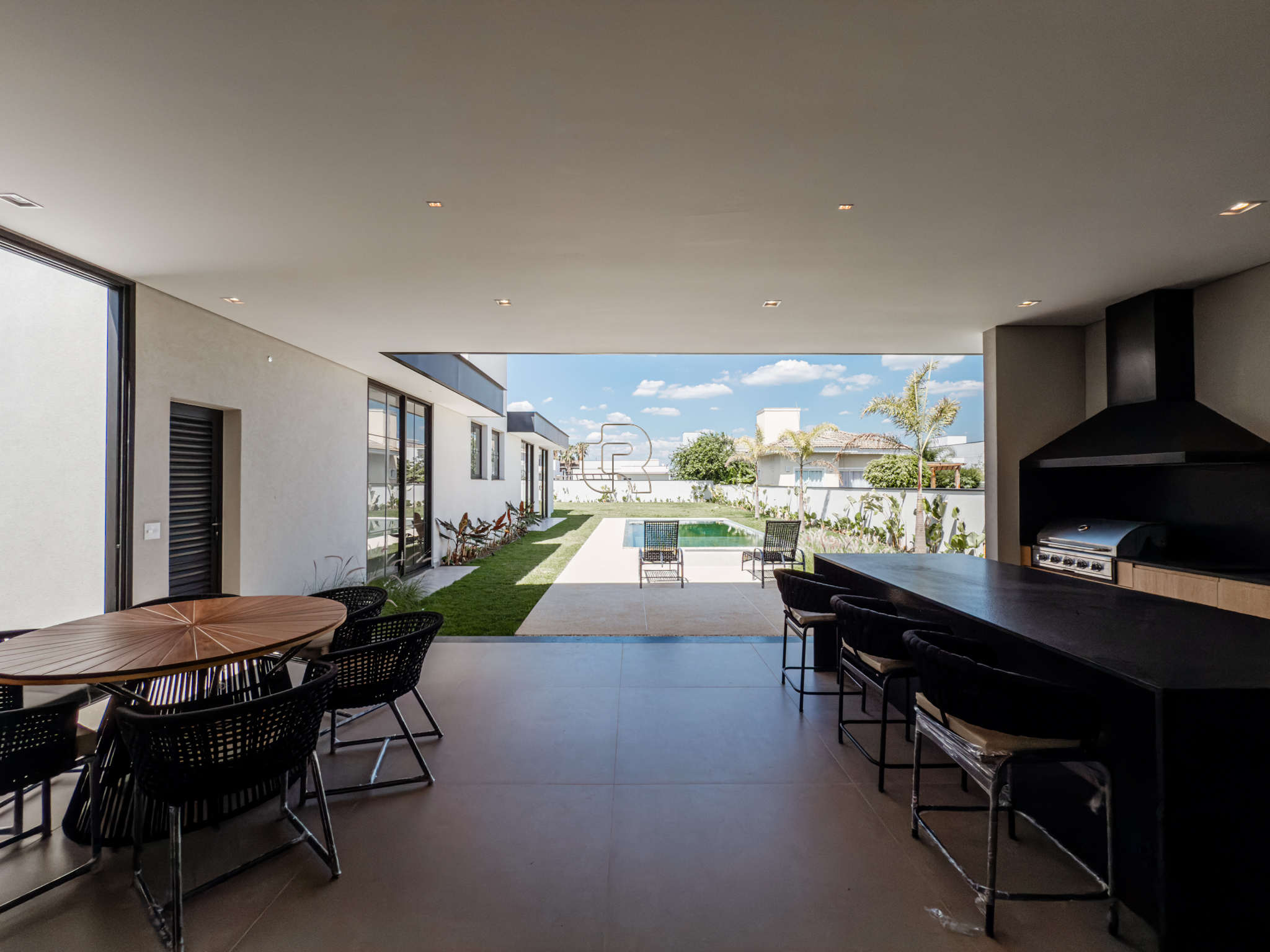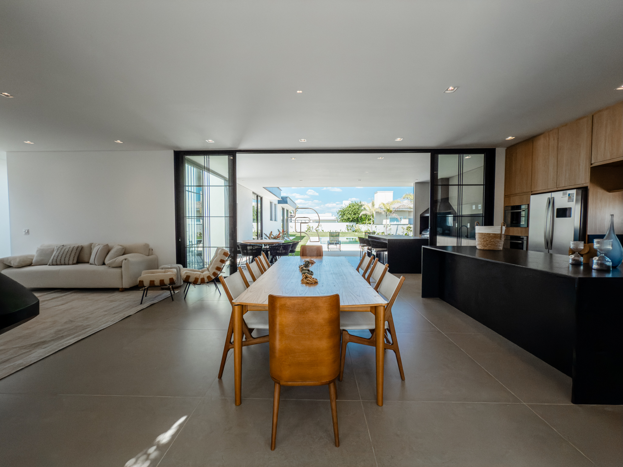 O imóvel apresenta um amplo e elegante espaço de convivência, com salas de estar e jantar integradas e lareira, proporcionando conforto e sofisticação. A cozinha, de conceito moderno, é integrada à área de jantar e dispõe de despensa. A área gourmet com churrasqueira conecta-se à varanda coberta e conta com banheiro exclusivo para a área da piscina, que é aquecida por sistema solar.