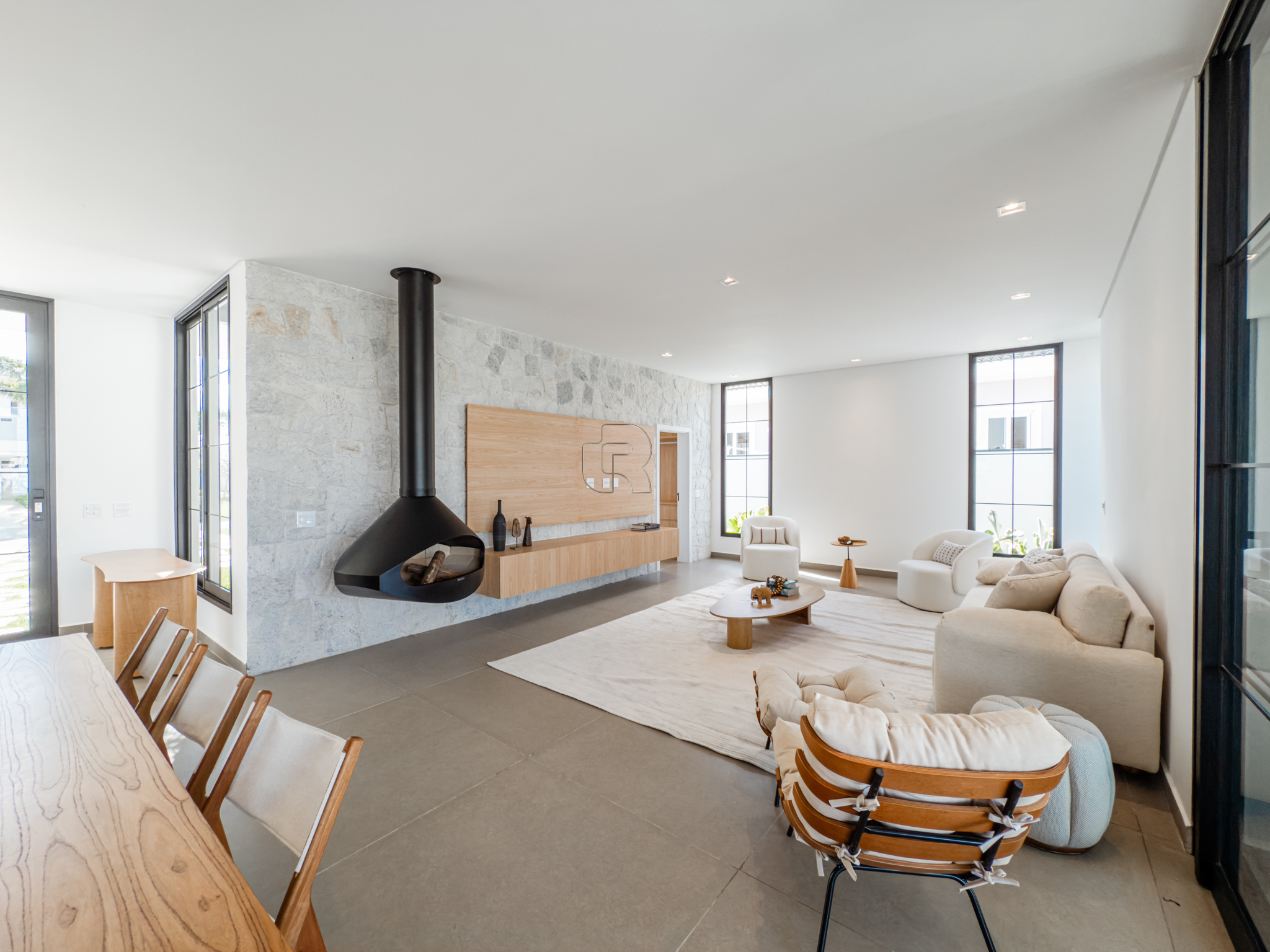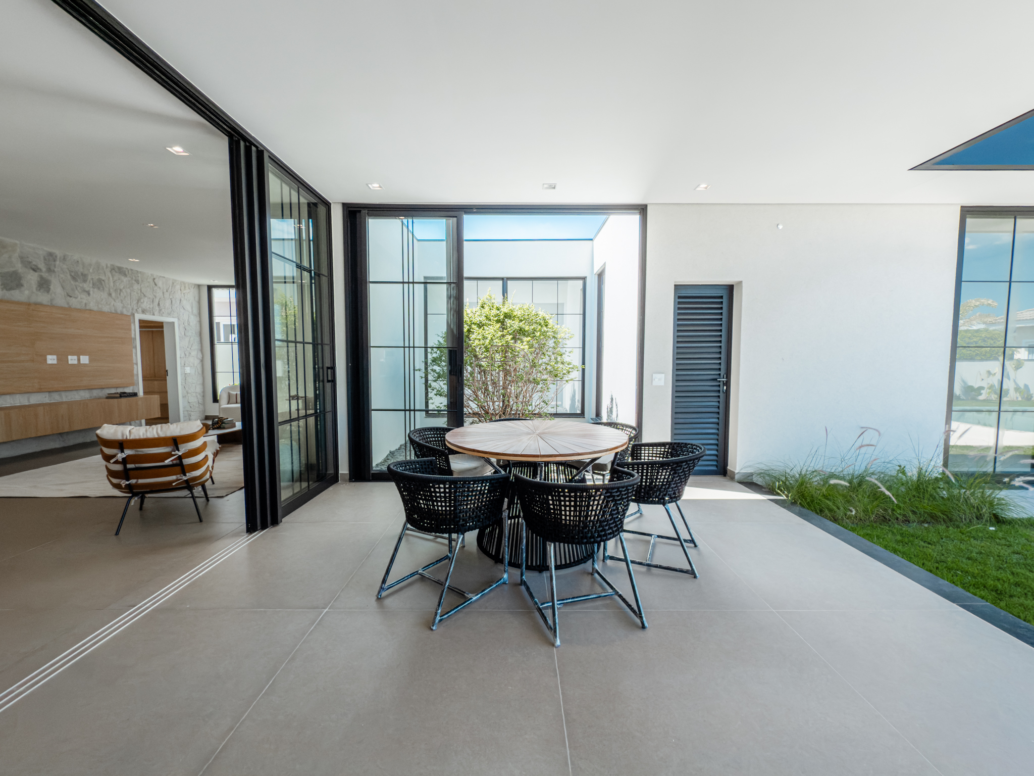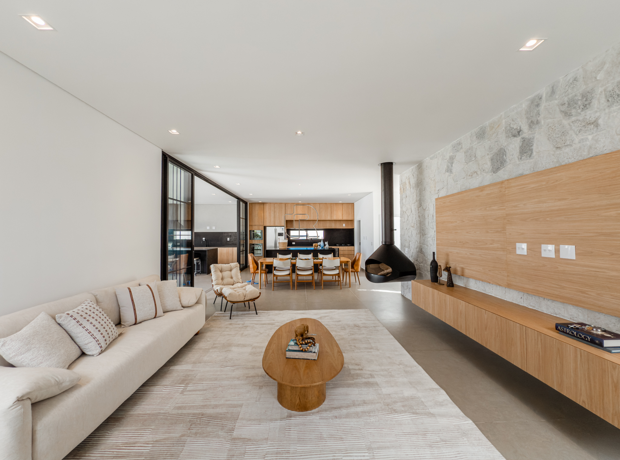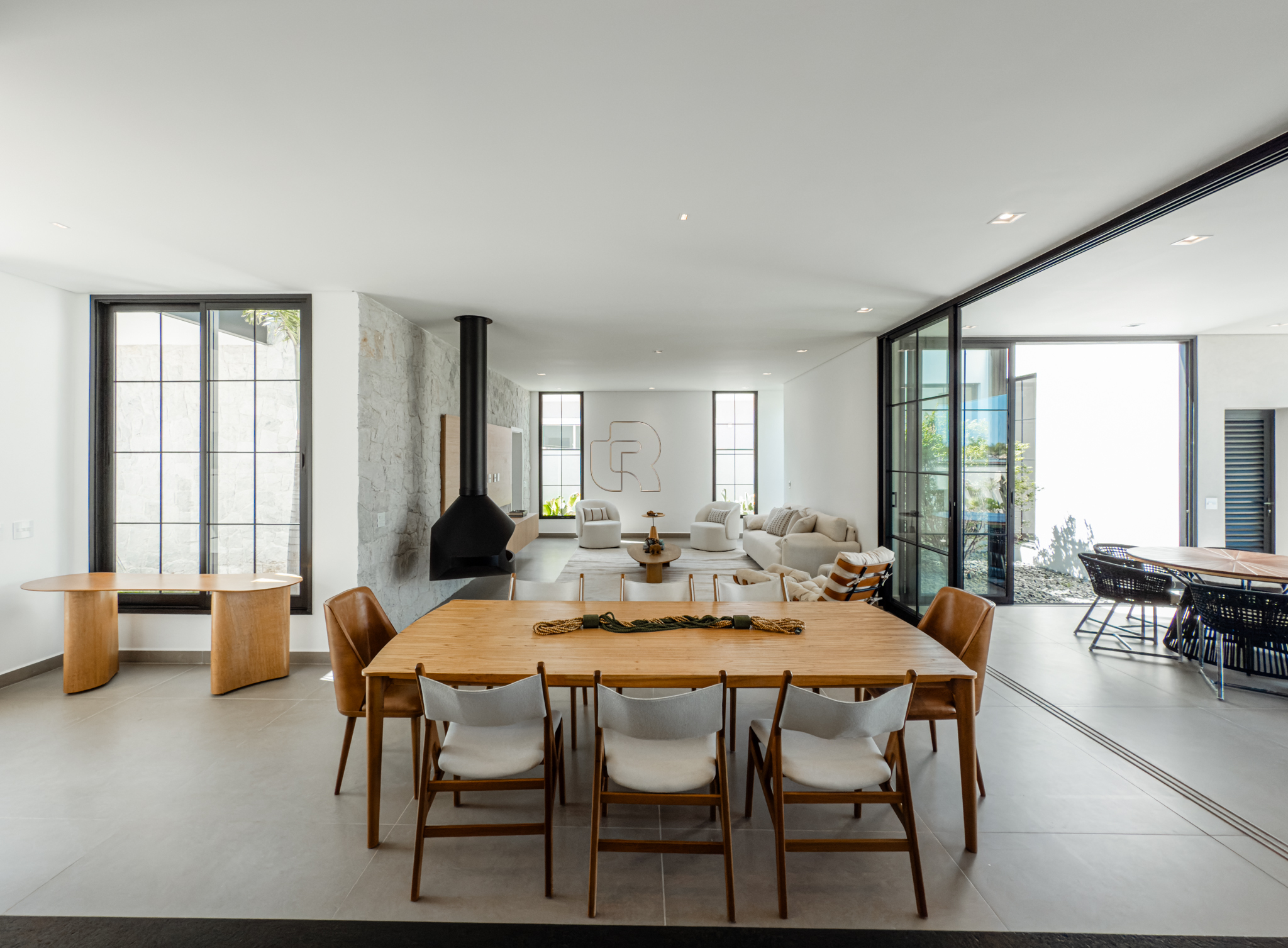 O imóvel apresenta um amplo e elegante espaço de convivência, com salas de estar e jantar integradas e lareira, proporcionando conforto e sofisticação. A cozinha, de conceito moderno, é integrada à área de jantar e dispõe de despensa. A área gourmet com churrasqueira conecta-se à varanda coberta e conta com banheiro exclusivo para a área da piscina, que é aquecida por sistema solar.
