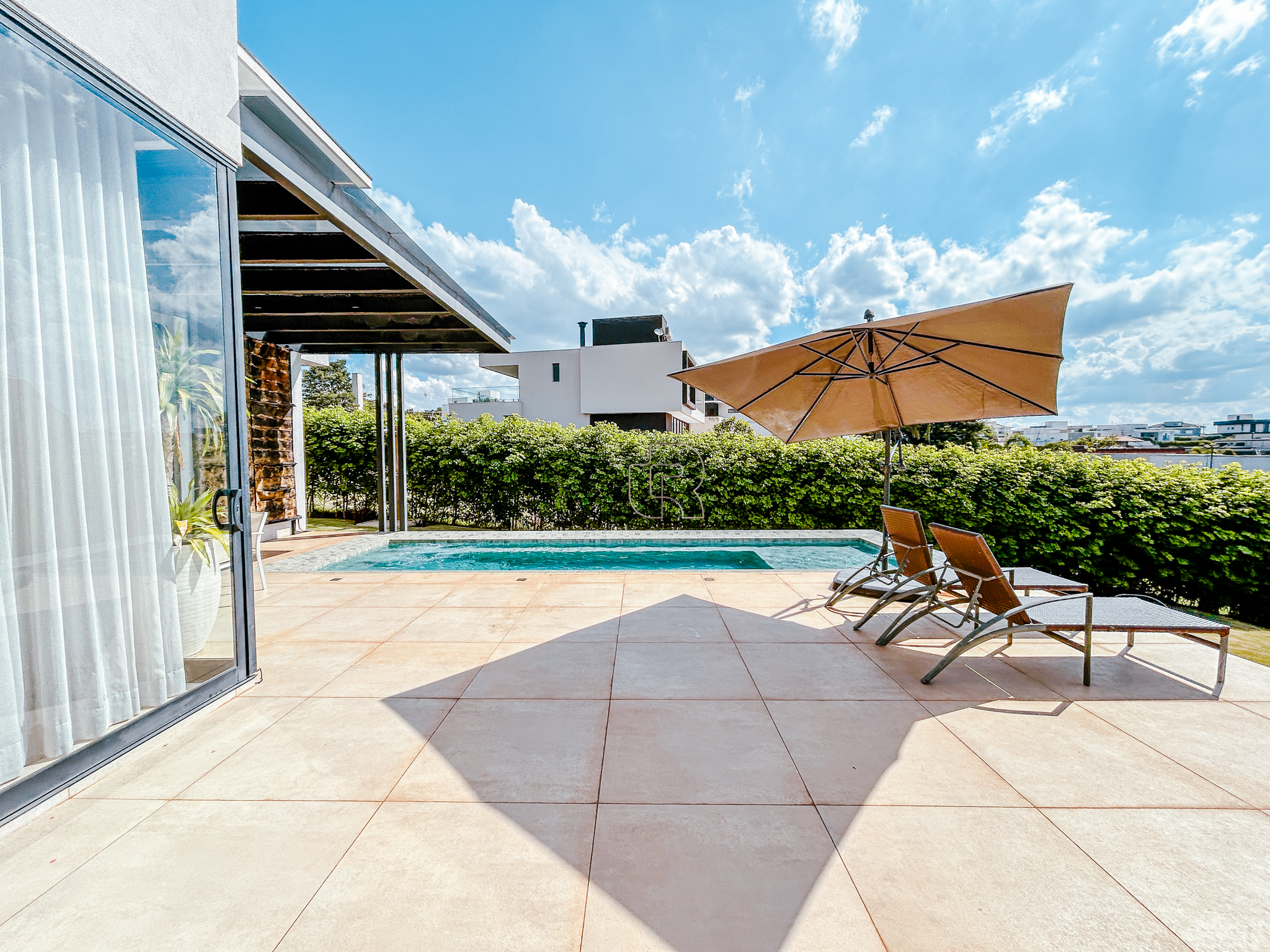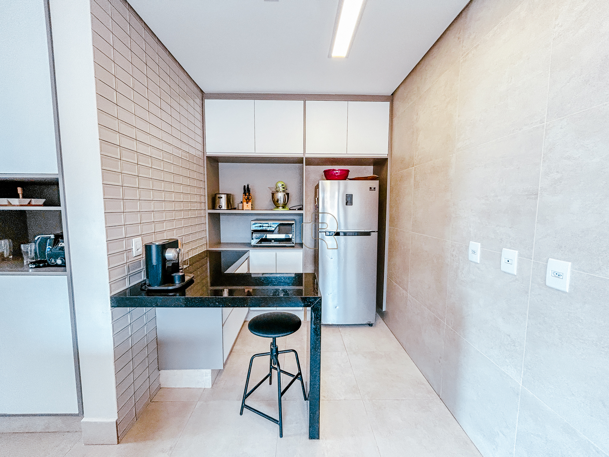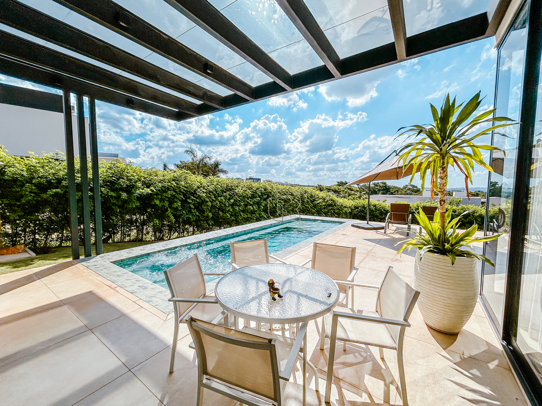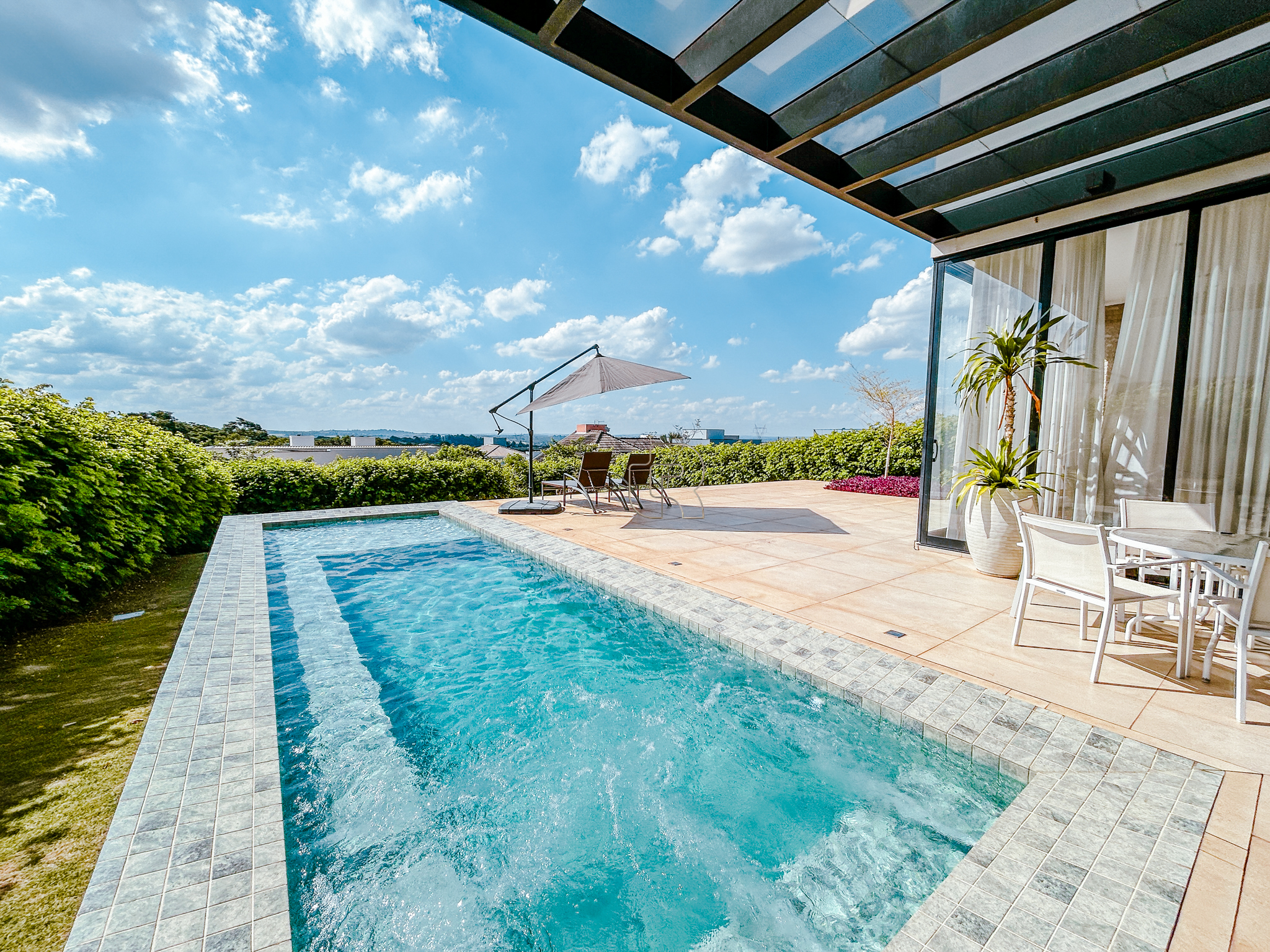A área externa conta com piscina aquecida com hidromassagem, cobertura parcial com pergolado metálico e vidro com controle térmico, além de jardim vertical e banheiro de apoio. A área gourmet é totalmente equipada com cooktop de indução, forno Electrolux importado e churrasqueira a gás embutida, complementada por despensa espaçosa, cozinha e lavanderia com móveis planejados.