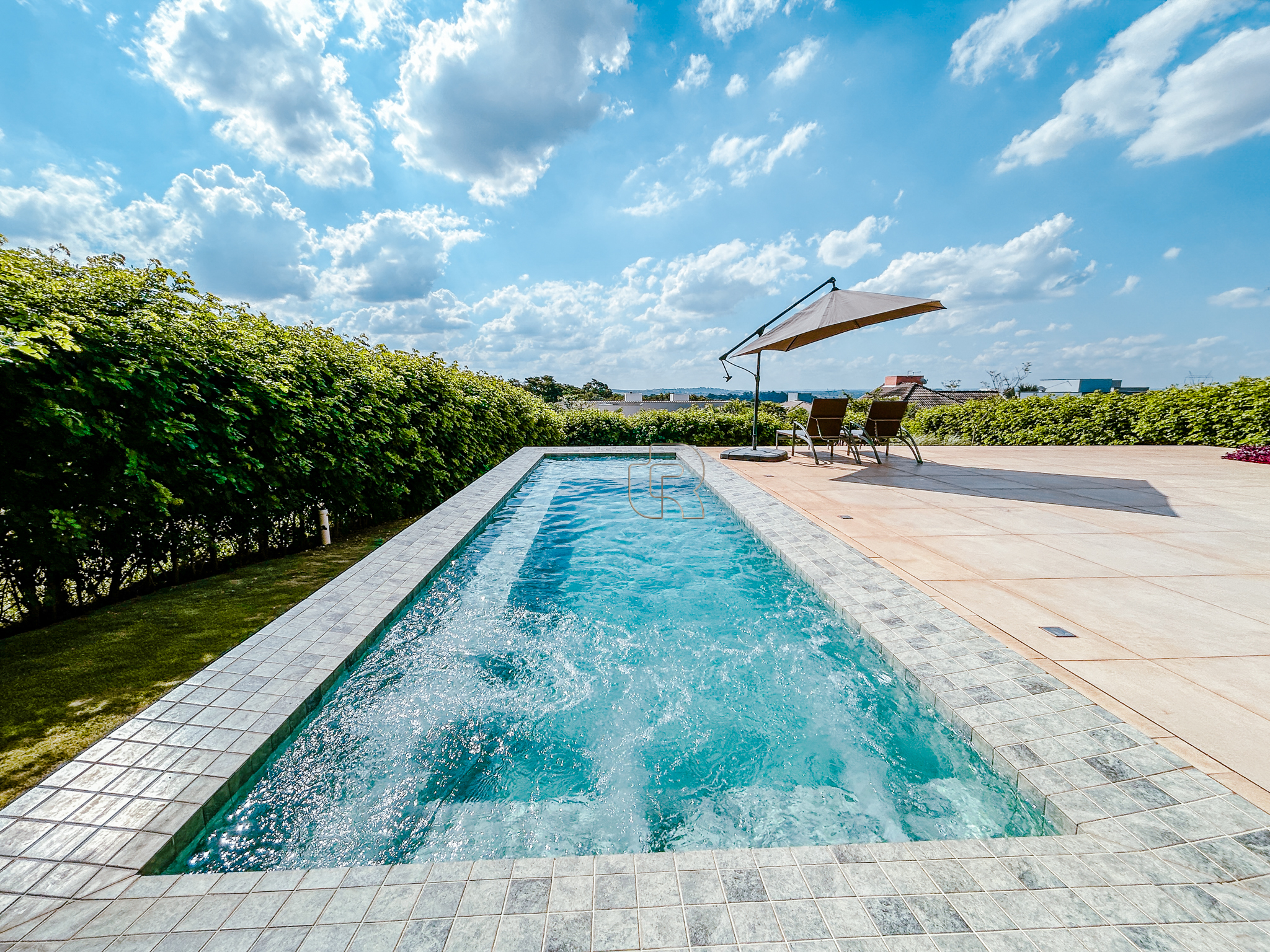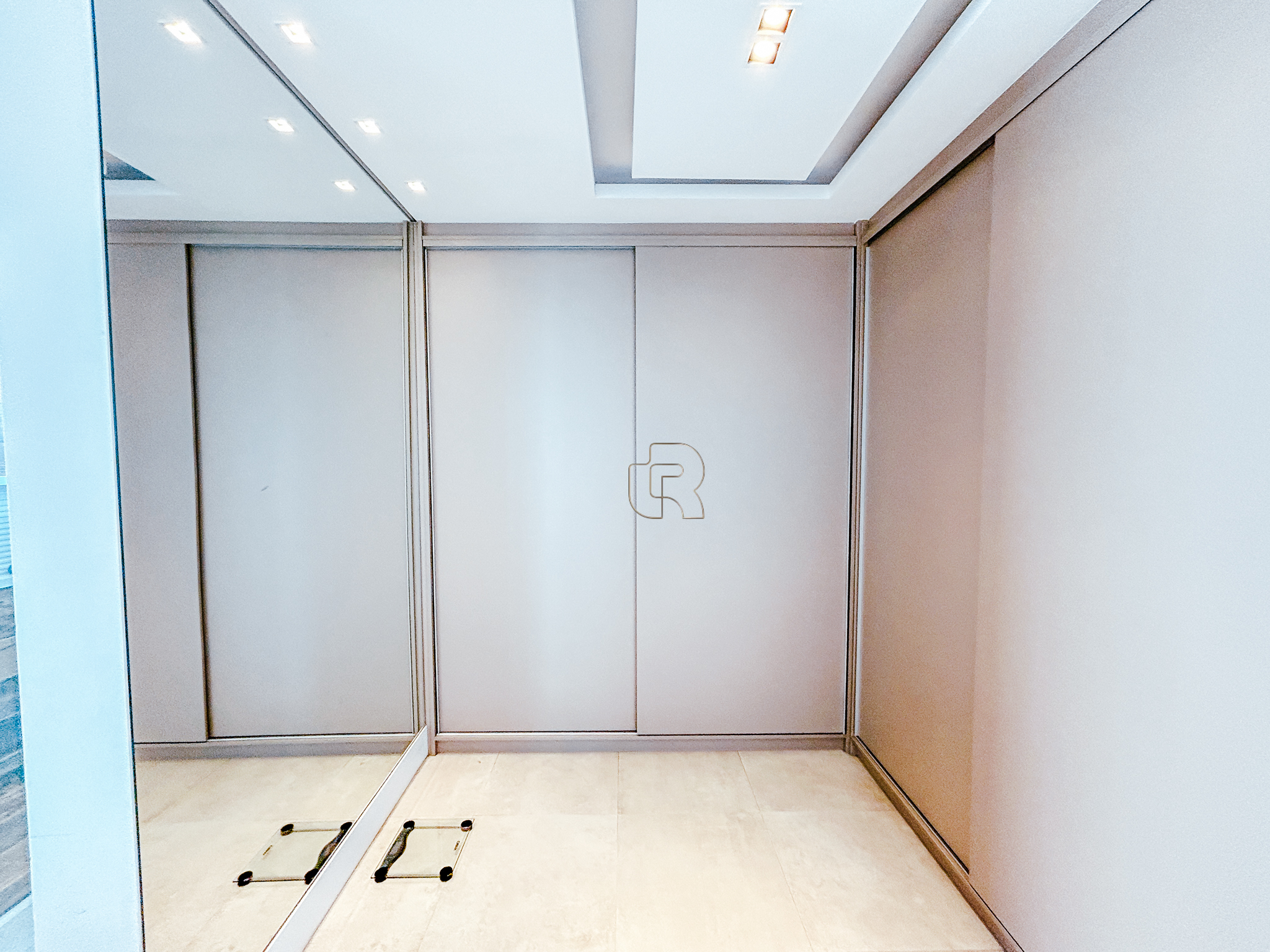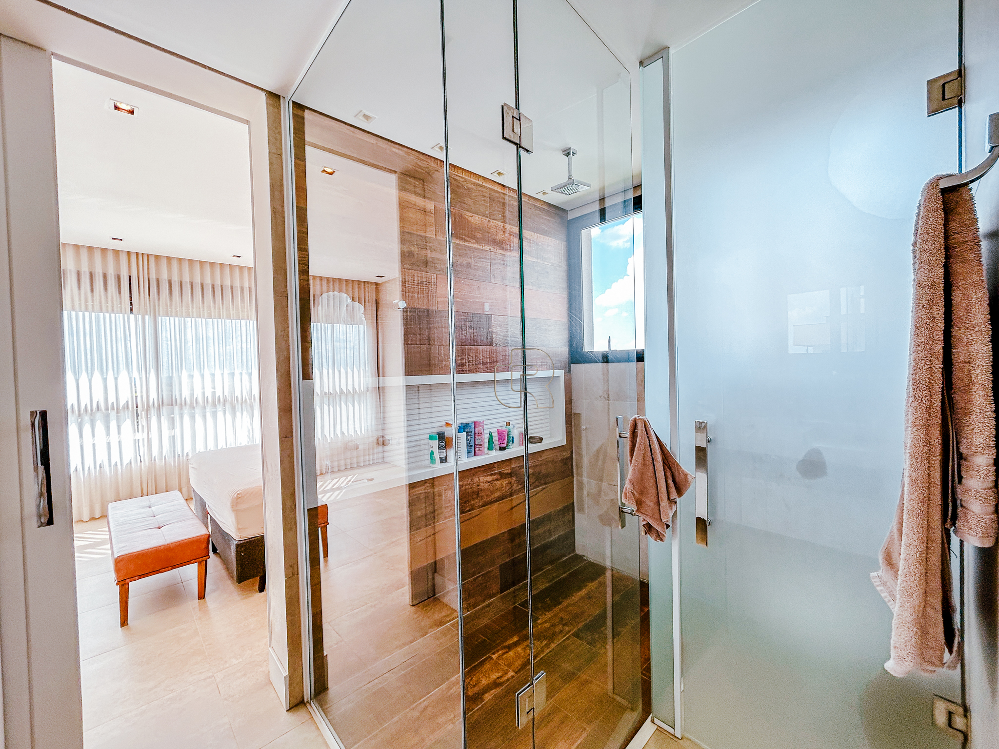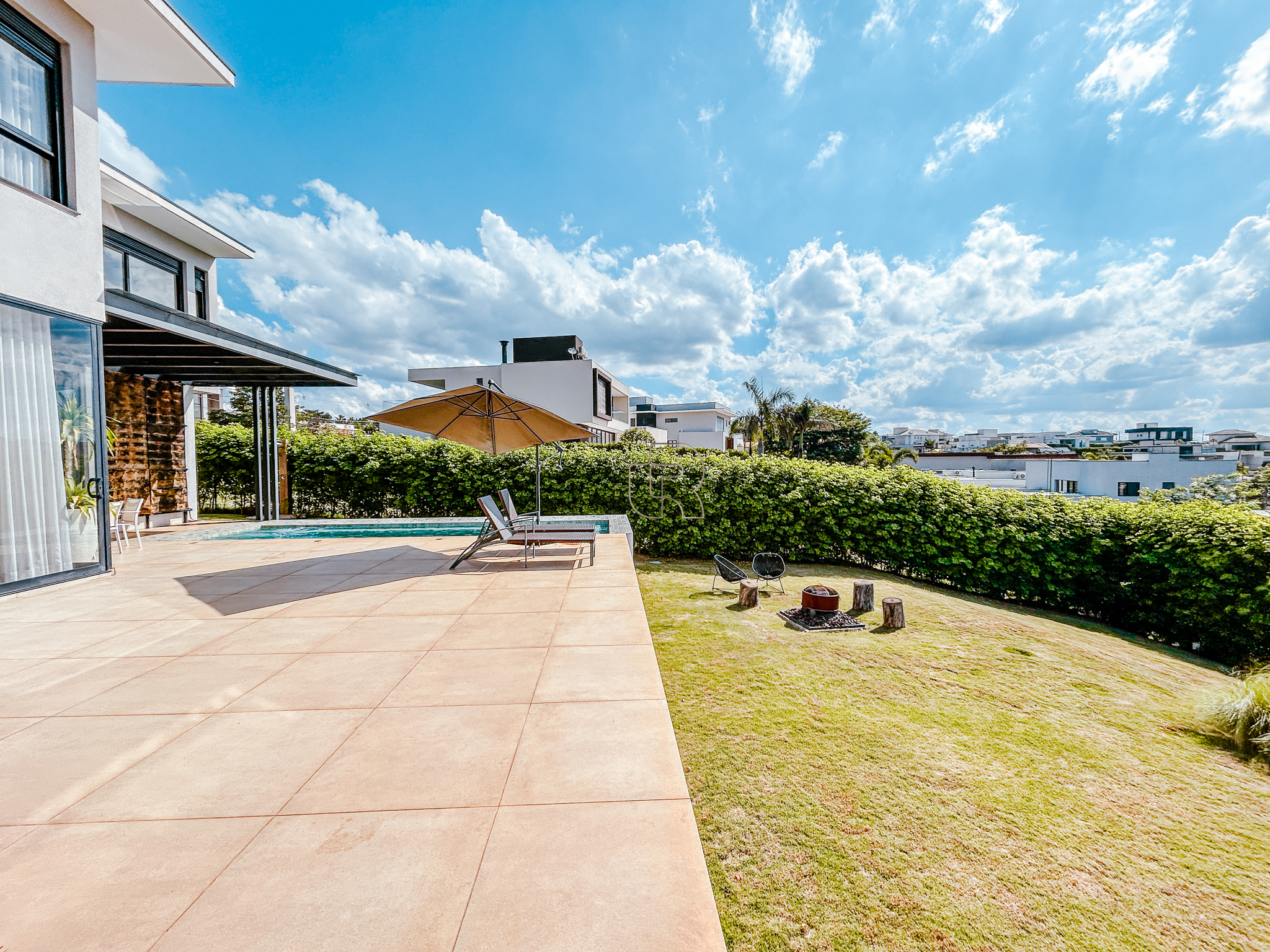 A área externa conta com piscina aquecida com hidromassagem, cobertura parcial com pergolado metálico e vidro com controle térmico, além de jardim vertical e banheiro de apoio. A área gourmet é totalmente equipada com cooktop de indução, forno Electrolux importado e churrasqueira a gás embutida, complementada por despensa espaçosa, cozinha e lavanderia com móveis planejados.