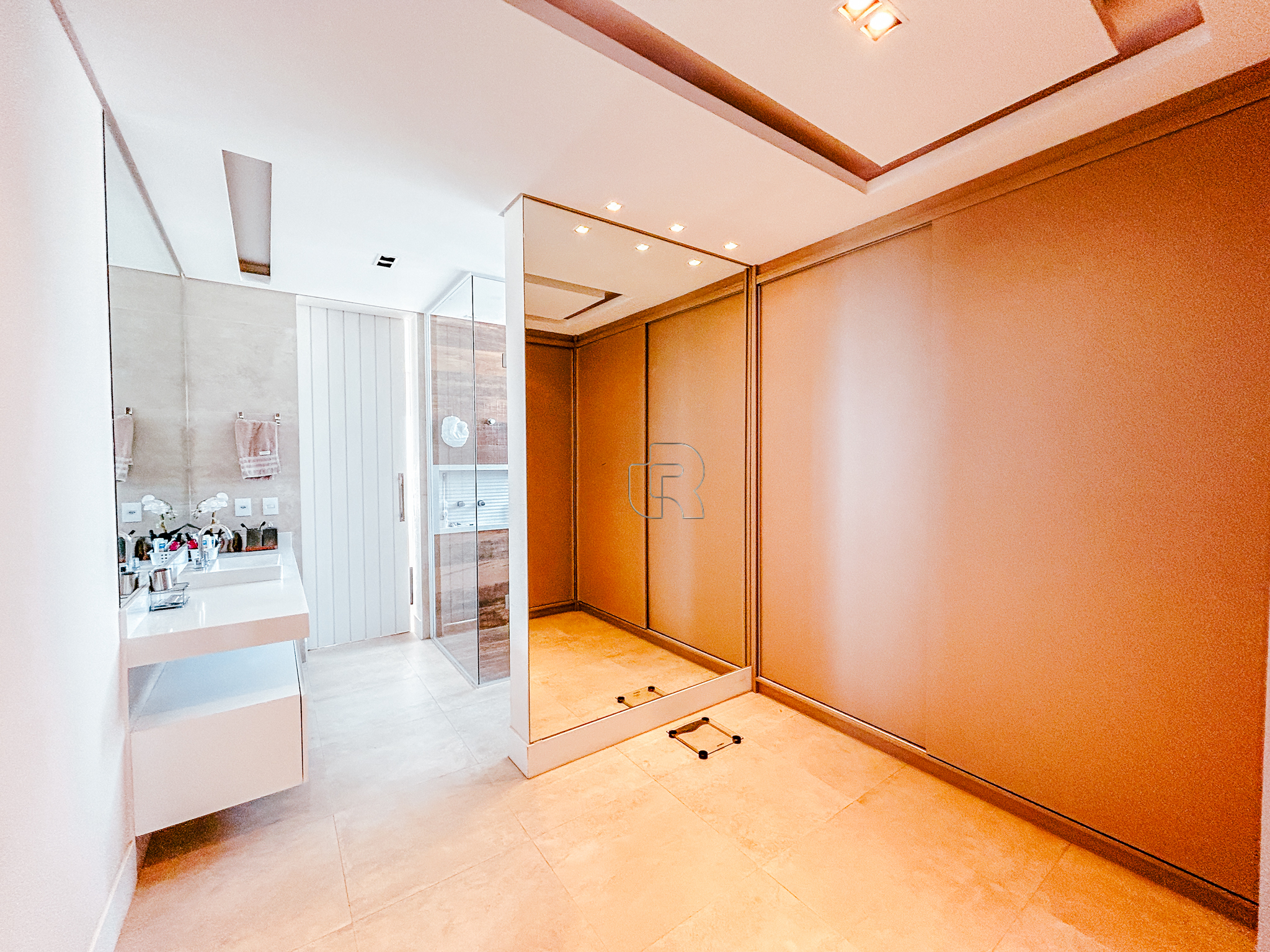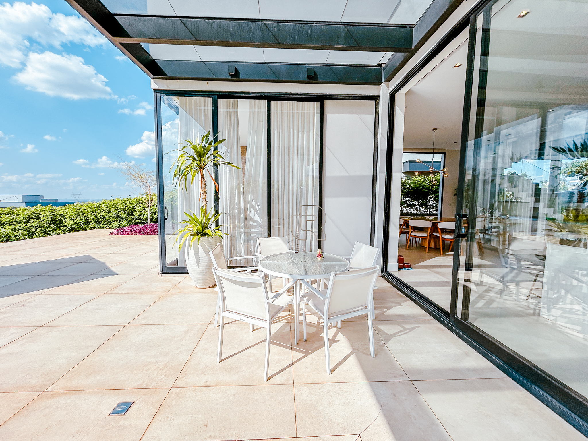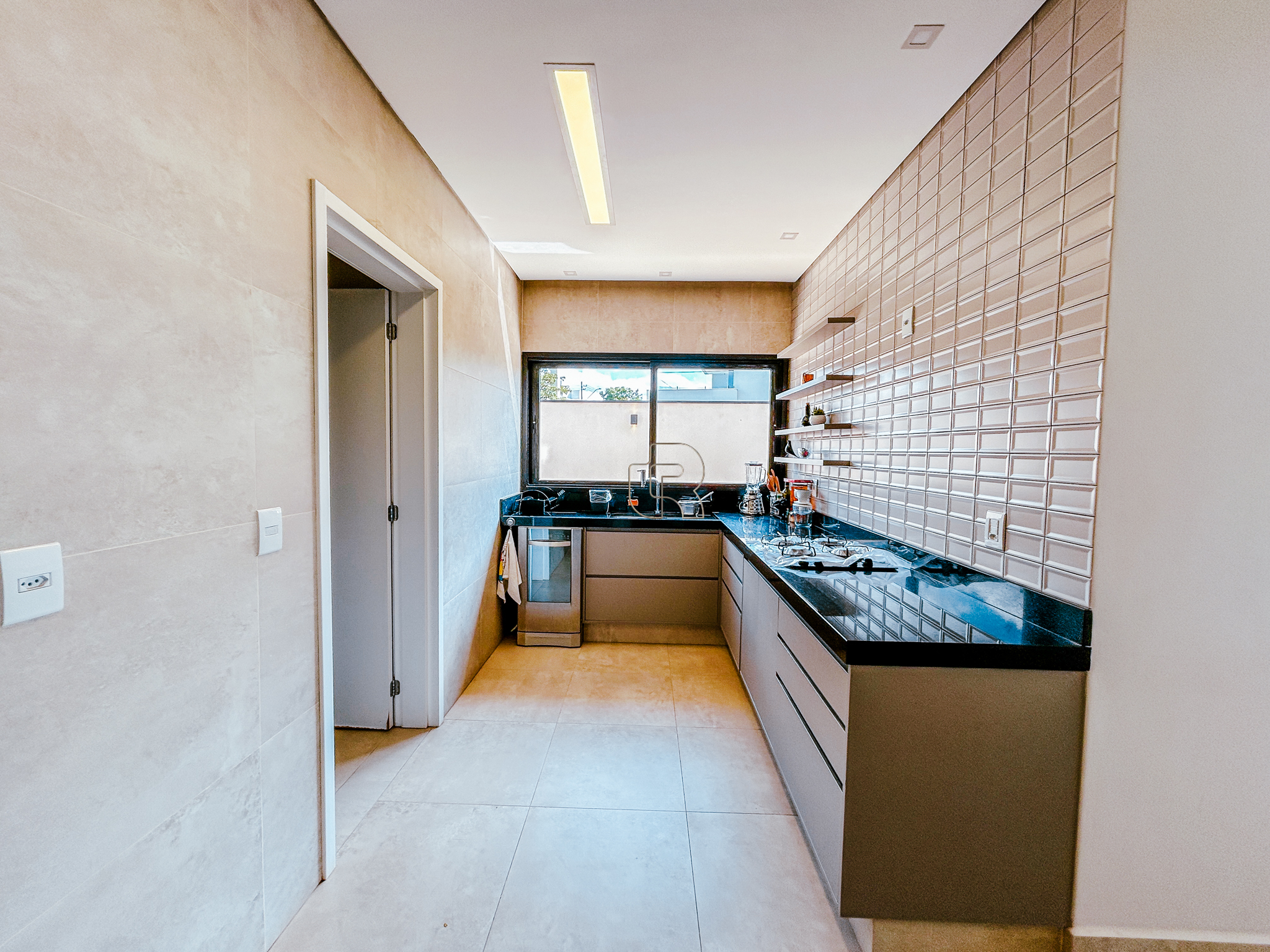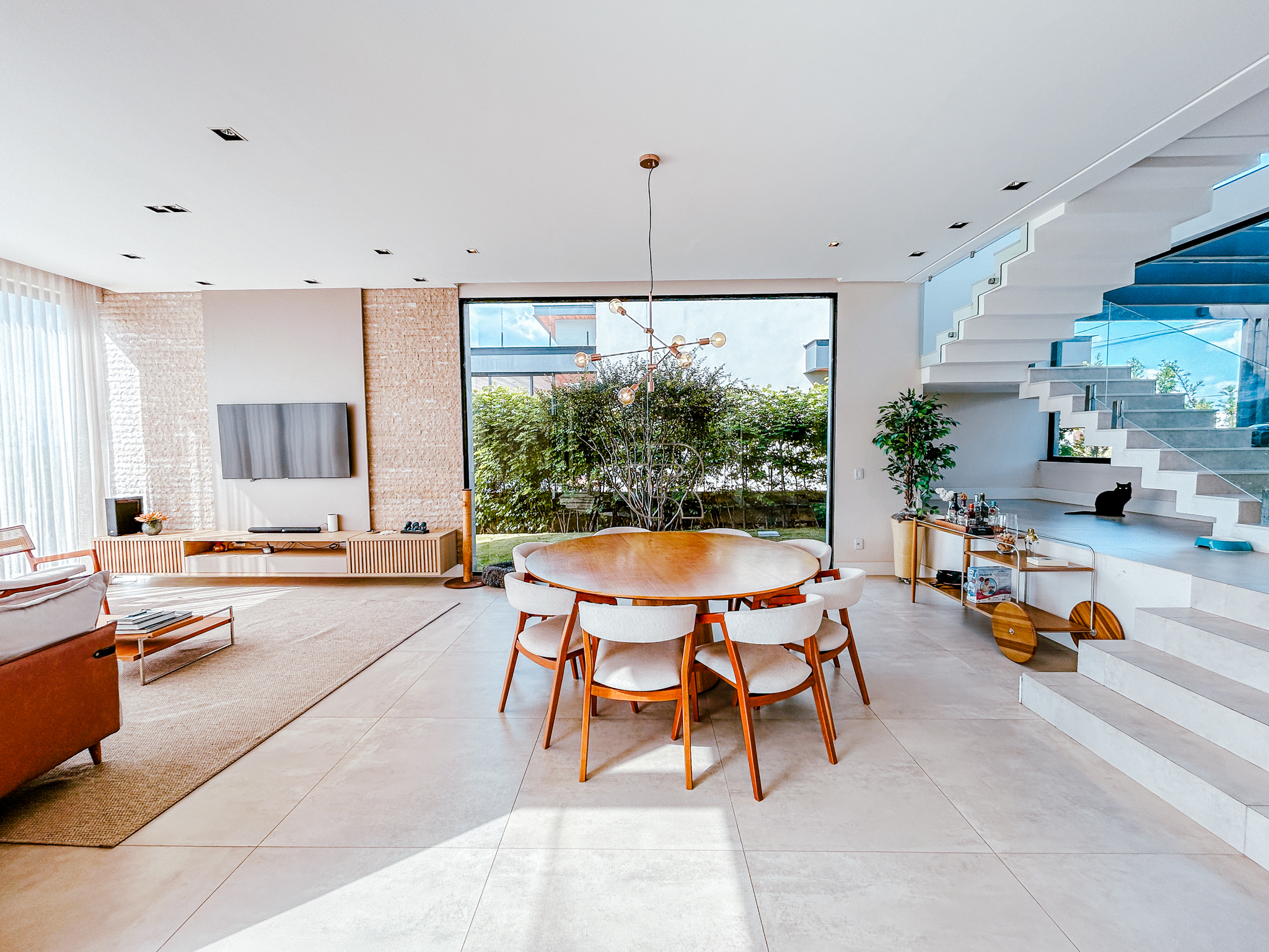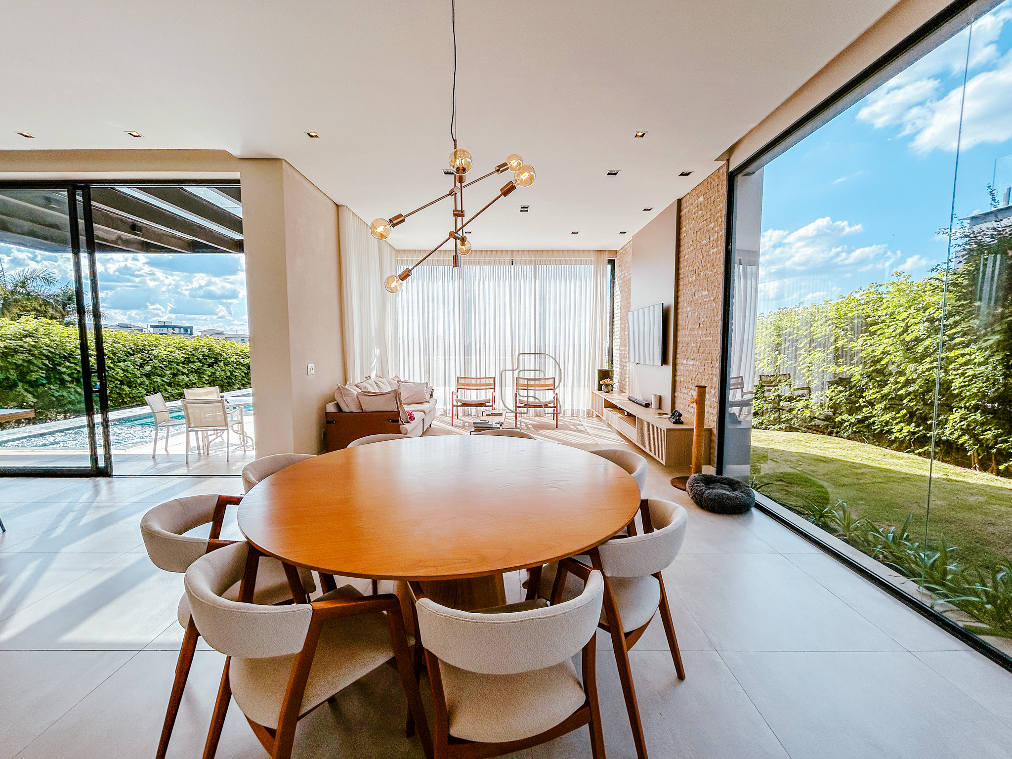 Essa residência dispõe de quatro suítes, sendo três completas, com móveis planejados da IGAPÓ e ar-condicionado. Os ambientes sociais são integrados, reunindo salas de TV, estar e jantar à área gourmet, criando um amplo e aconchegante espaço de convivência.