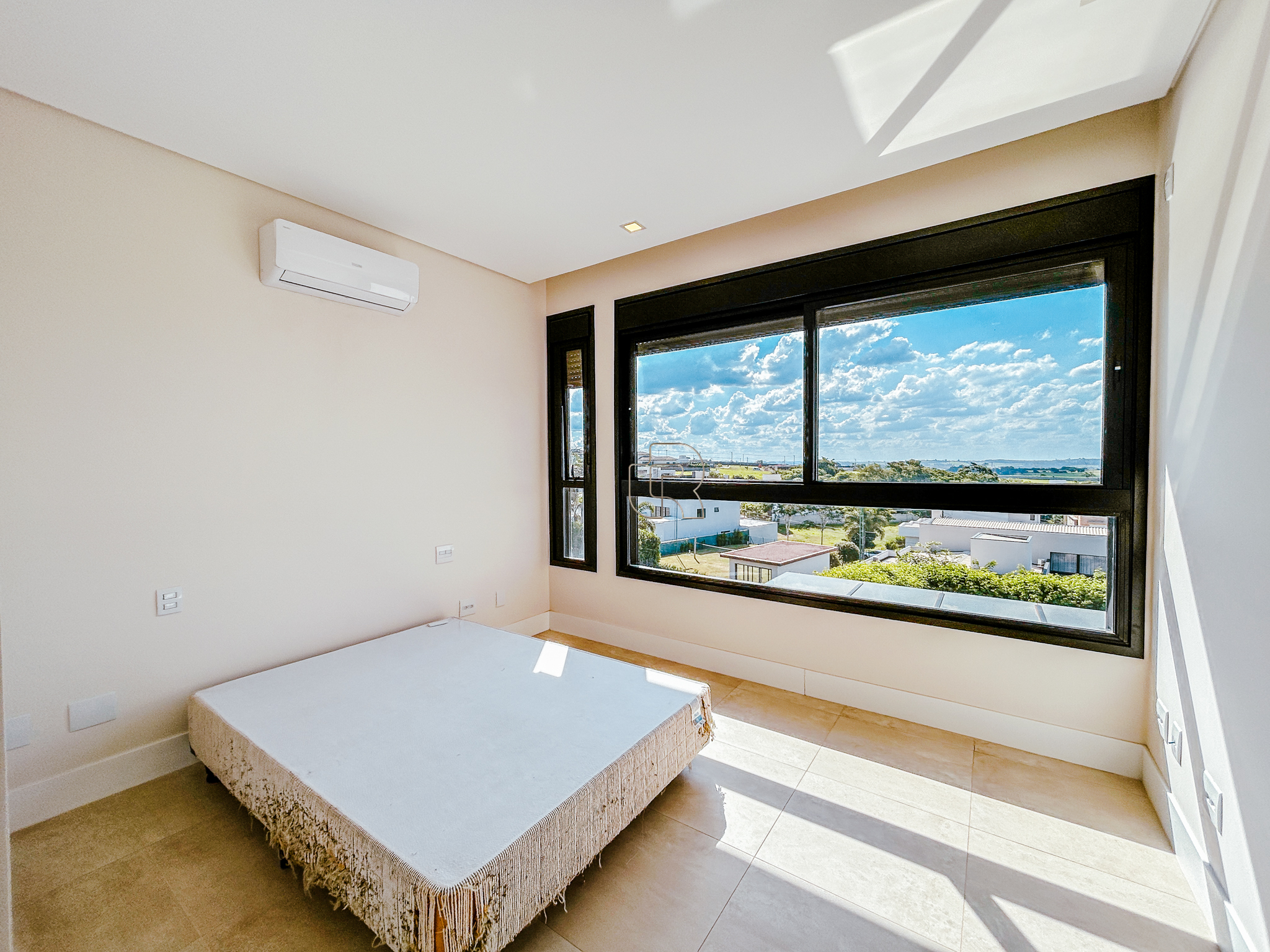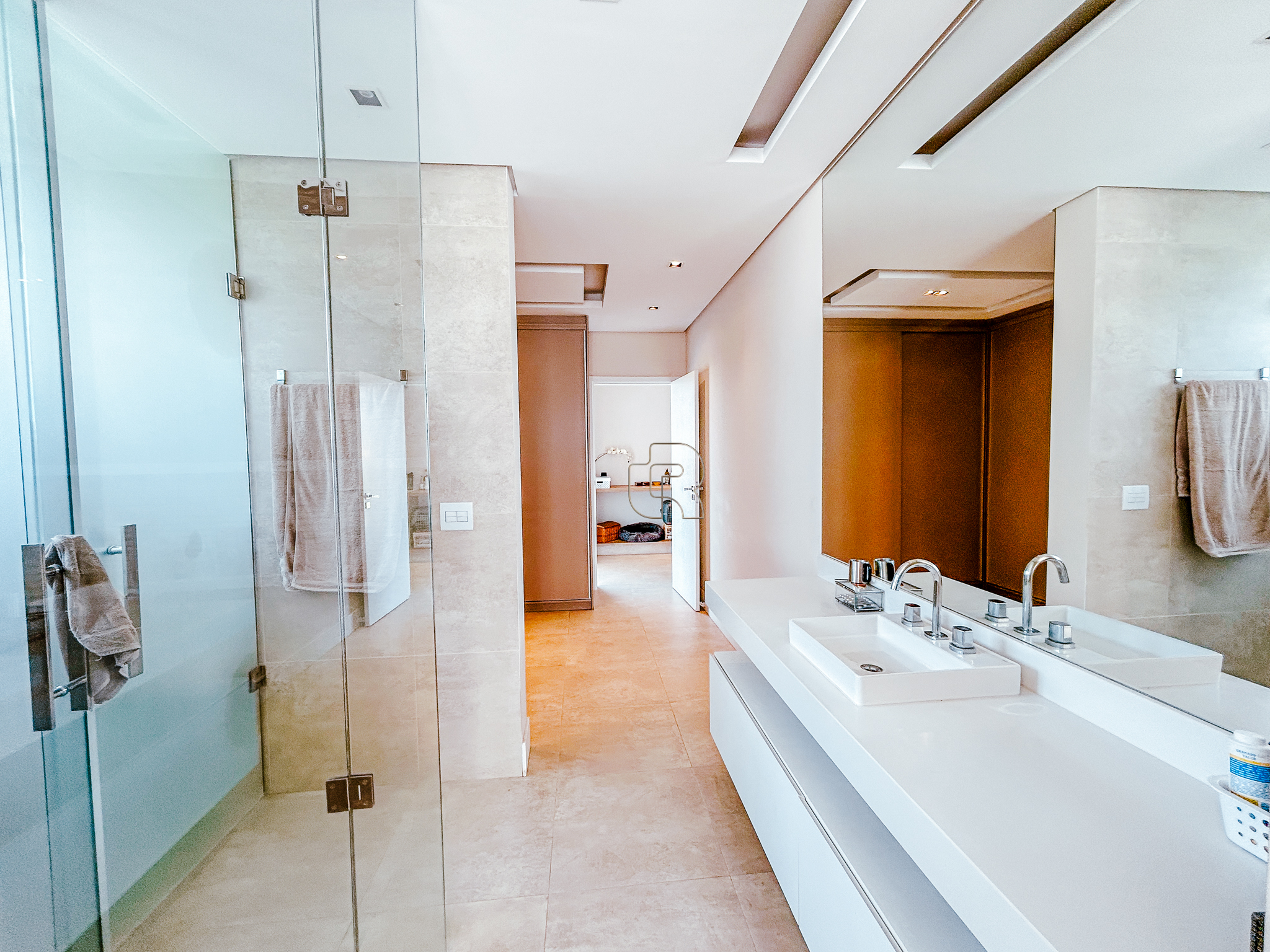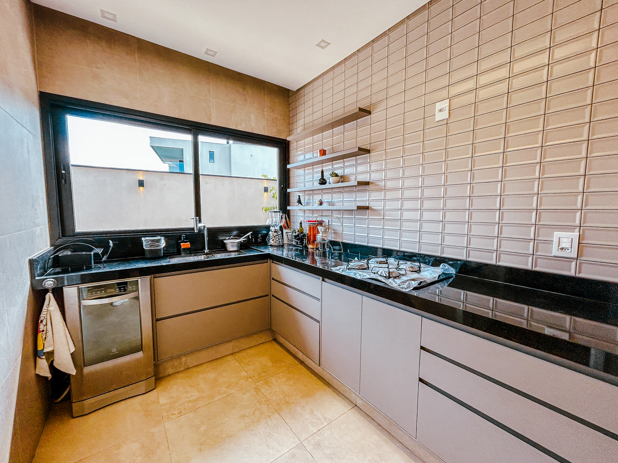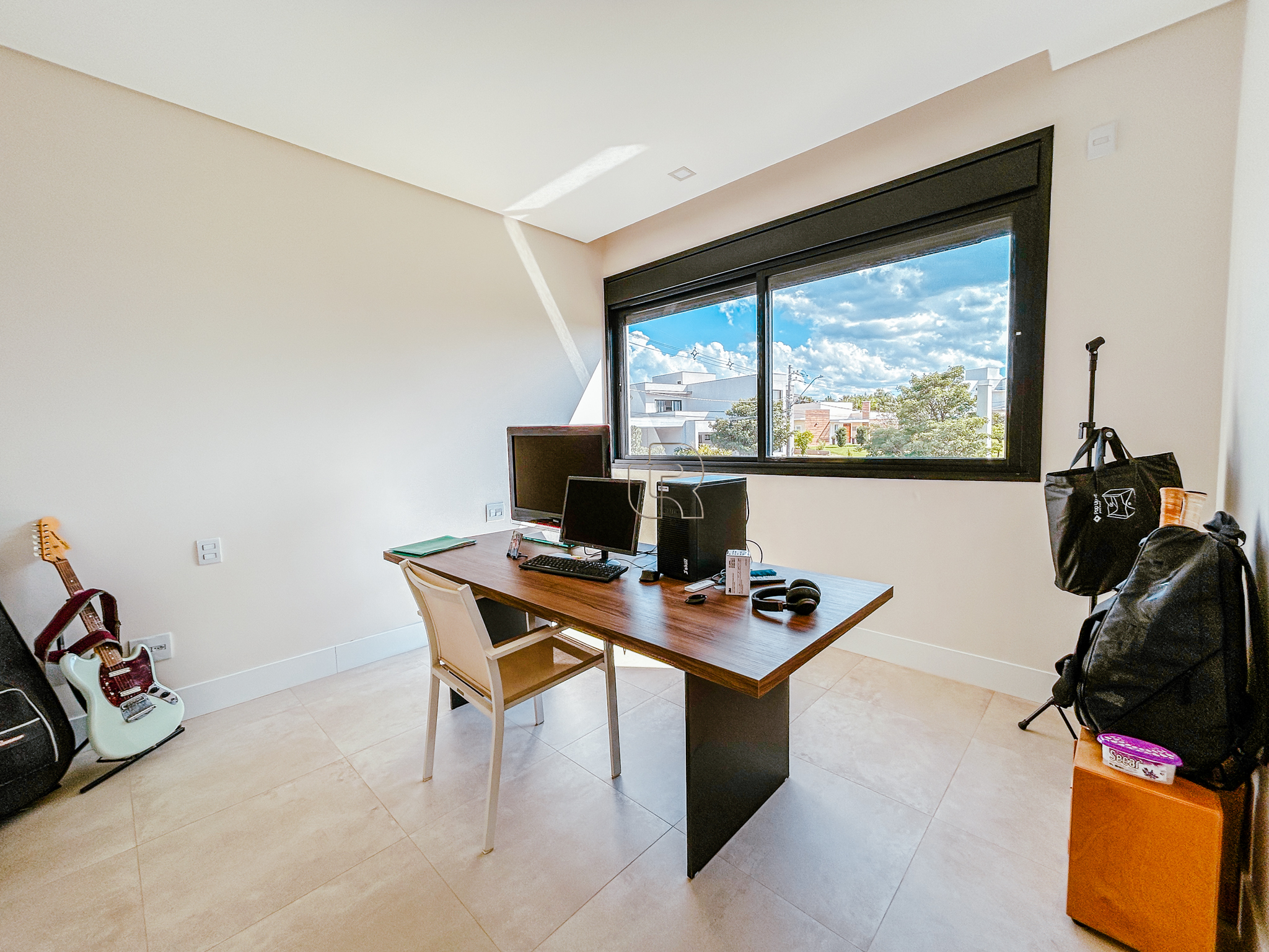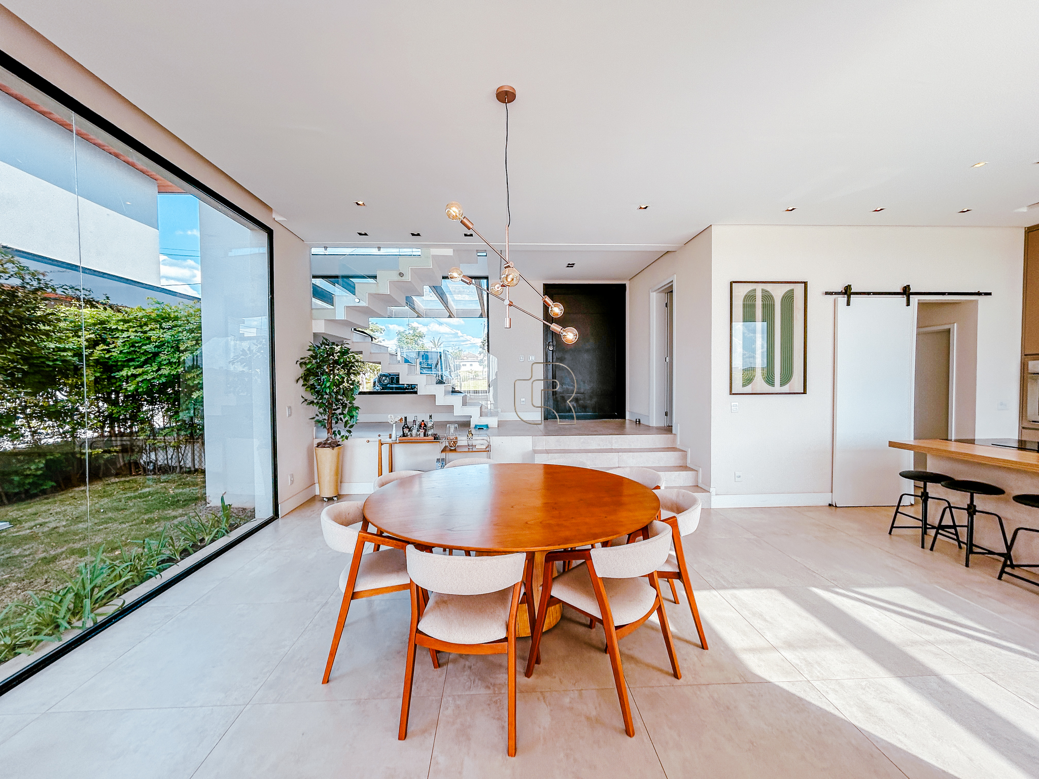 Essa residência dispõe de quatro suítes, sendo três completas, com móveis planejados da IGAPÓ e ar-condicionado. Os ambientes sociais são integrados, reunindo salas de TV, estar e jantar à área gourmet, criando um amplo e aconchegante espaço de convivência.