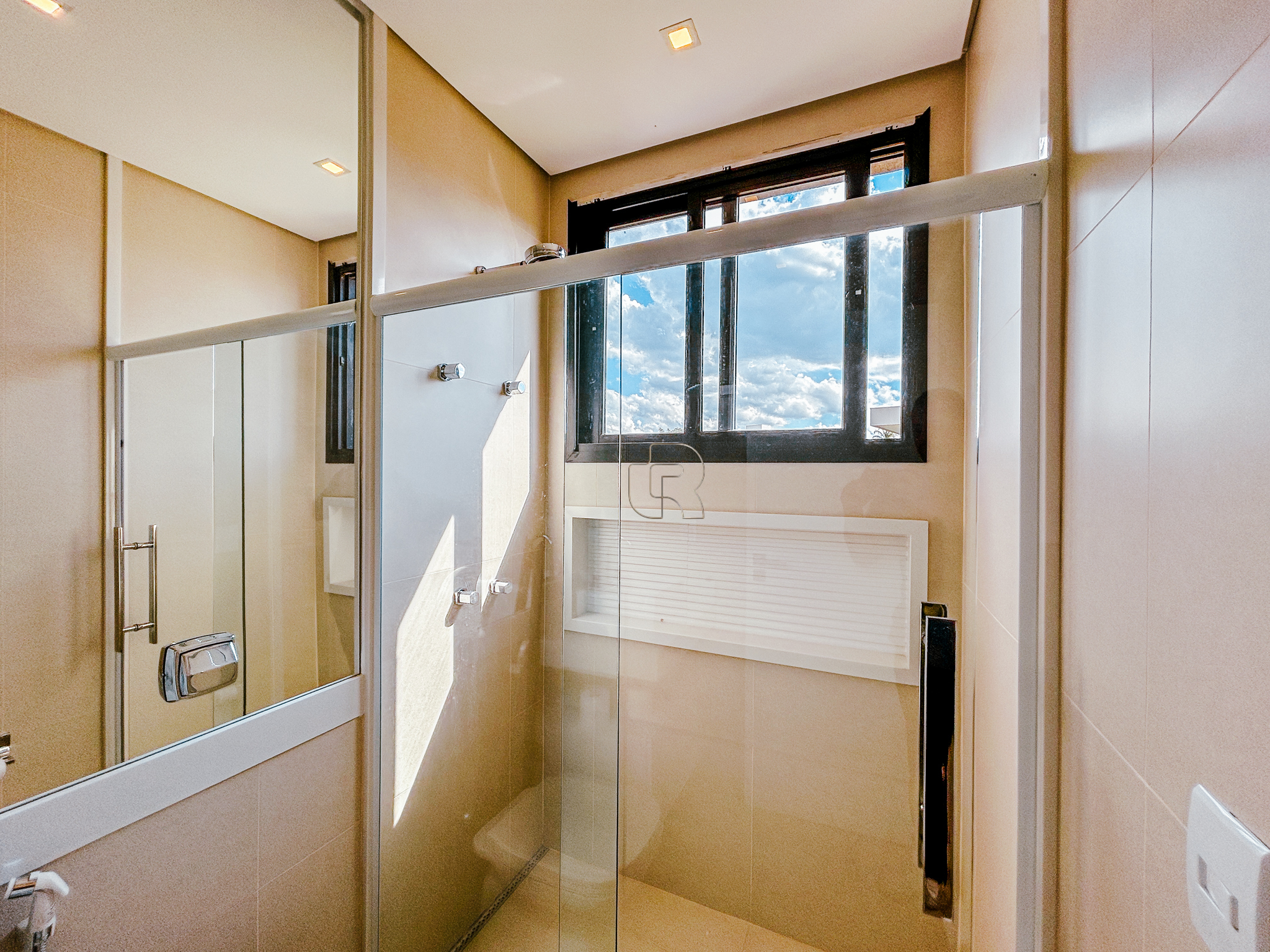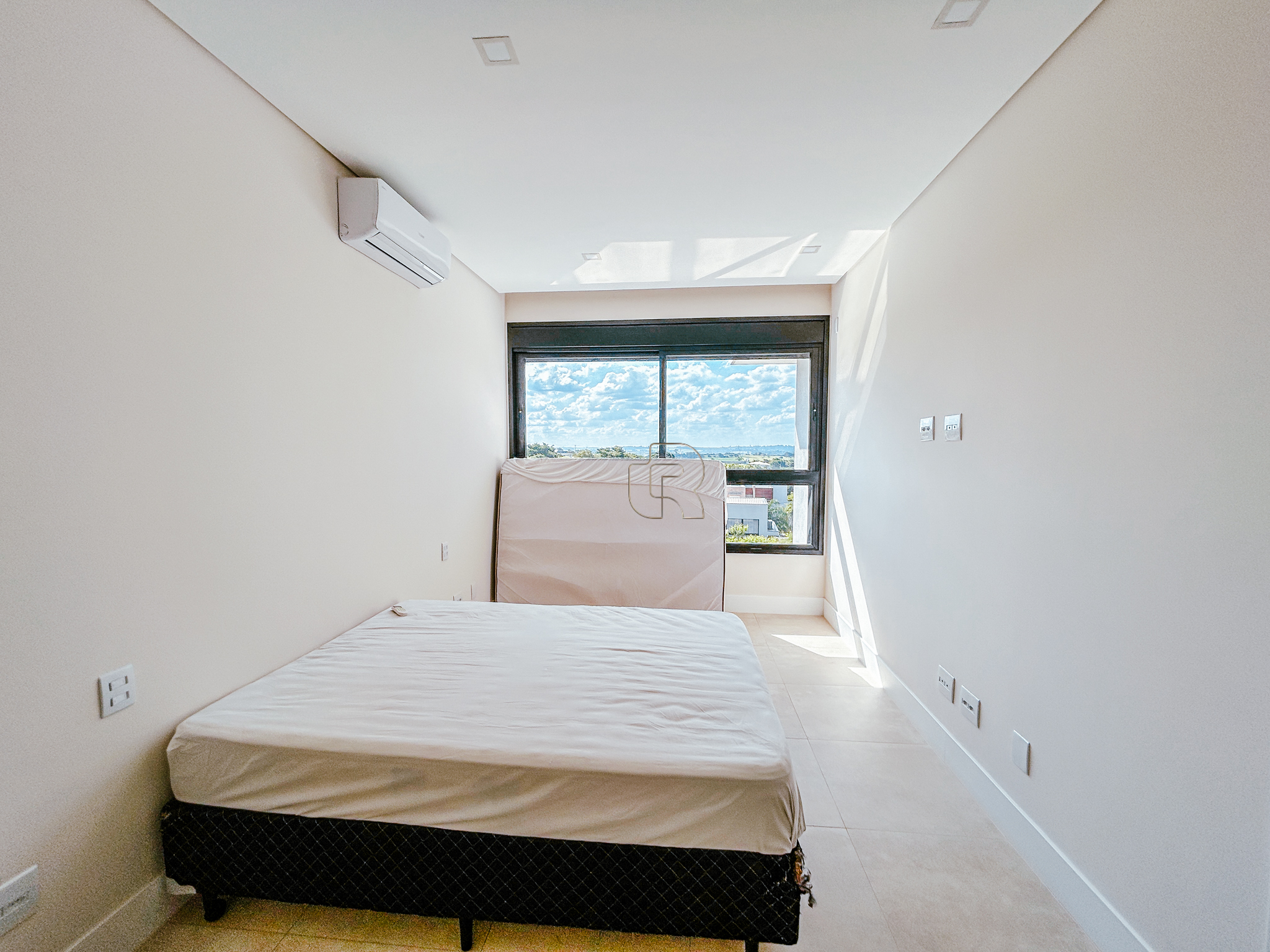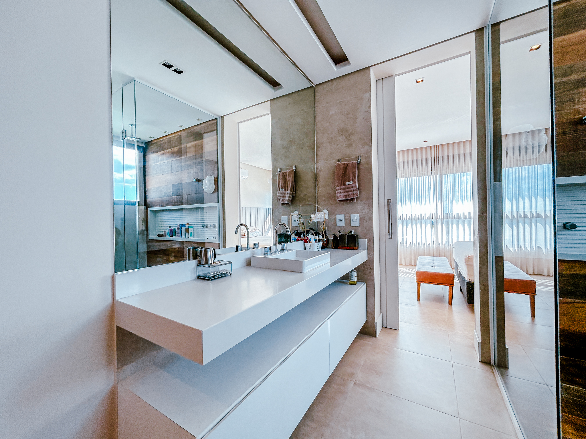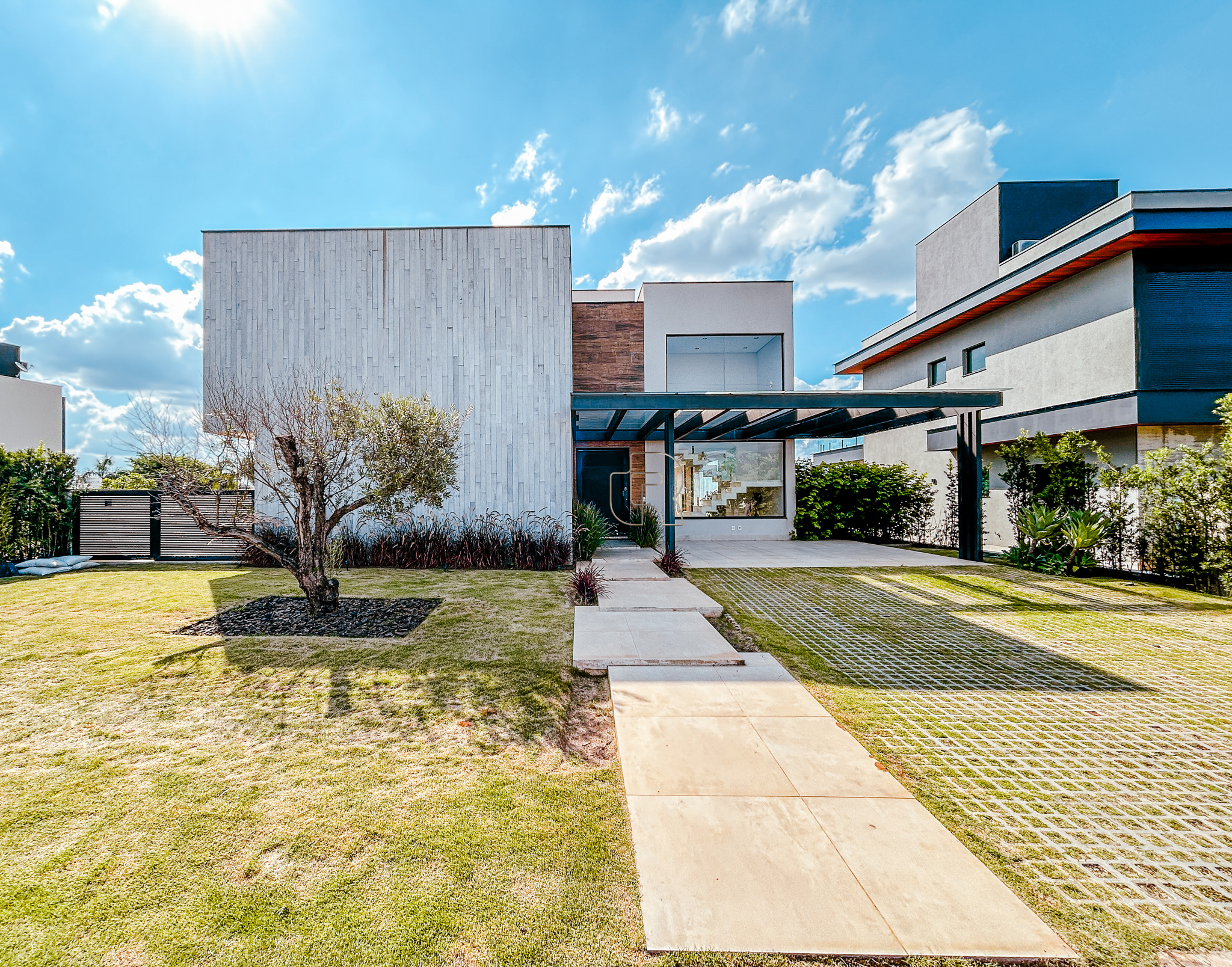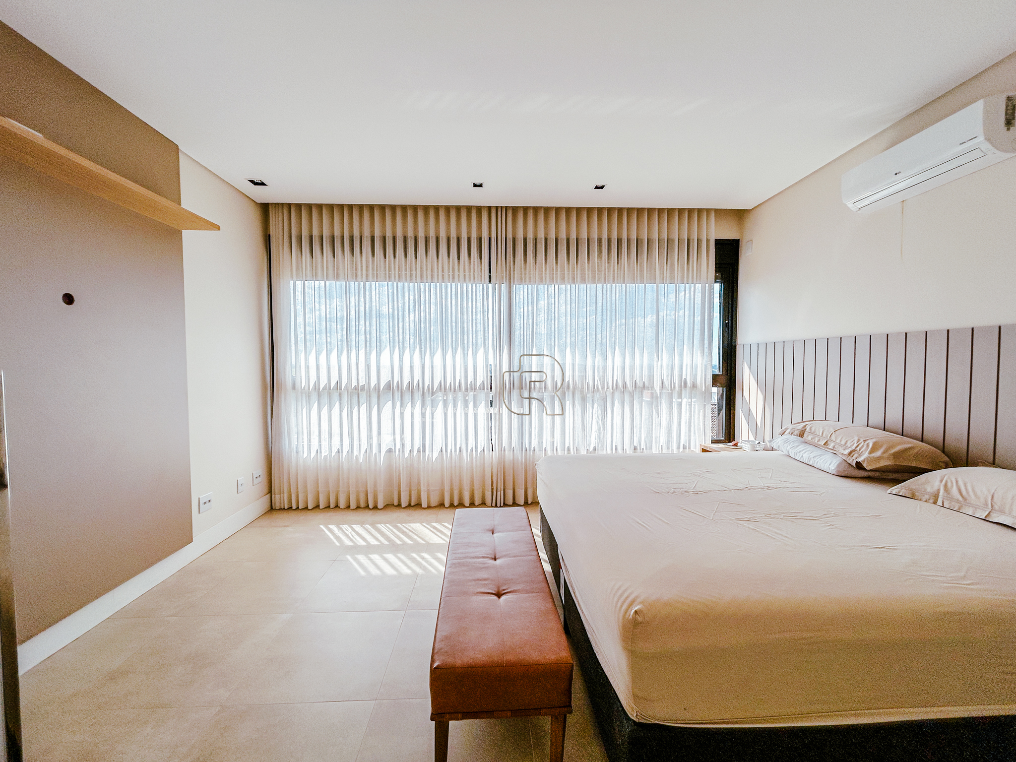 Essa residência dispõe de quatro suítes, sendo três completas, com móveis planejados da IGAPÓ e ar-condicionado. Os ambientes sociais são integrados, reunindo salas de TV, estar e jantar à área gourmet, criando um amplo e aconchegante espaço de convivência.