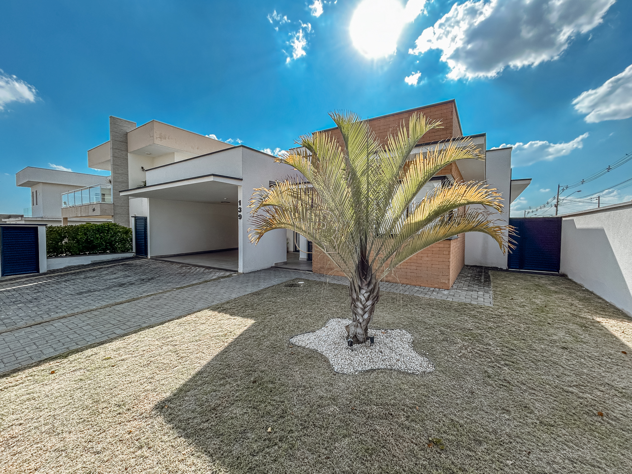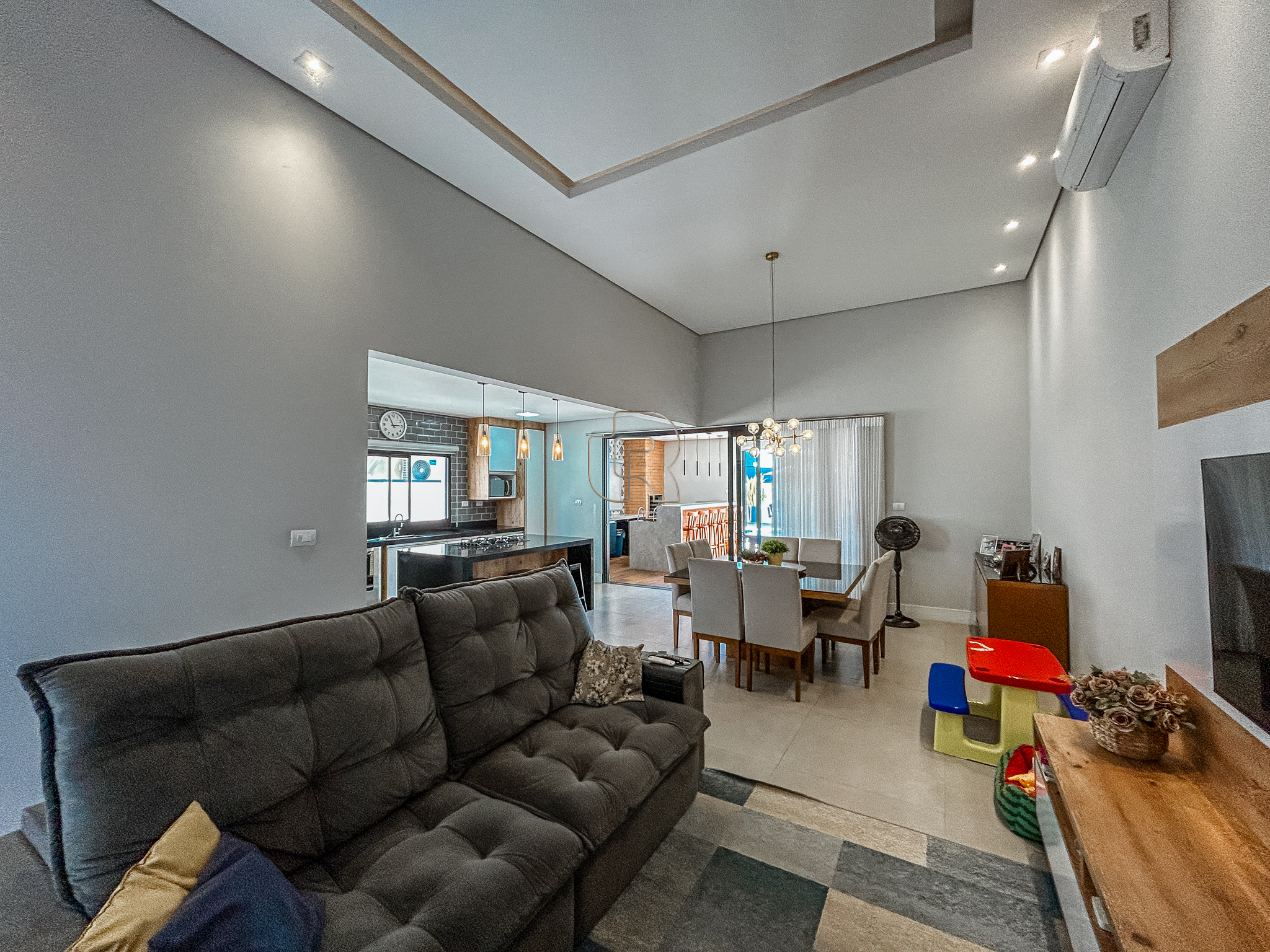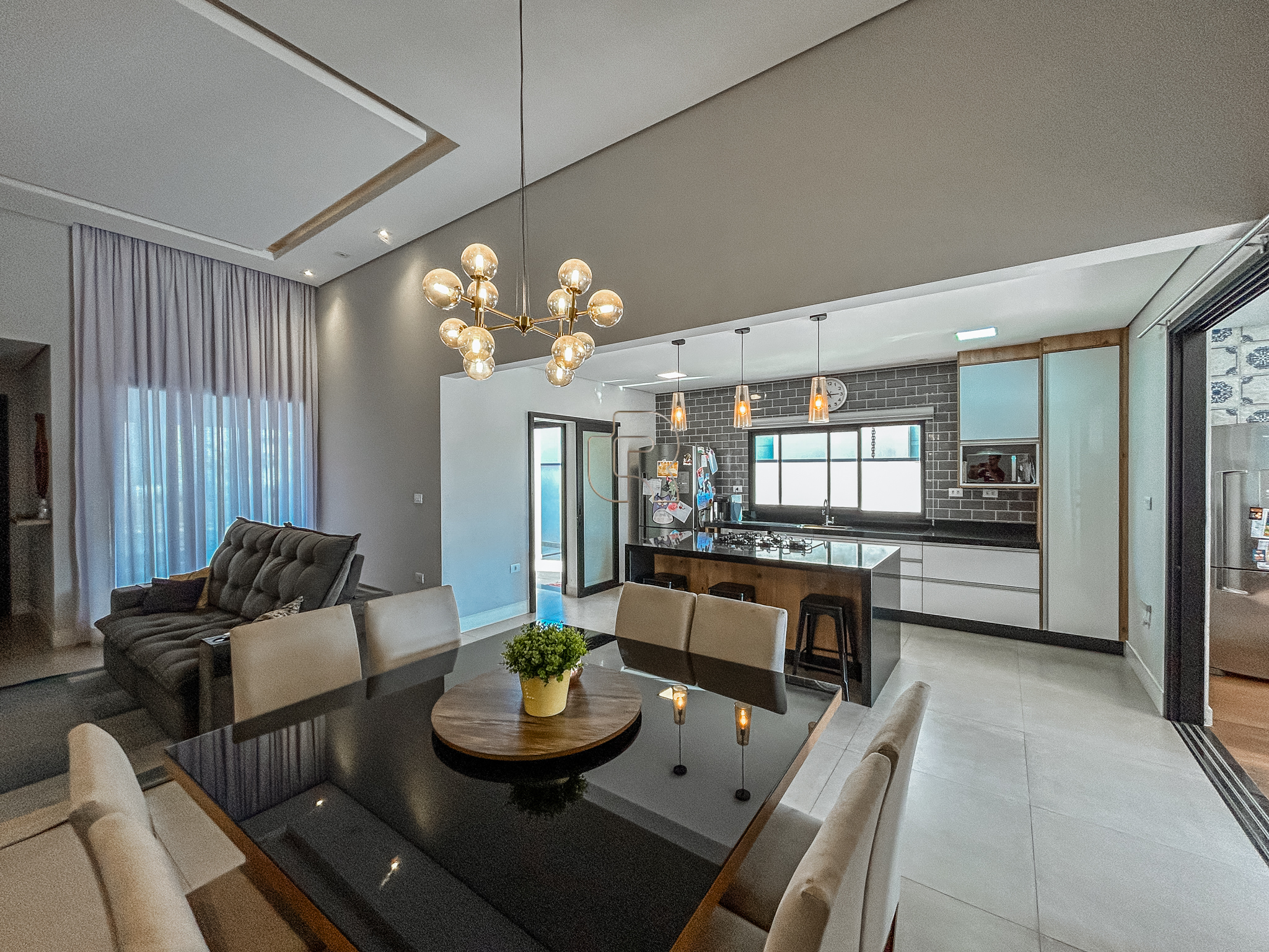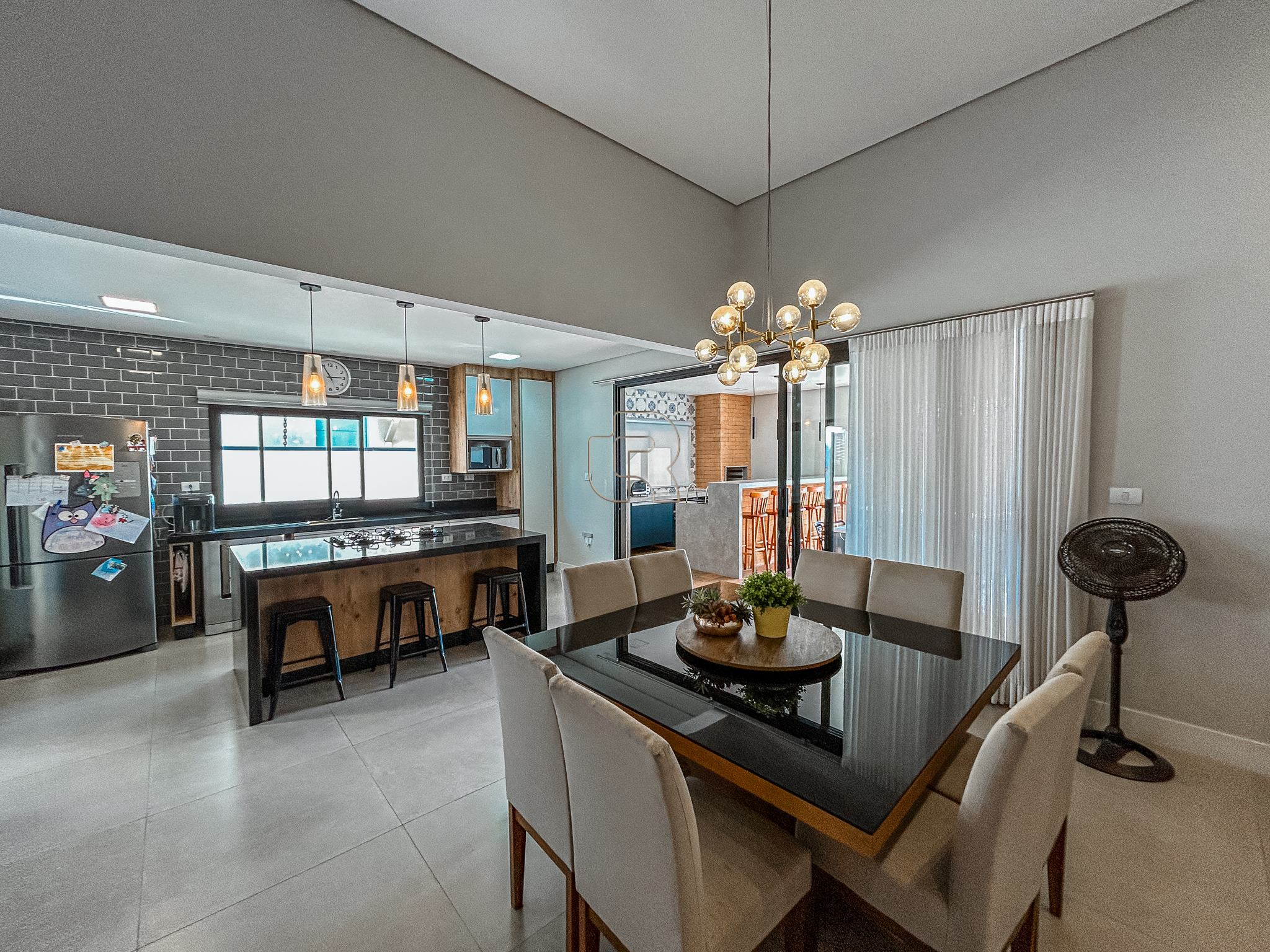 O imóvel conta com três suítes, escritório, lavabo, salas de TV e jantar integradas à cozinha americana, além de espaço gourmet com churrasqueira, piscina, banheiro externo, depósito e garagem coberta para dois veículos.
