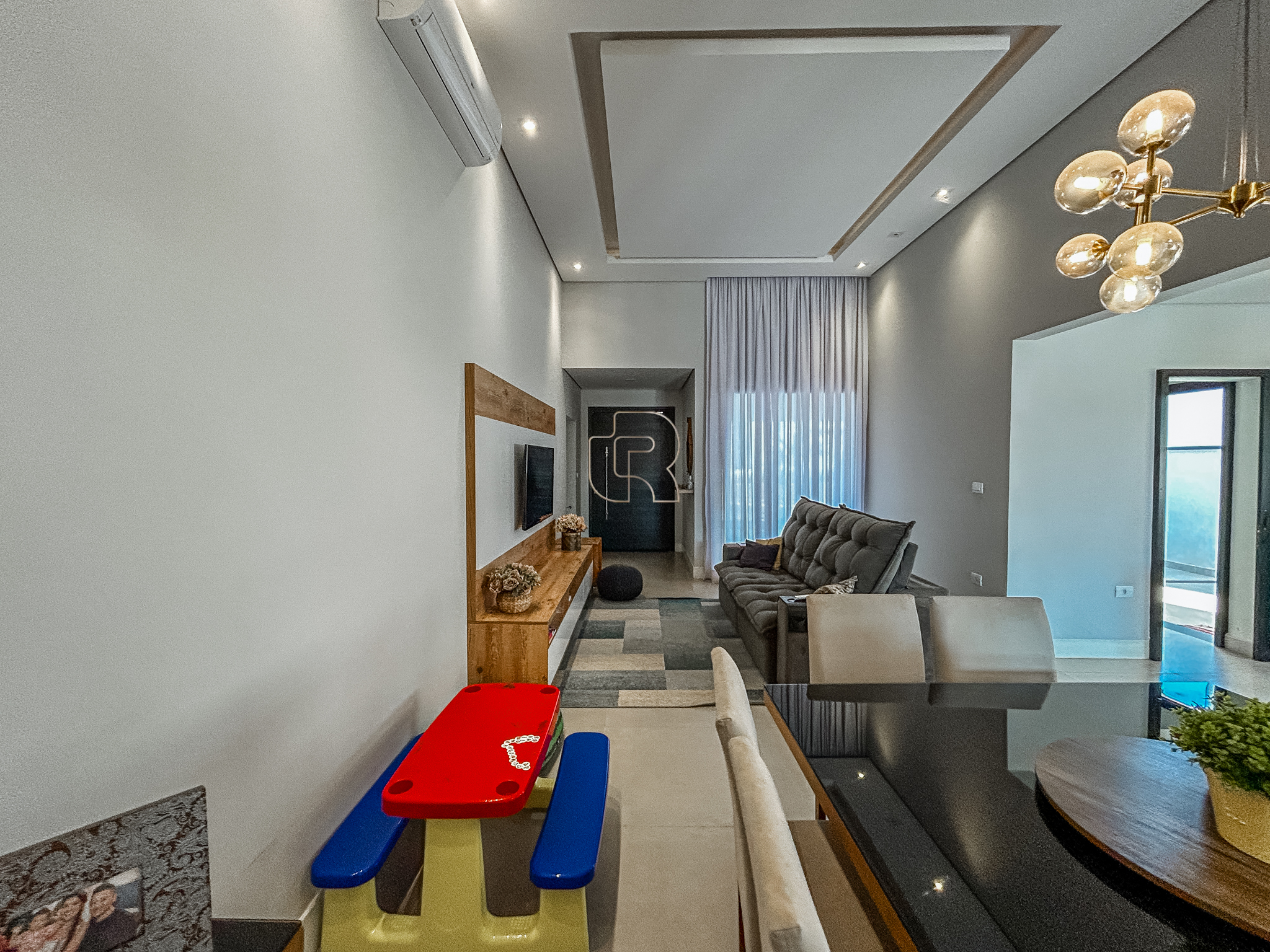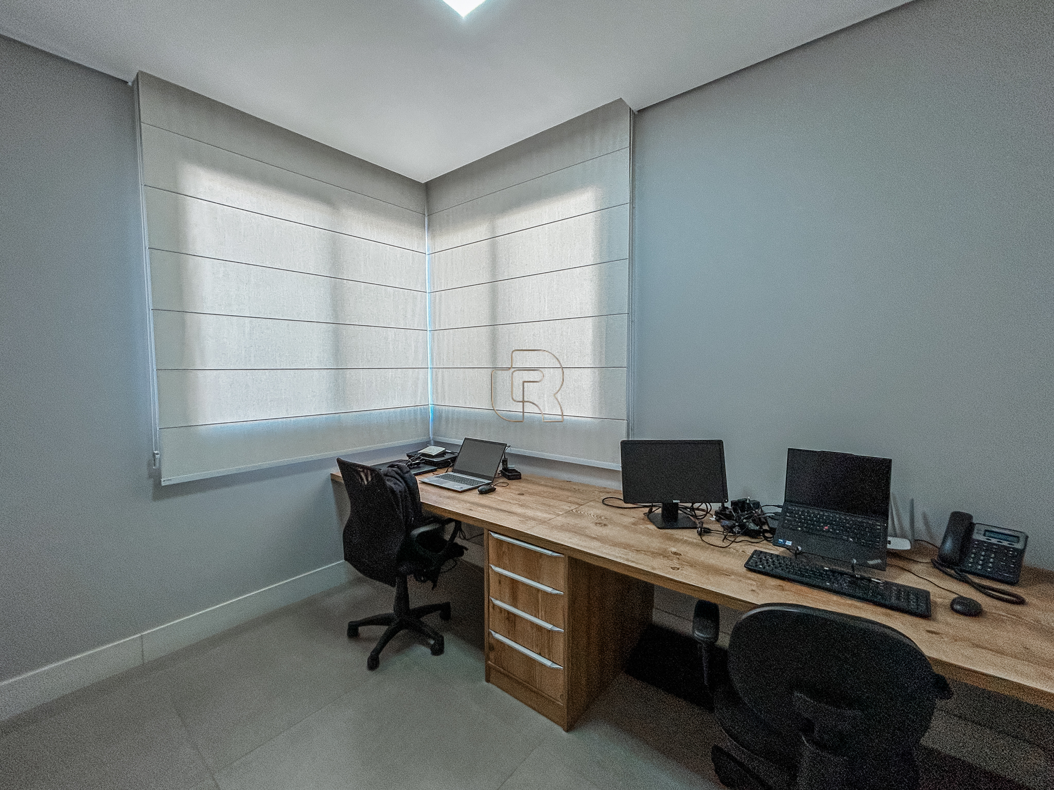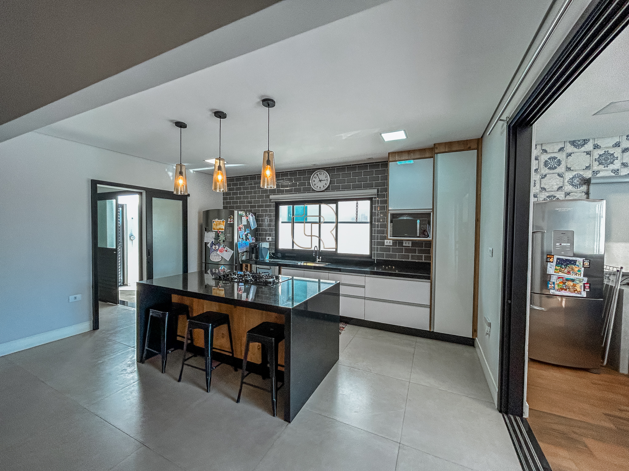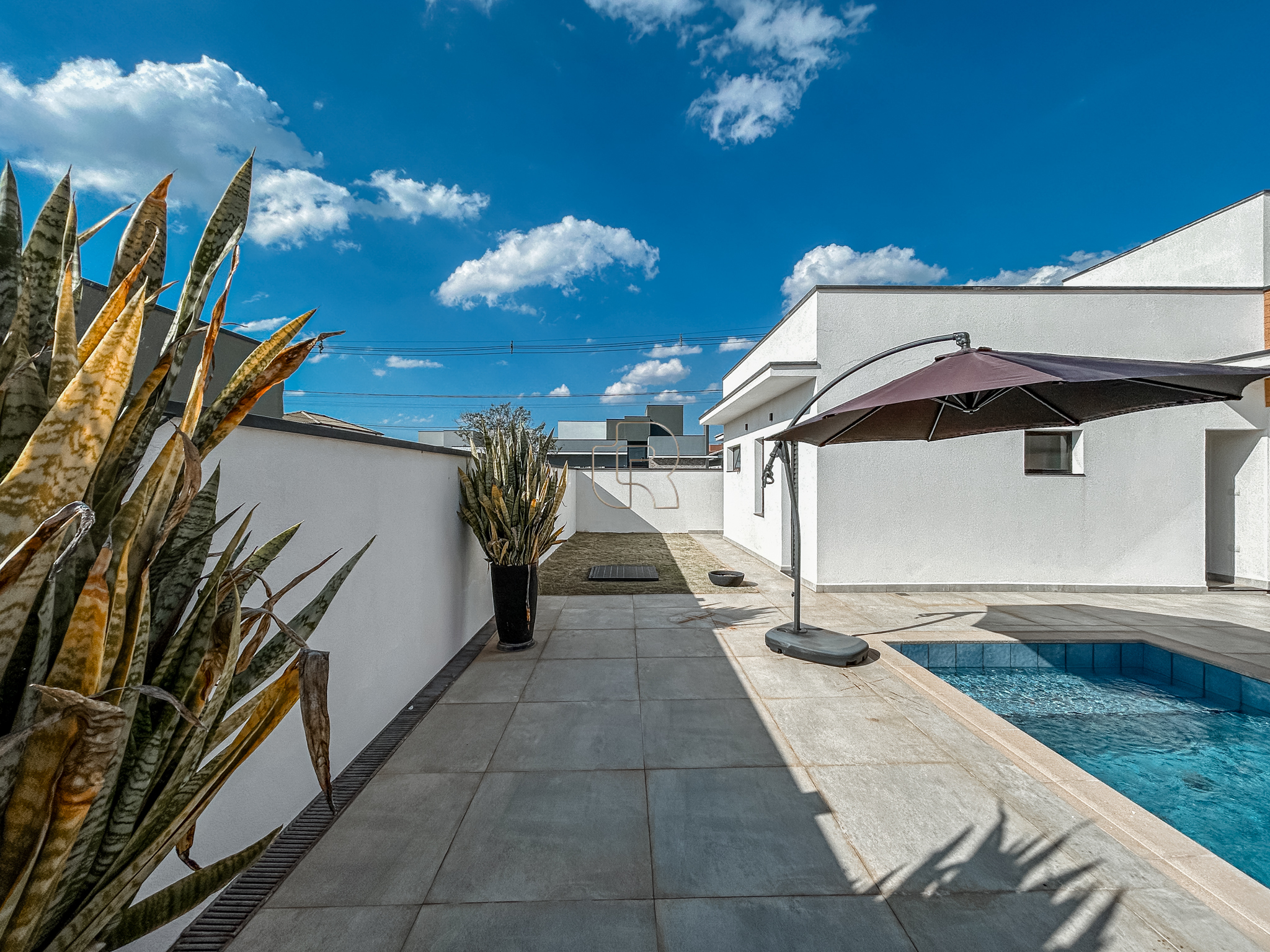 O imóvel conta com três suítes, escritório, lavabo, salas de TV e jantar integradas à cozinha americana, além de espaço gourmet com churrasqueira, piscina, banheiro externo, depósito e garagem coberta para dois veículos.