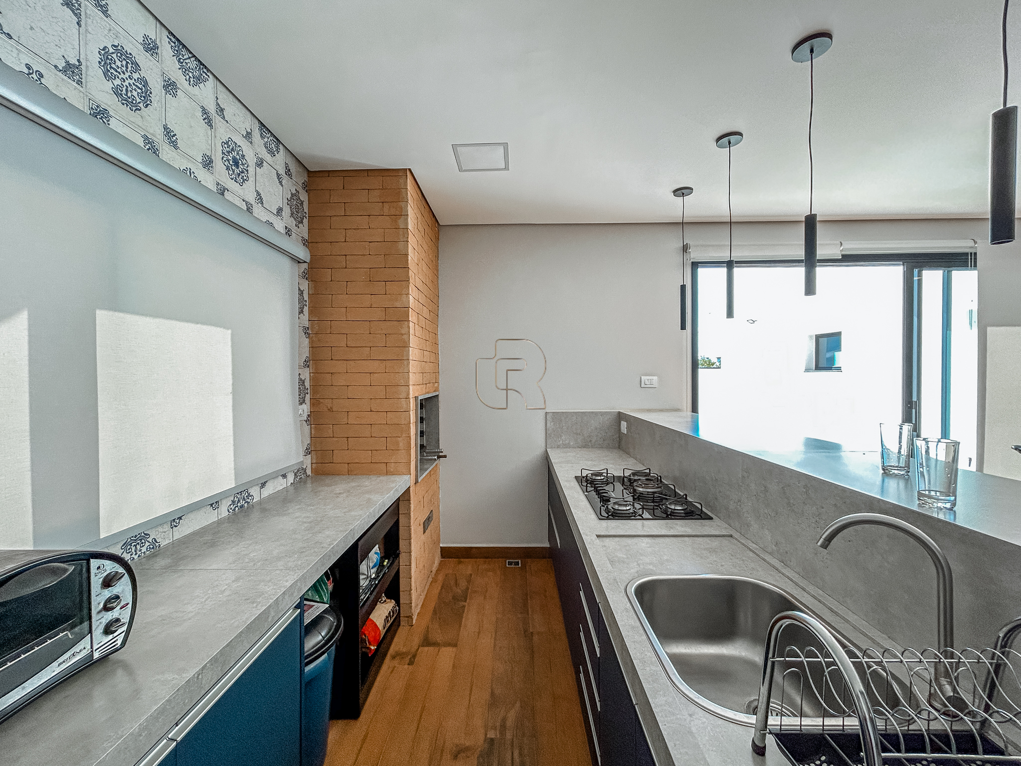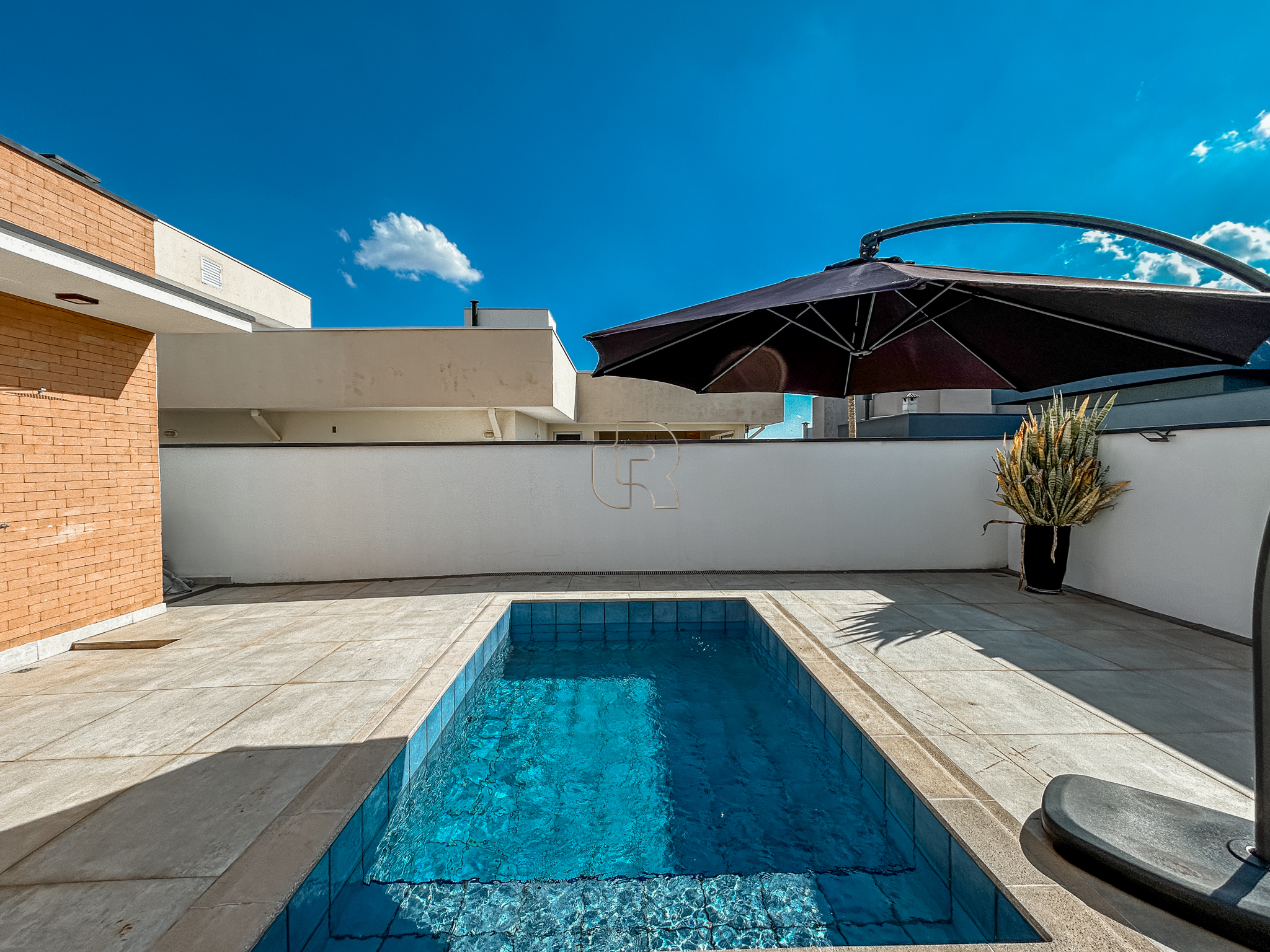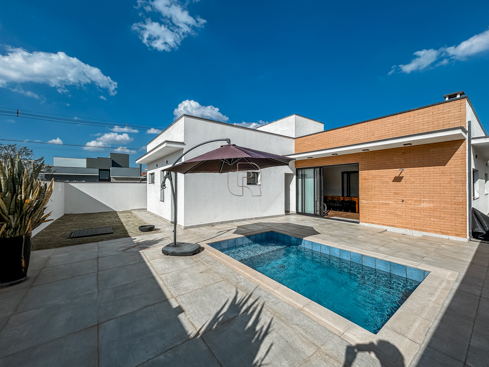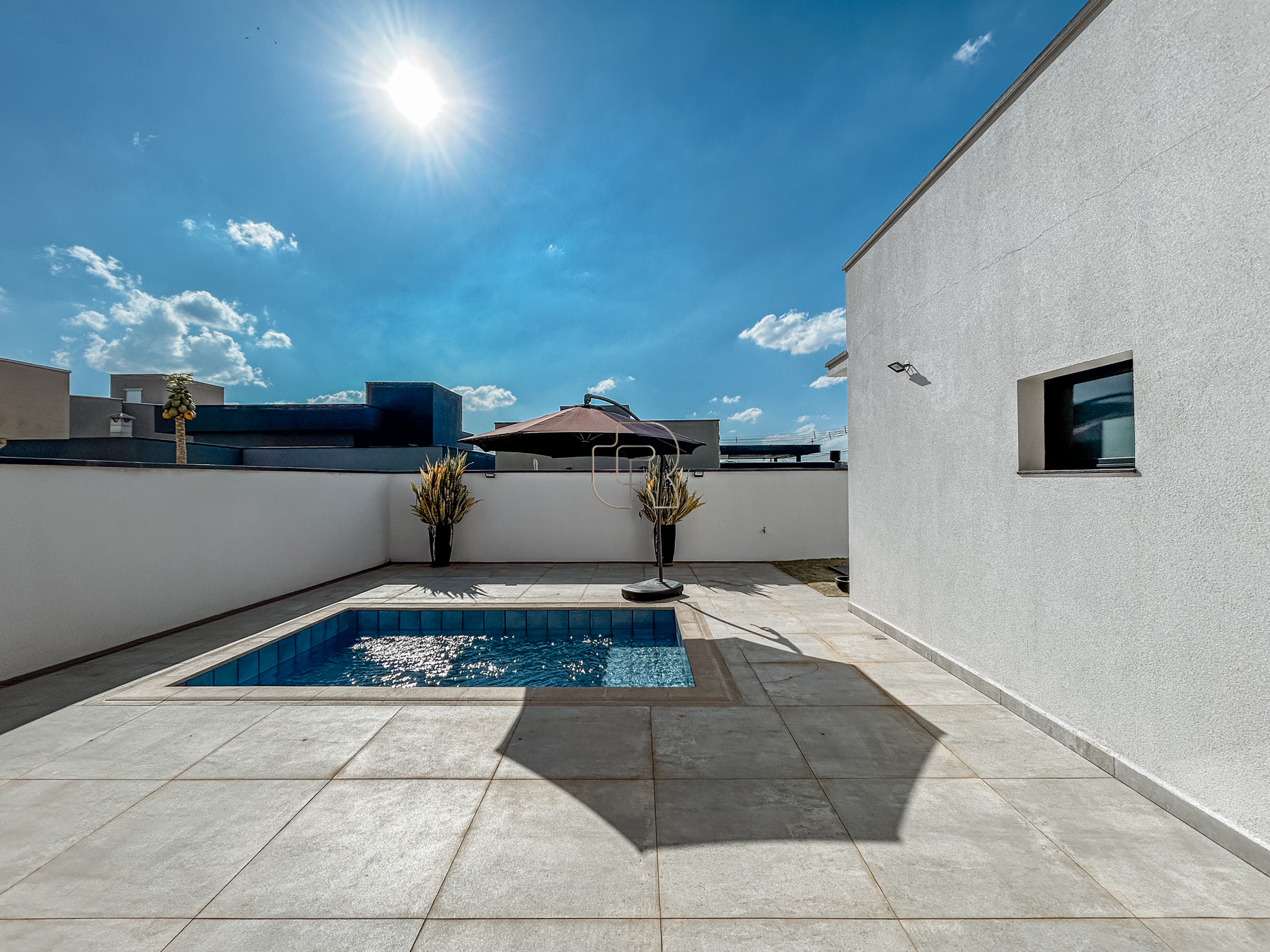 O imóvel conta com três suítes, escritório, lavabo, salas de TV e jantar integradas à cozinha americana, além de espaço gourmet com churrasqueira, piscina, banheiro externo, depósito e garagem coberta para dois veículos.