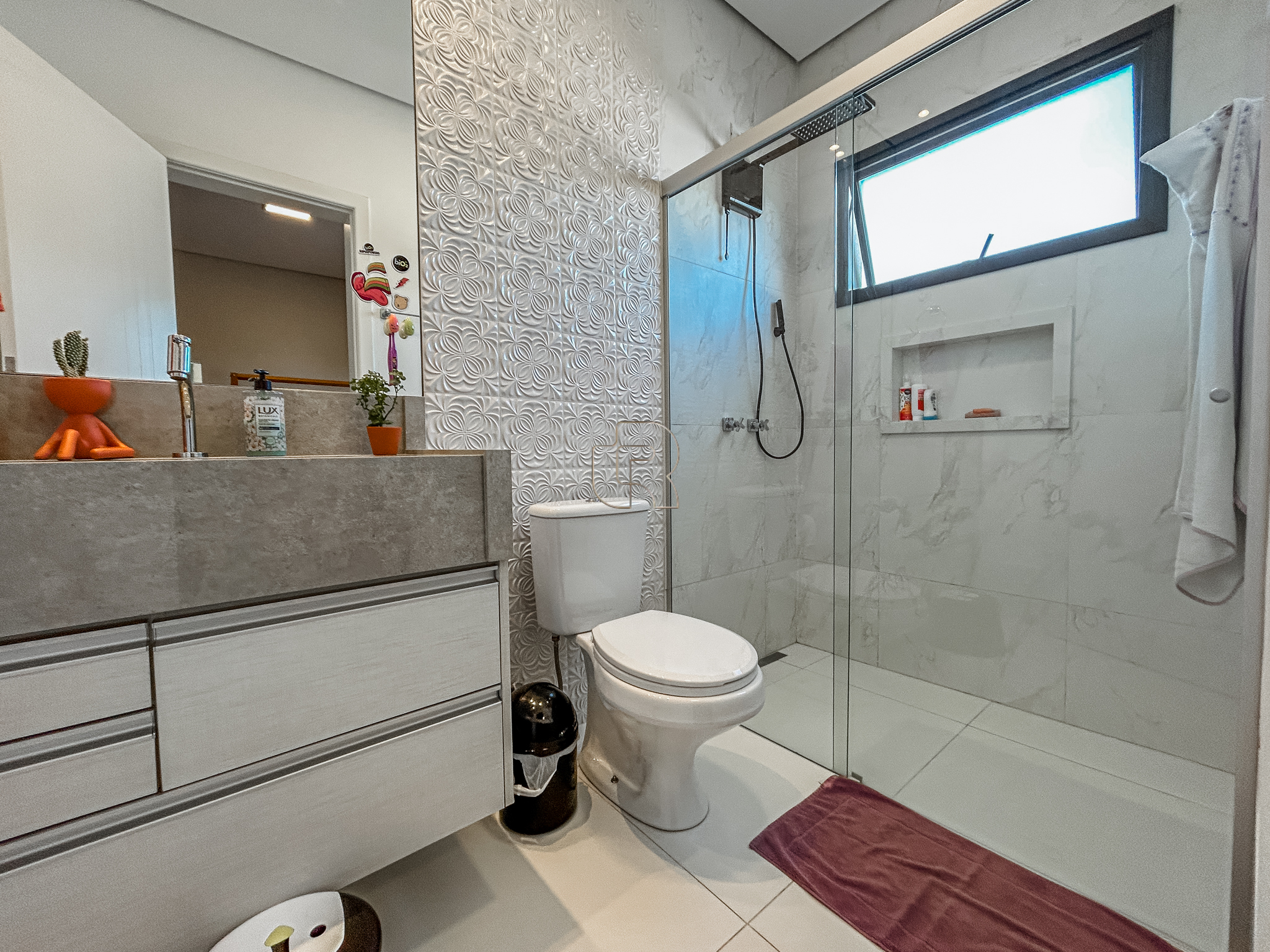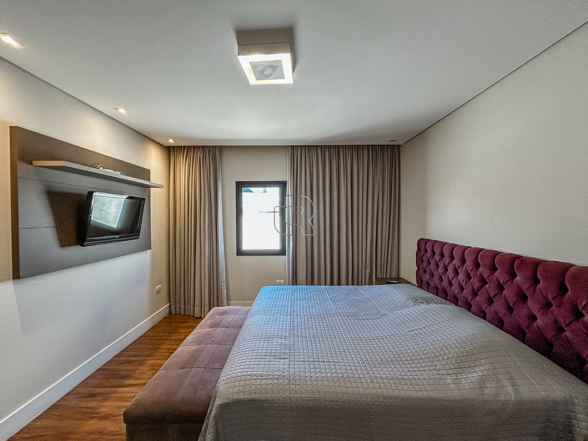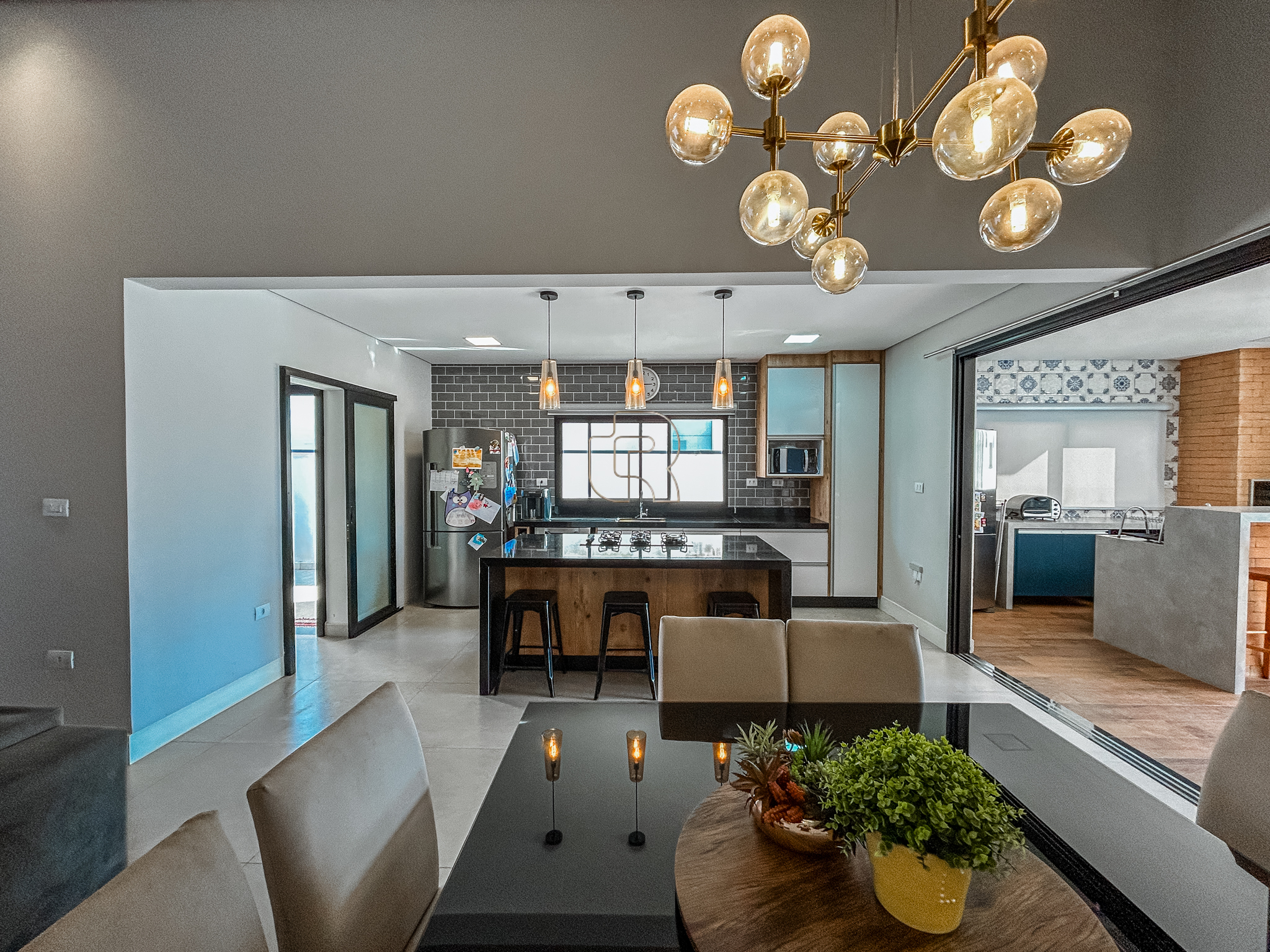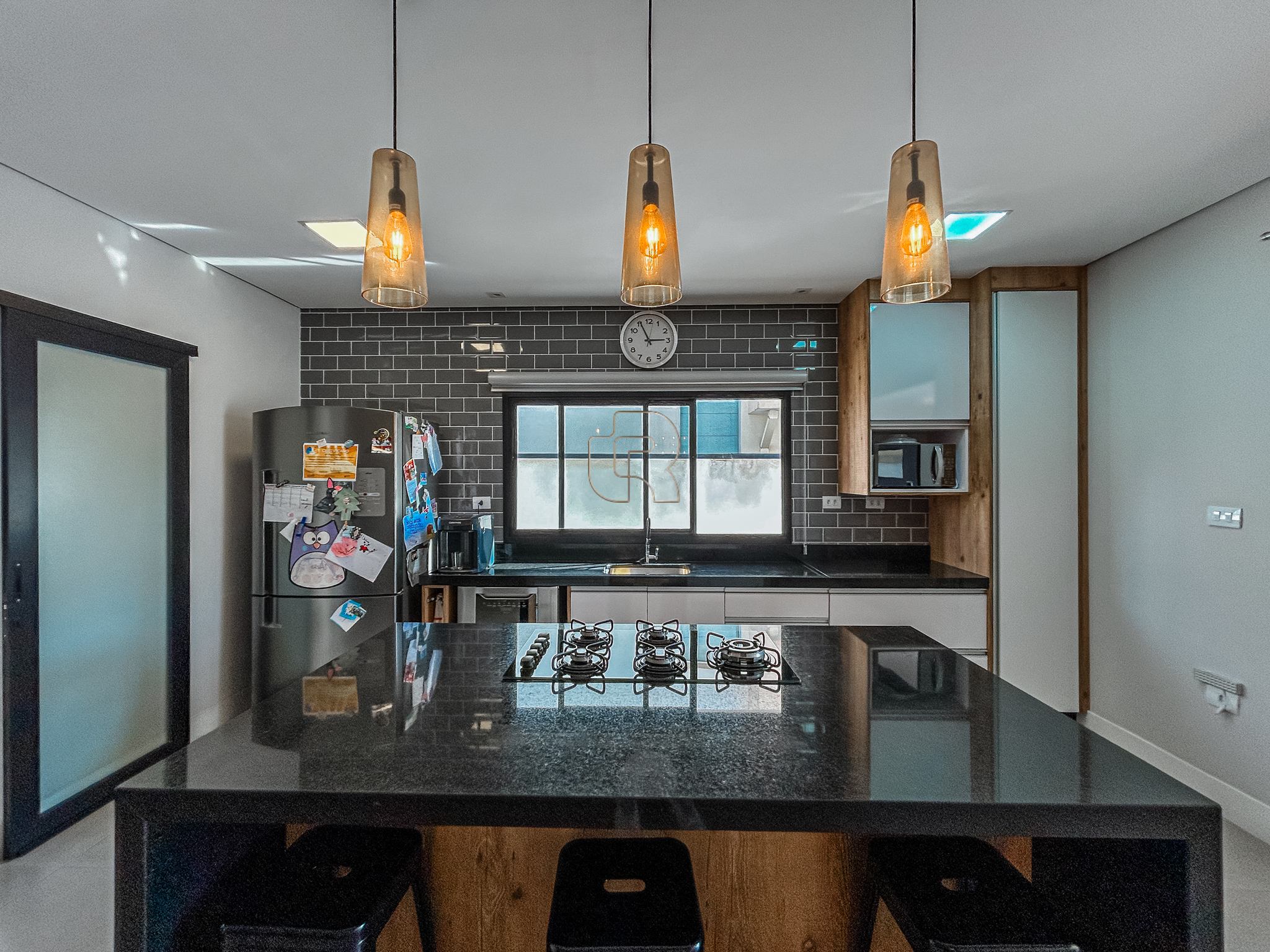 O imóvel conta com três suítes, escritório, lavabo, salas de TV e jantar integradas à cozinha americana, além de espaço gourmet com churrasqueira, piscina, banheiro externo, depósito e garagem coberta para dois veículos.