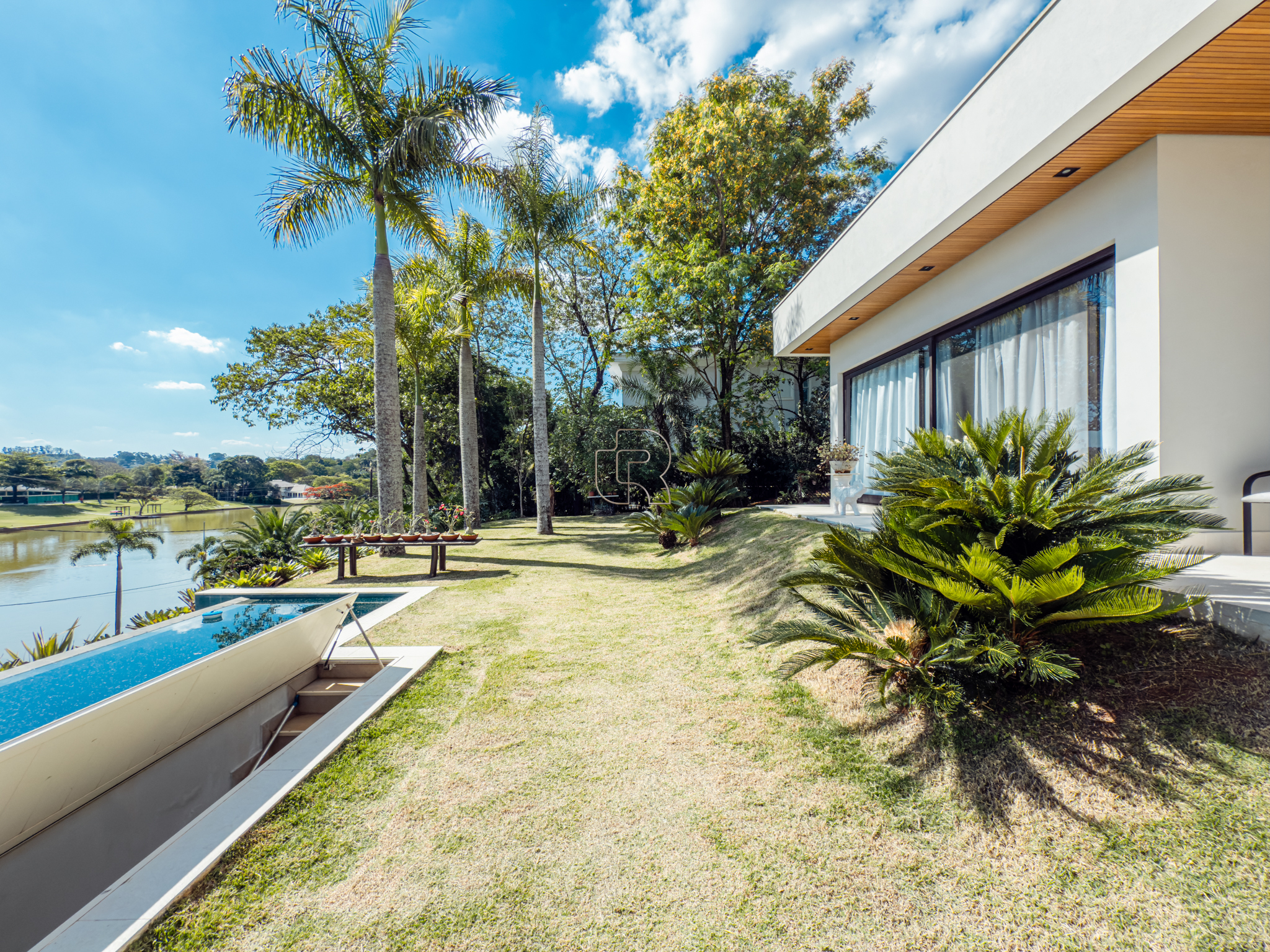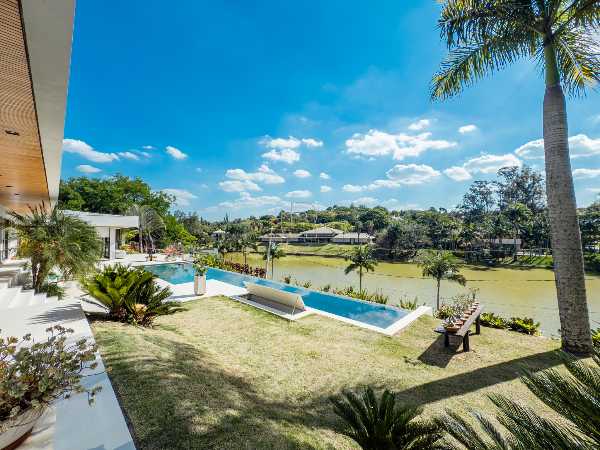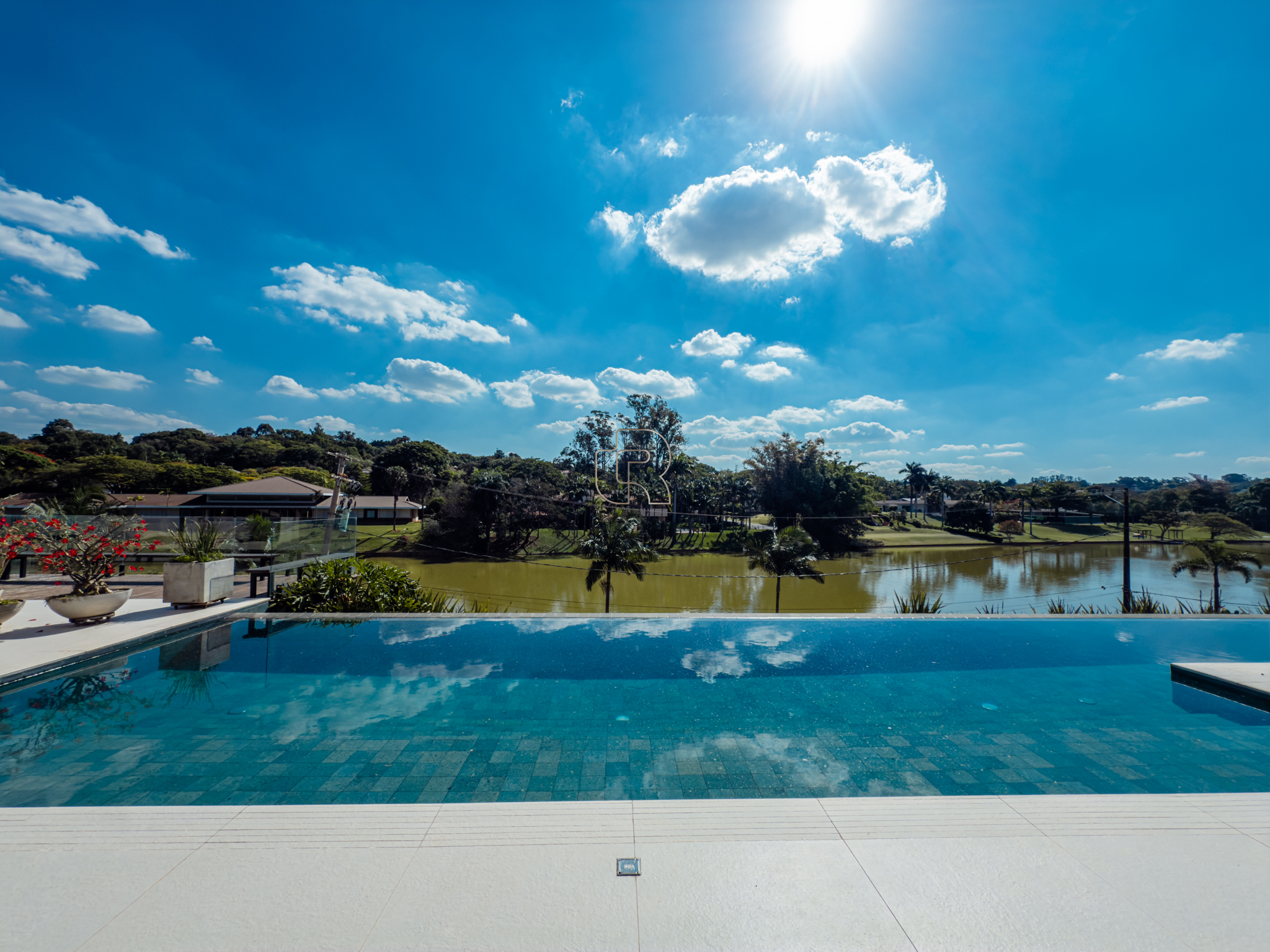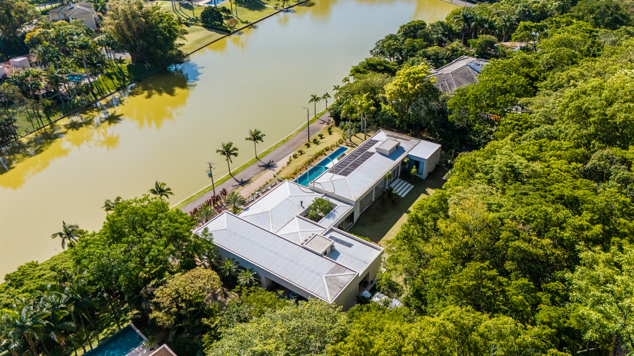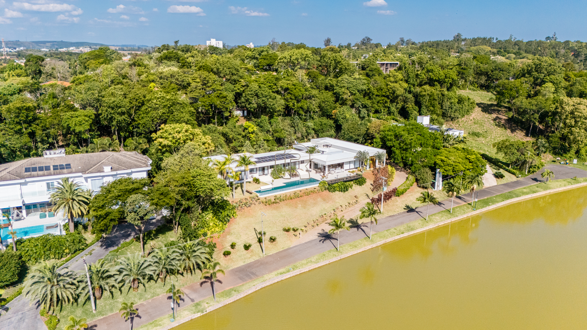 A residência conta com cinco suítes confortáveis, duas salas espaçosas que favorecem a convivência e o bem-estar, e uma área gourmet completa, perfeita para receber com elegância. Na área externa, a piscina aquecida com raia se integra a um amplo deck com vista para o lago, criando um espaço exclusivo para lazer e relaxamento. A garagem coberta possui capacidade para quatro veículos, unindo praticidade e segurança.