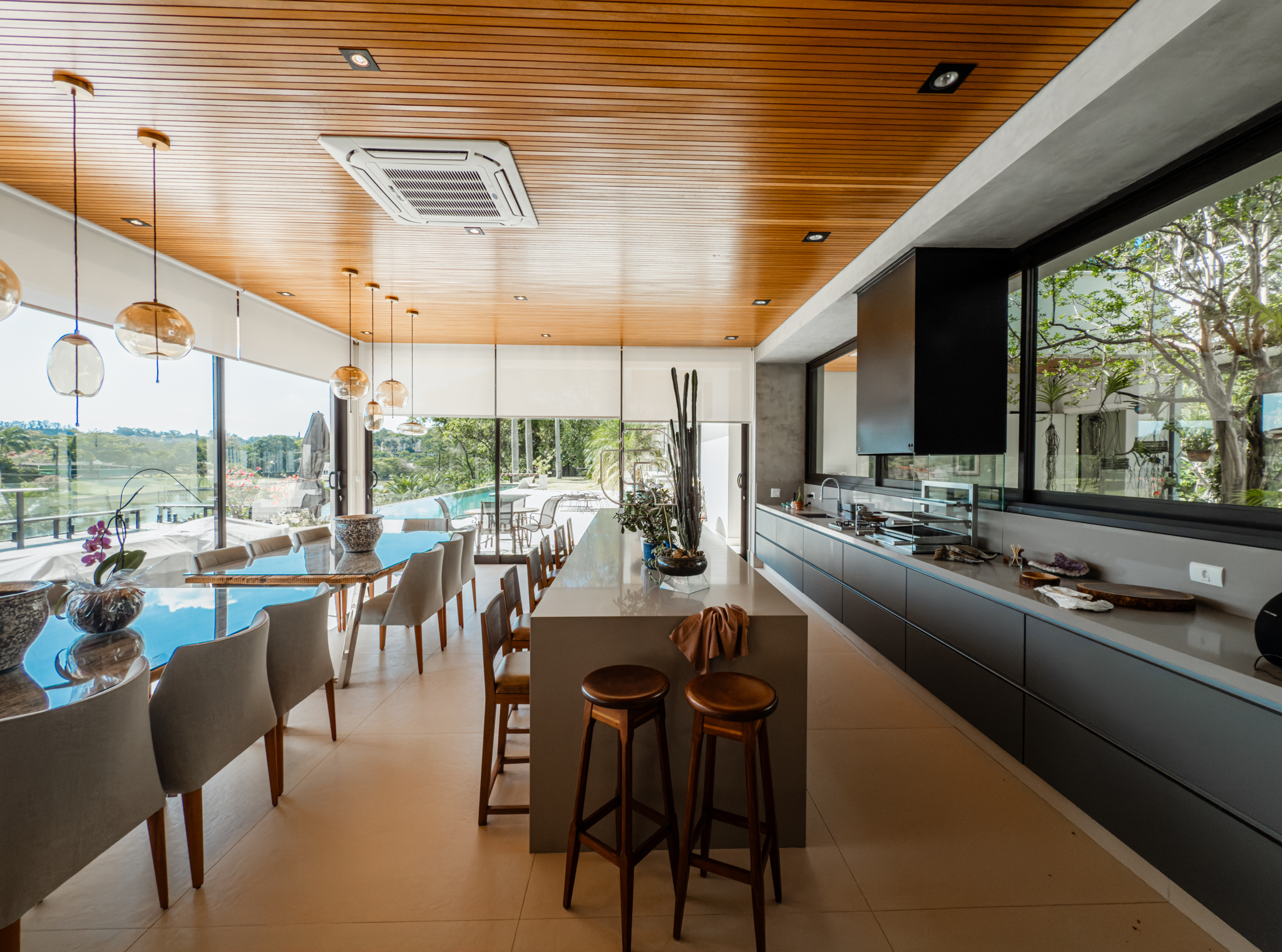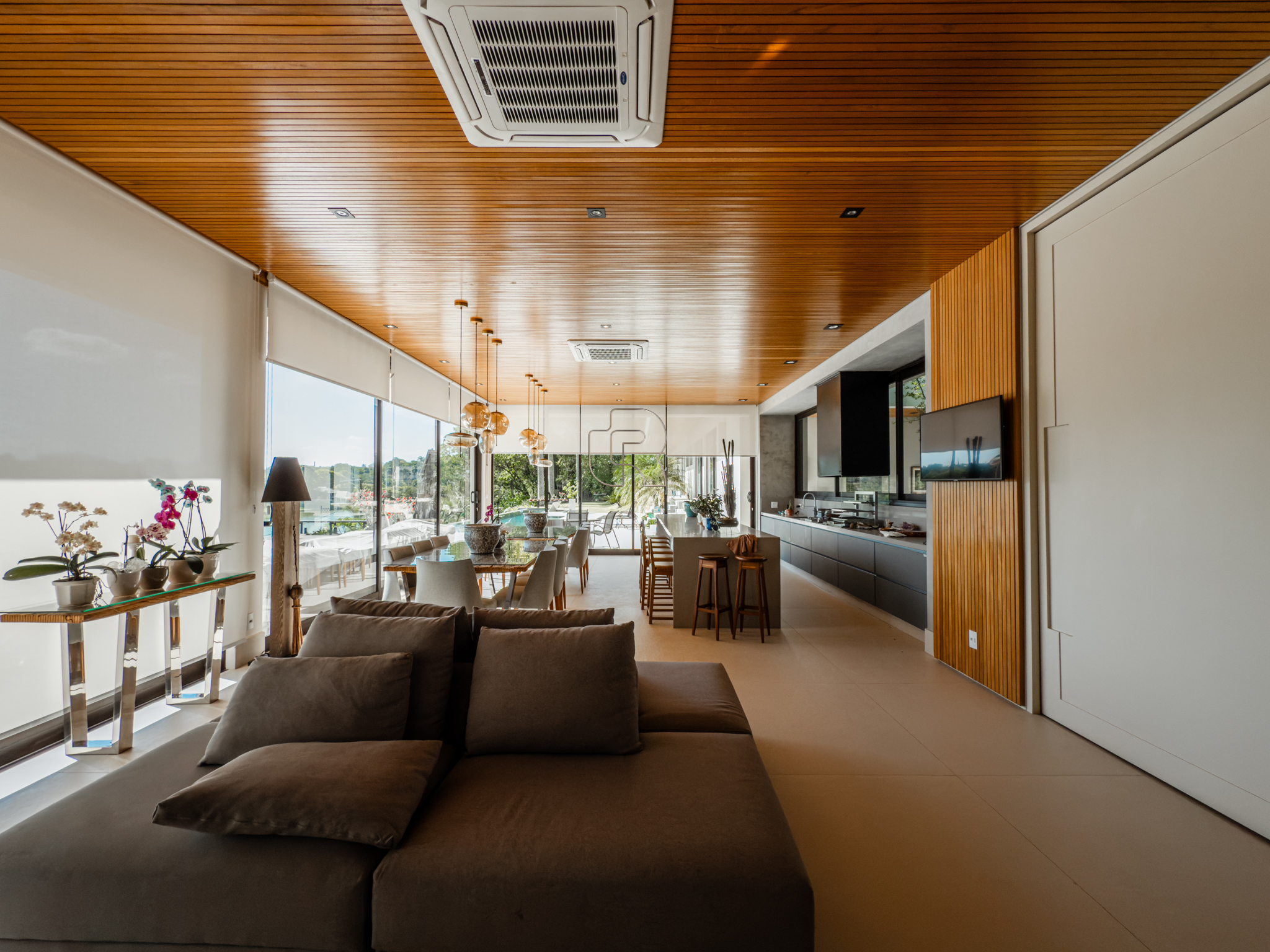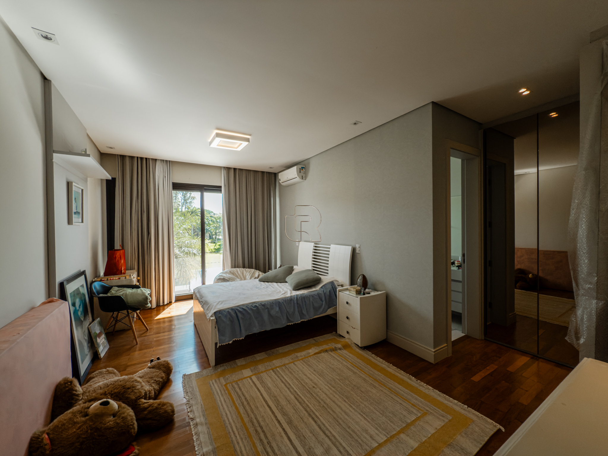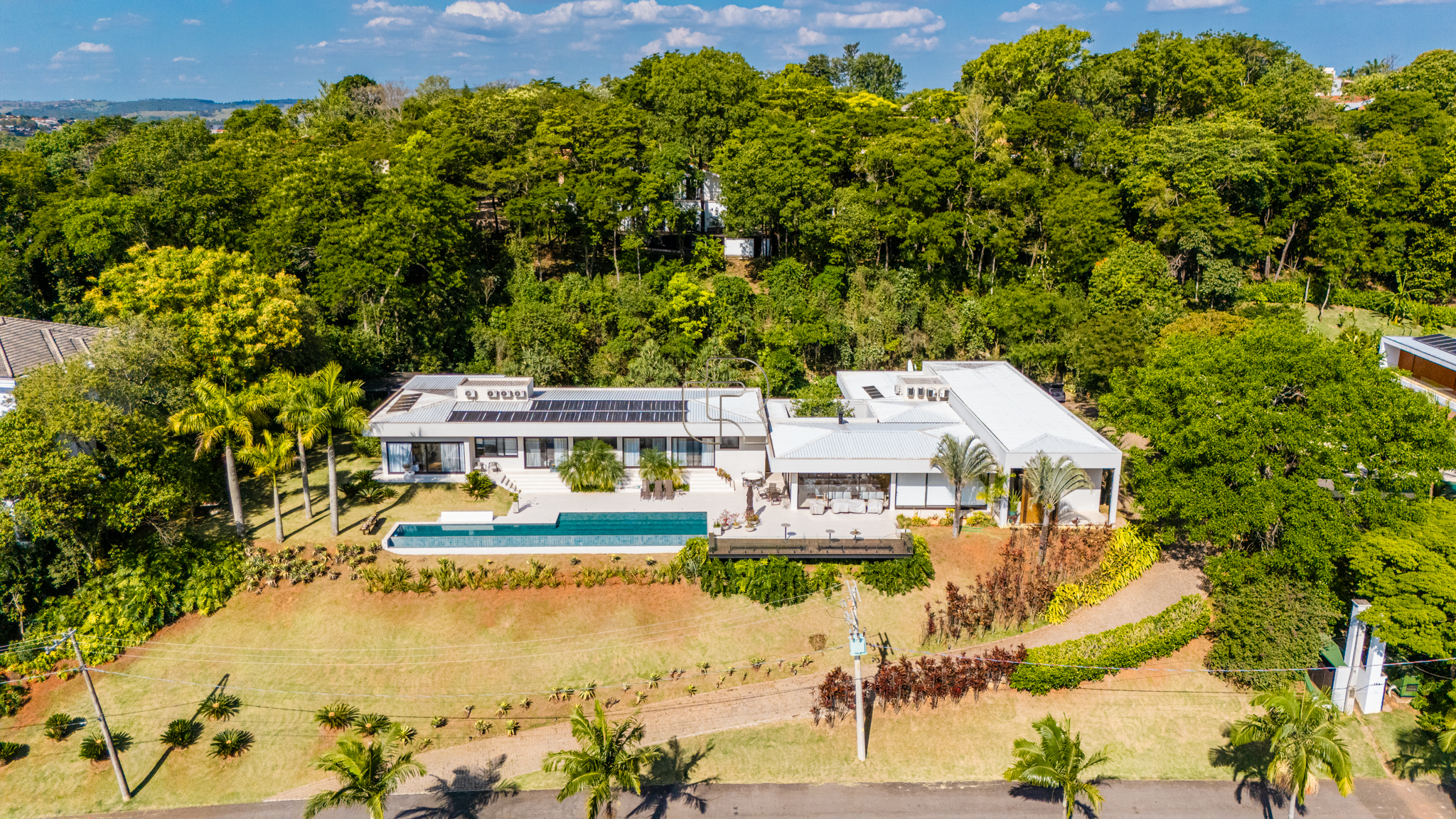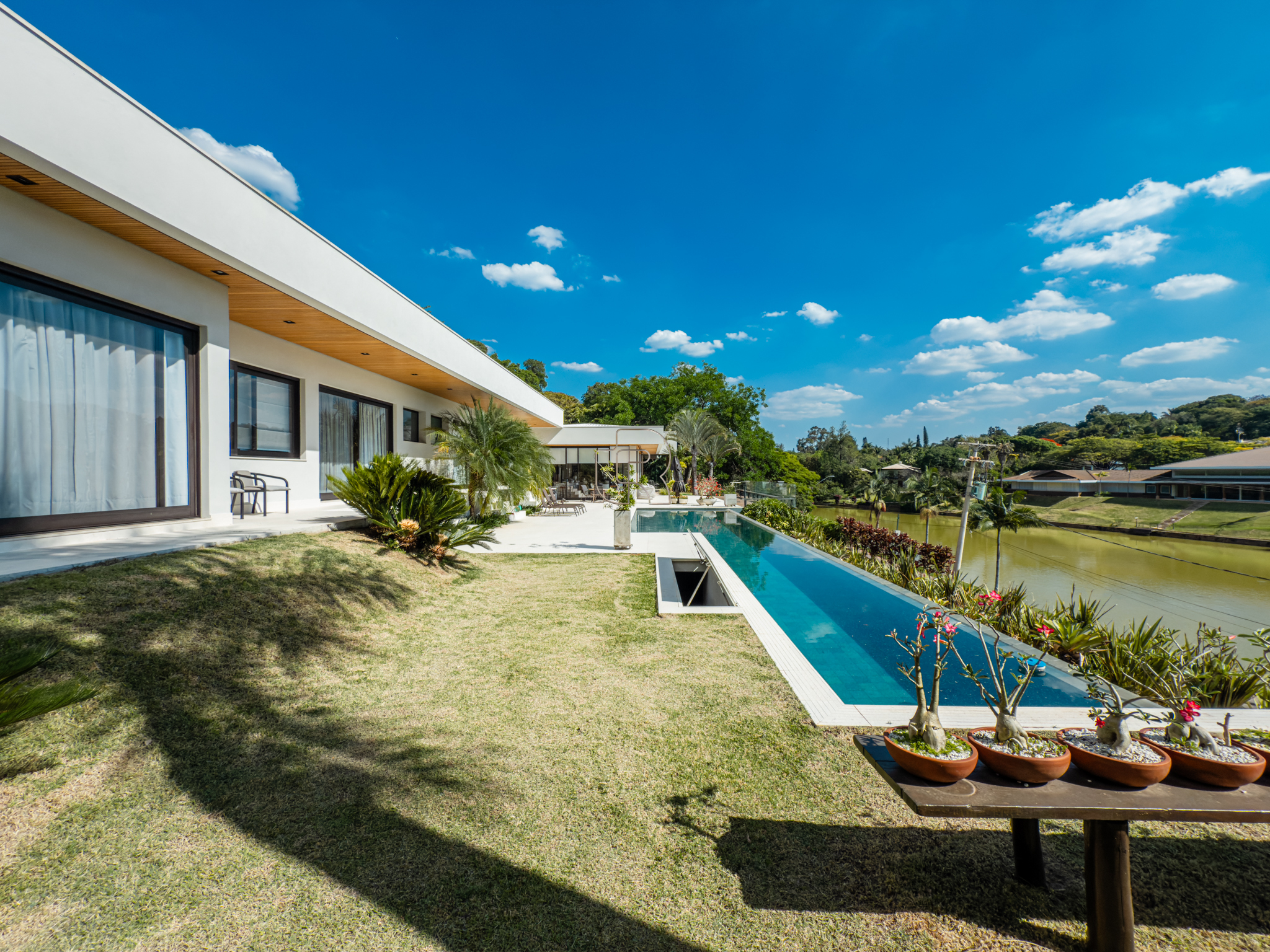 A residência conta com cinco suítes confortáveis, duas salas espaçosas que favorecem a convivência e o bem-estar, e uma área gourmet completa, perfeita para receber com elegância. Na área externa, a piscina aquecida com raia se integra a um amplo deck com vista para o lago, criando um espaço exclusivo para lazer e relaxamento. A garagem coberta possui capacidade para quatro veículos, unindo praticidade e segurança.