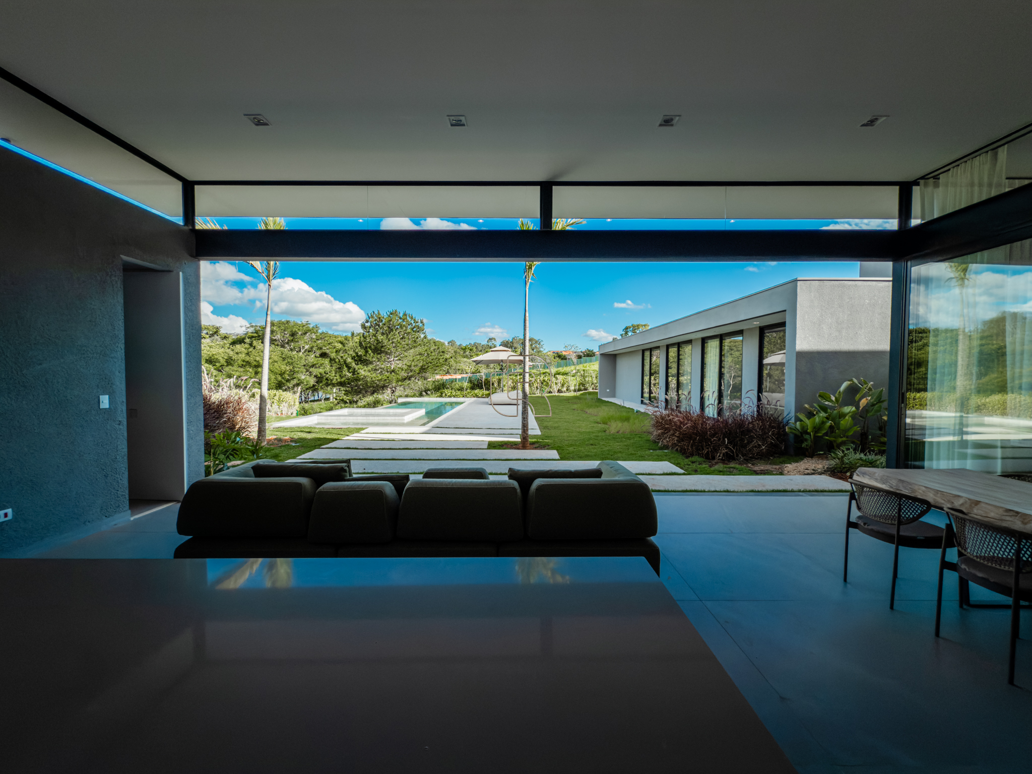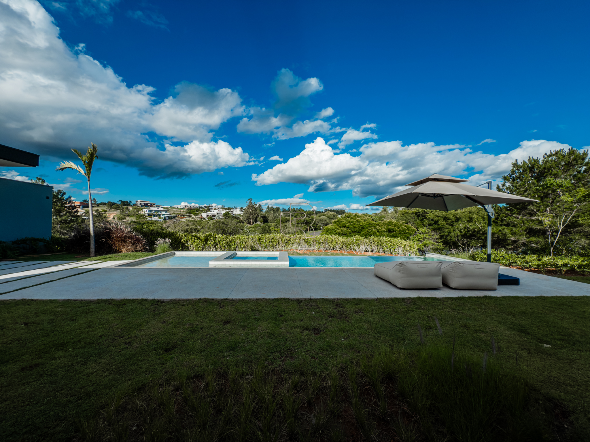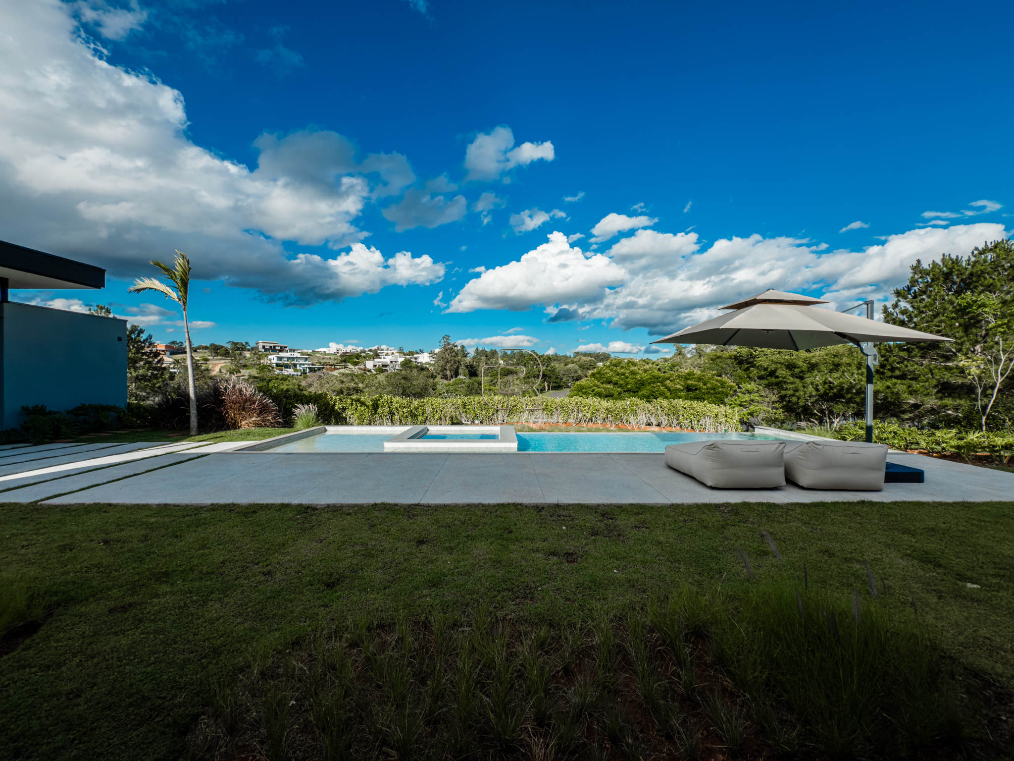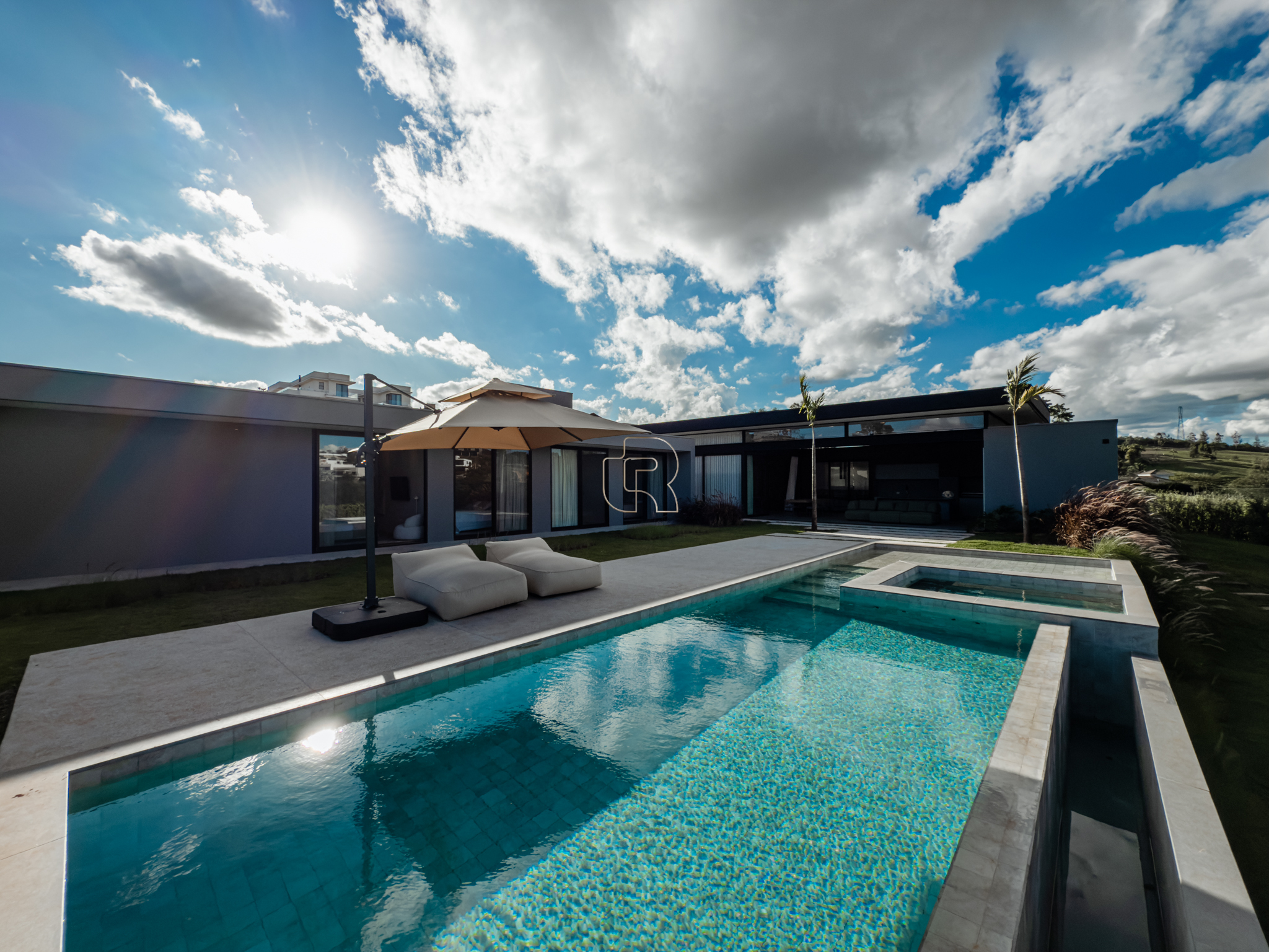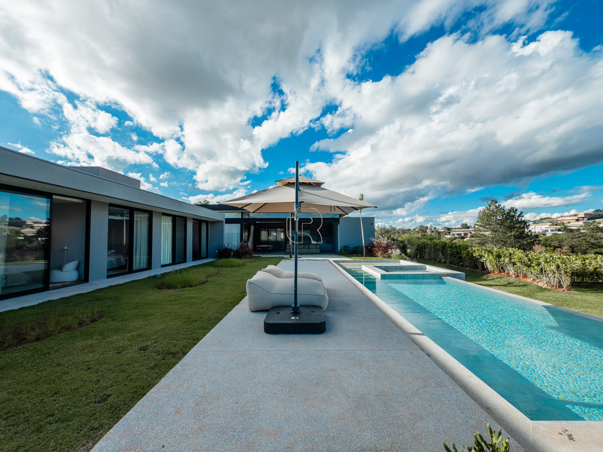 A área gourmet é equipada com cervejeira, cooktop, forno de pizza e churrasqueira, ideal para receber com conforto e elegância. Na área externa, a casa dispõe de piscina com borda infinita e spa com hidromassagem, proporcionando lazer e bem-estar. Os acabamentos refletem alto padrão, com piso em madeira nas suítes e porcelanato Portobello nos demais ambientes, além de portas painel do piso ao teto, que garantem amplitude, iluminação natural e um design marcante.