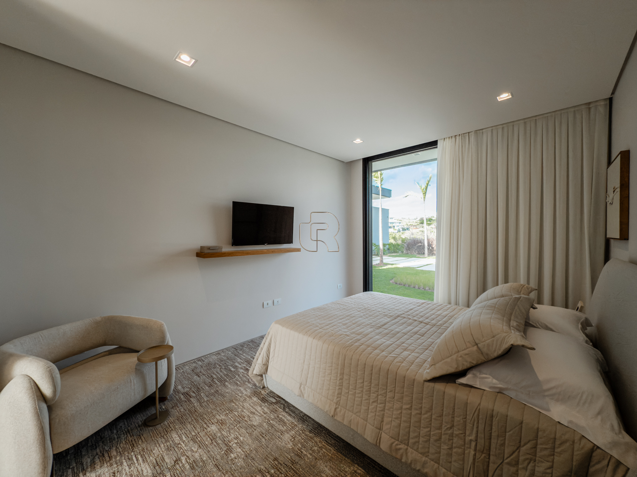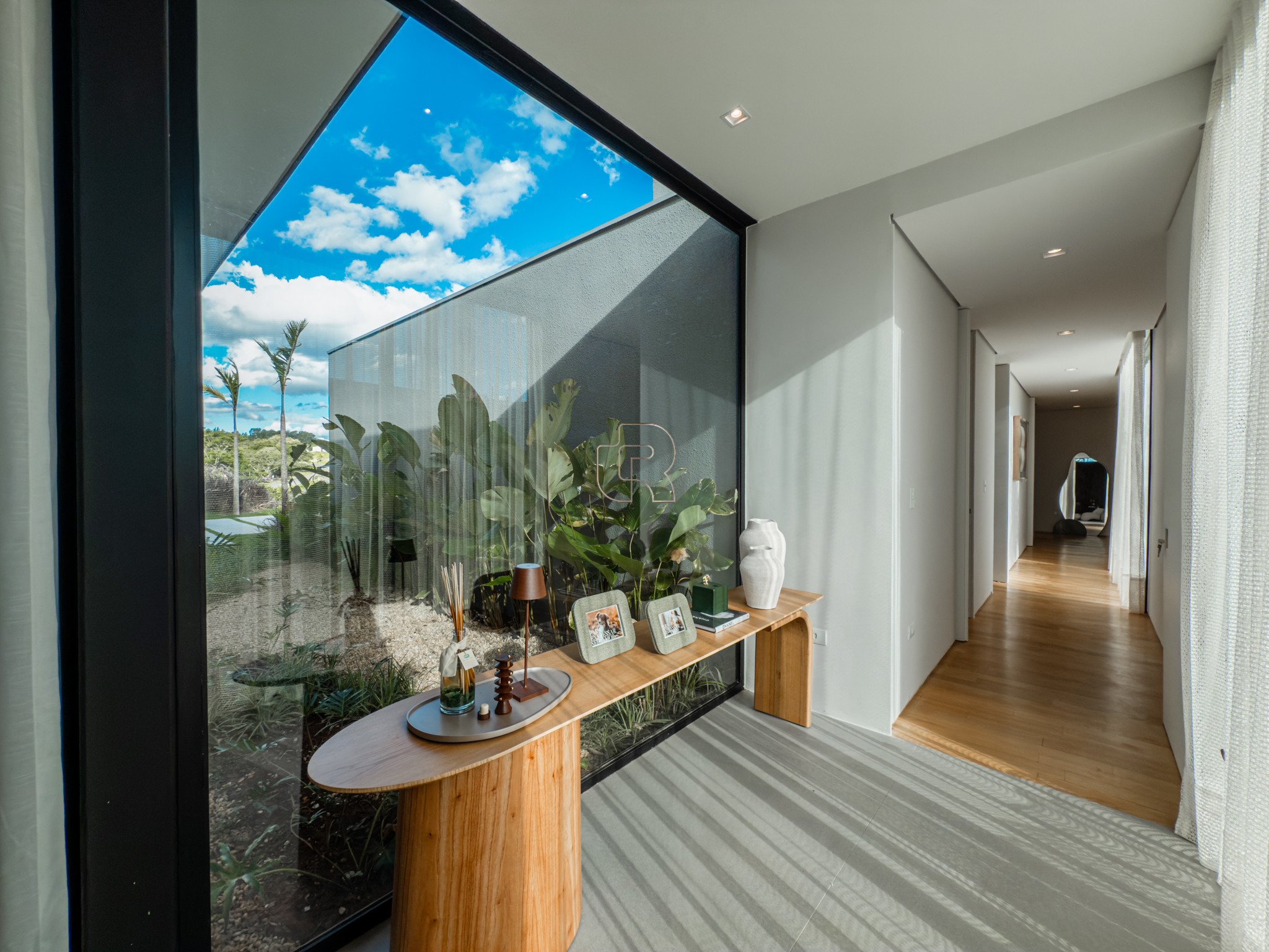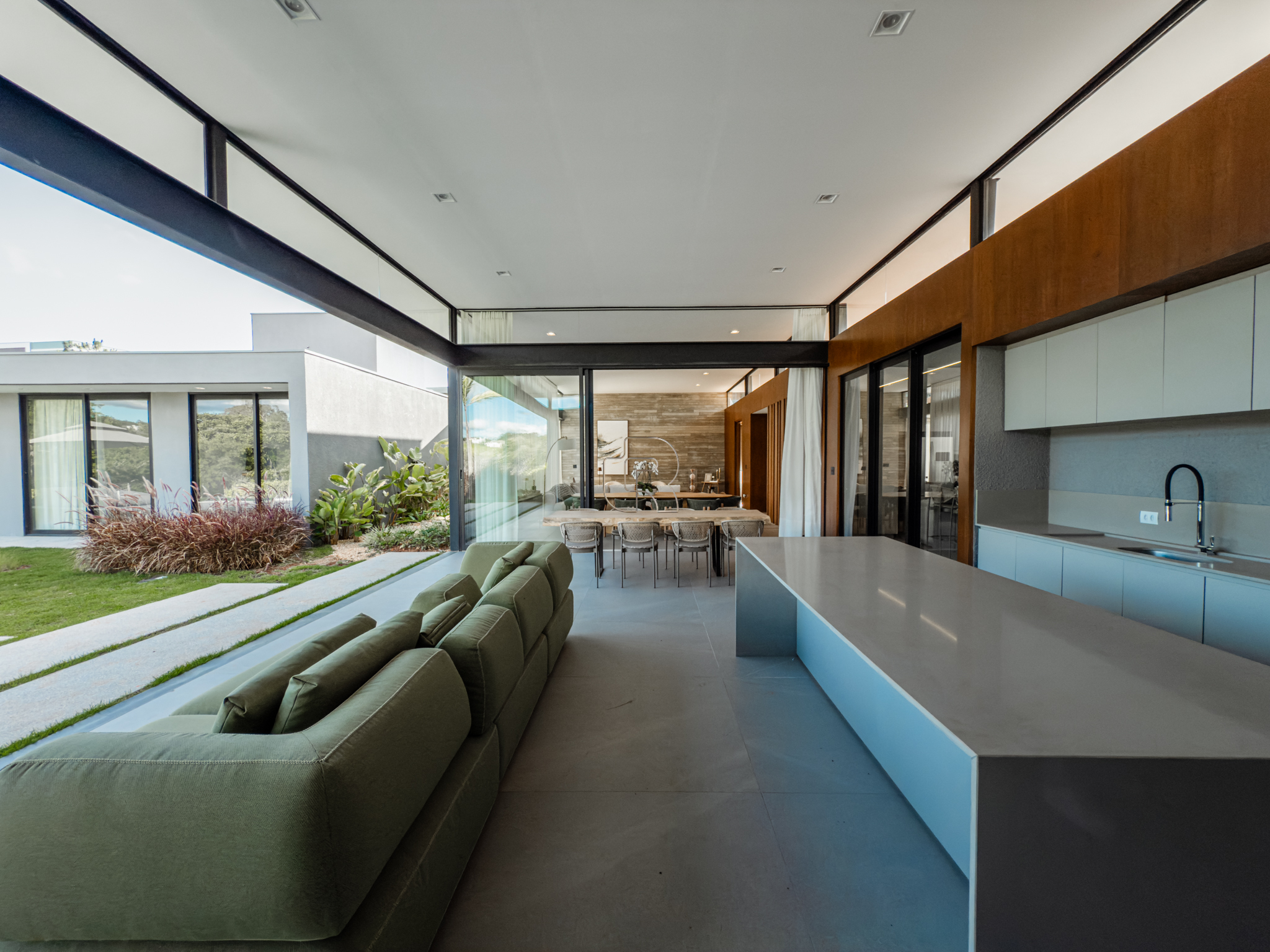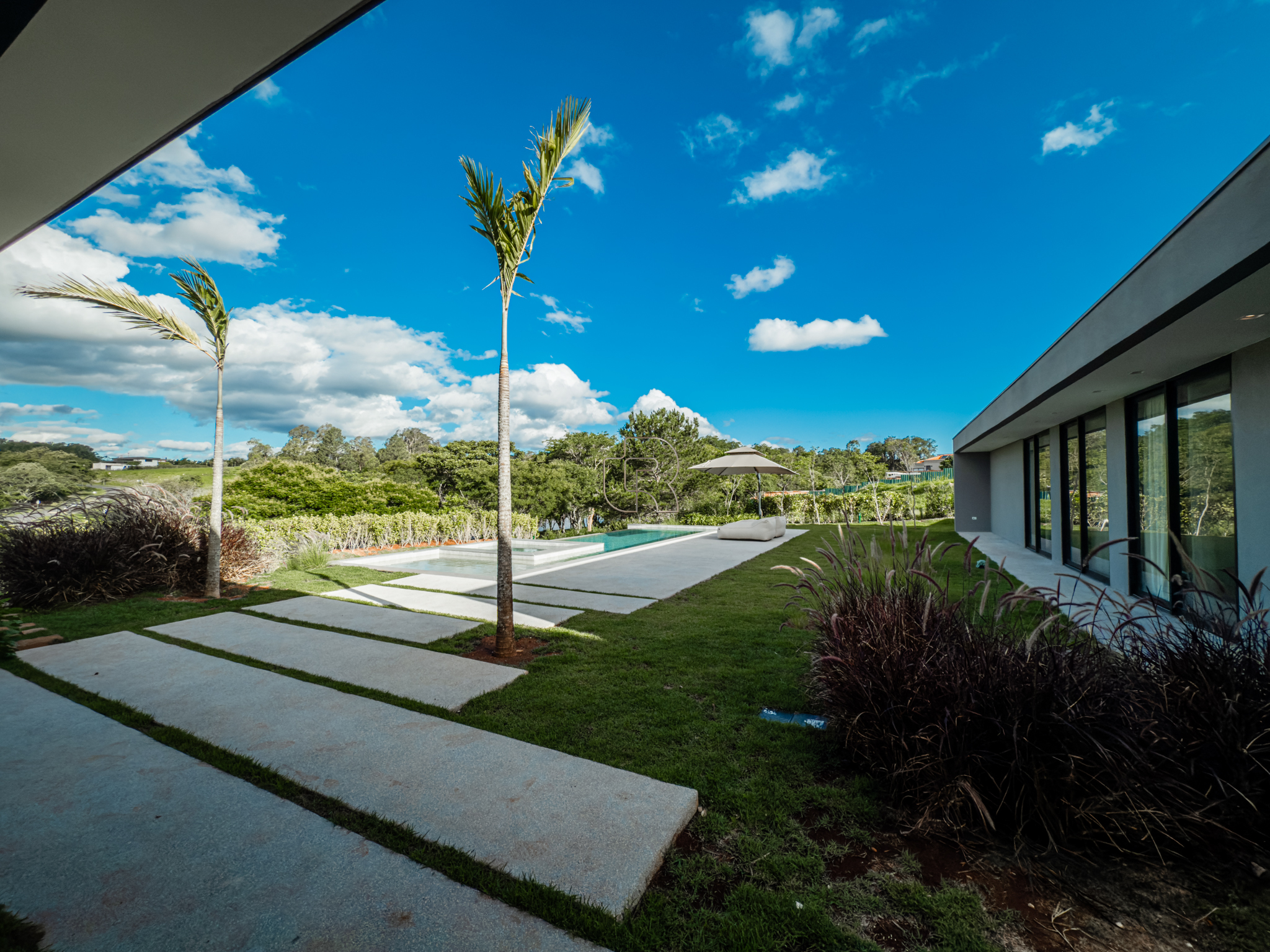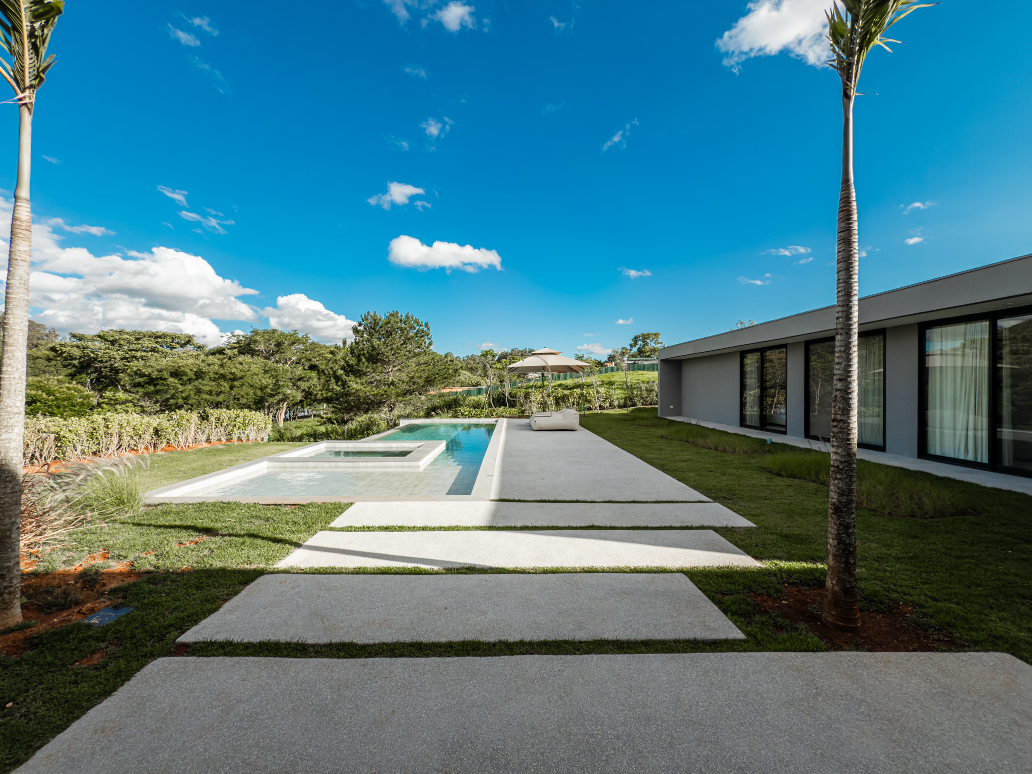 A área gourmet é equipada com cervejeira, cooktop, forno de pizza e churrasqueira, ideal para receber com conforto e elegância. Na área externa, a casa dispõe de piscina com borda infinita e spa com hidromassagem, proporcionando lazer e bem-estar. Os acabamentos refletem alto padrão, com piso em madeira nas suítes e porcelanato Portobello nos demais ambientes, além de portas painel do piso ao teto, que garantem amplitude, iluminação natural e um design marcante.