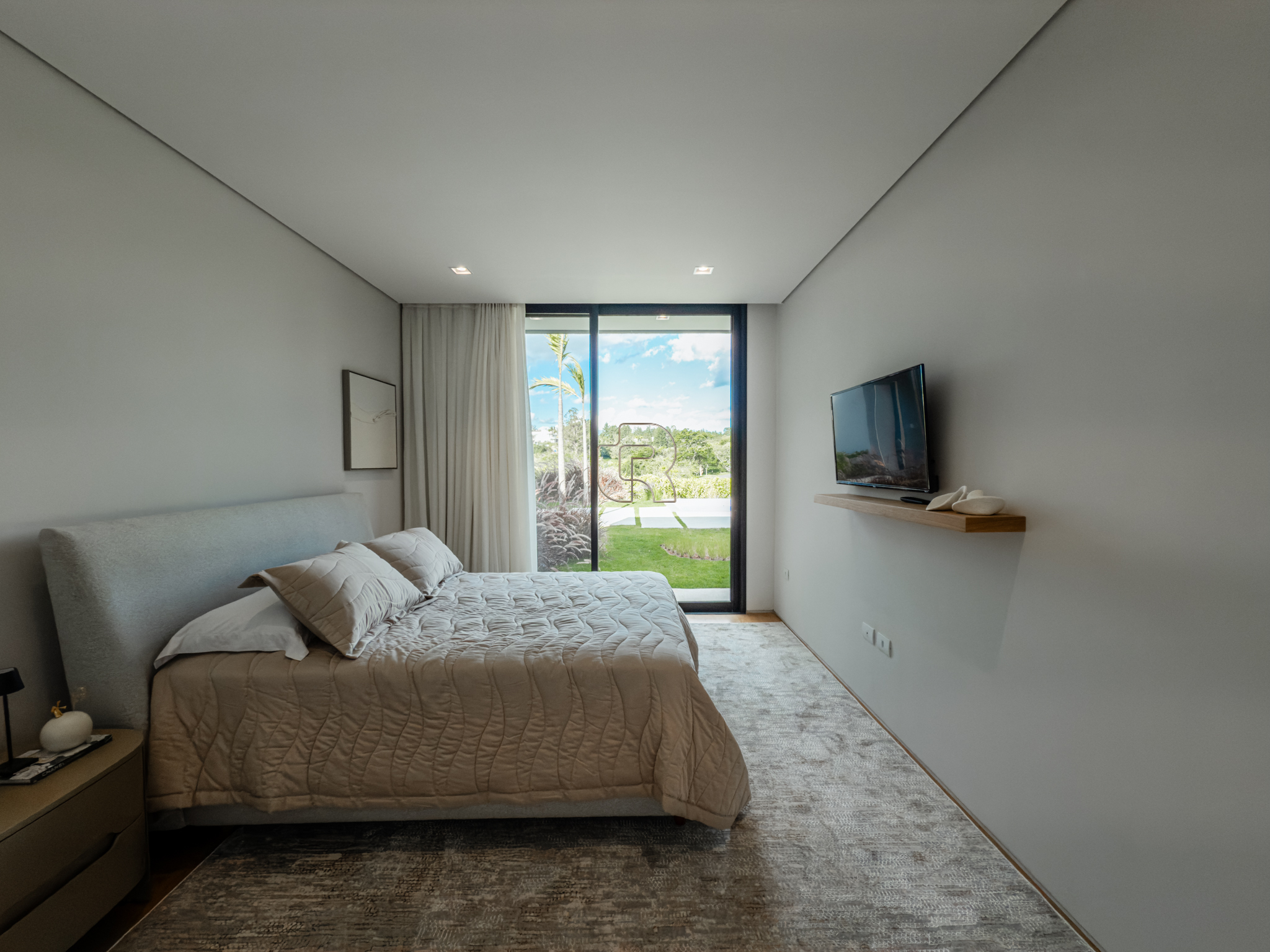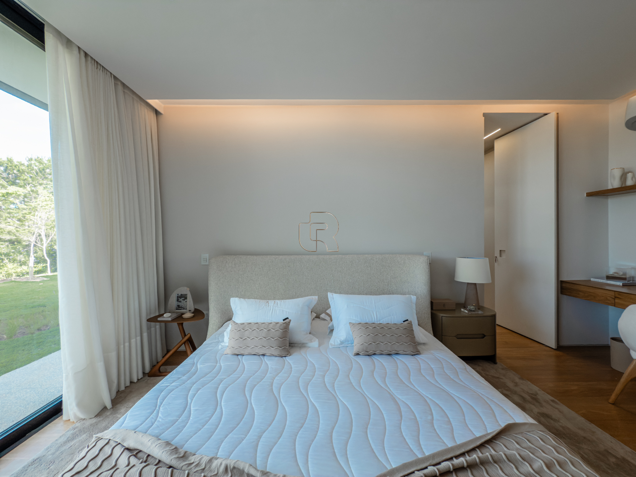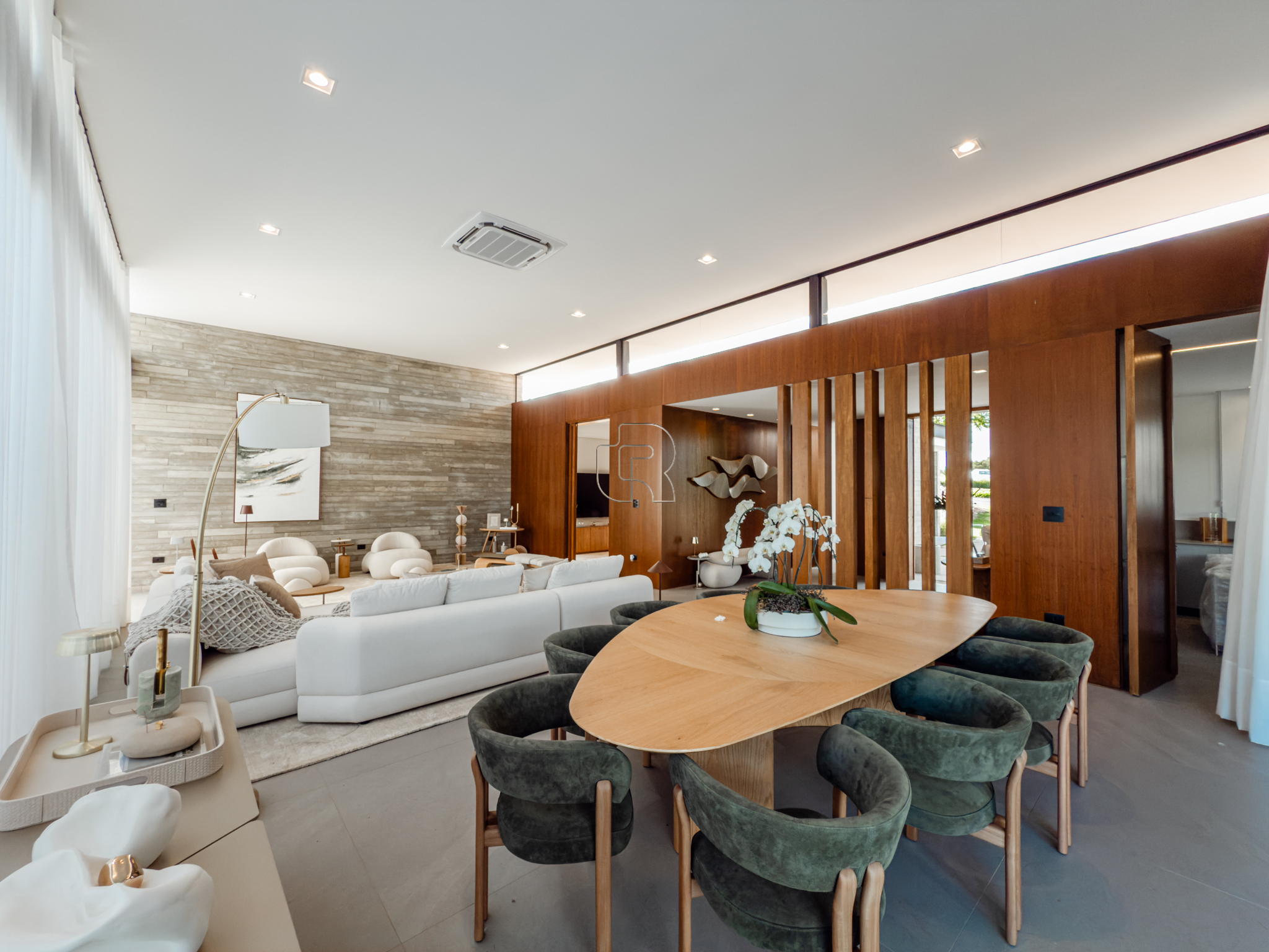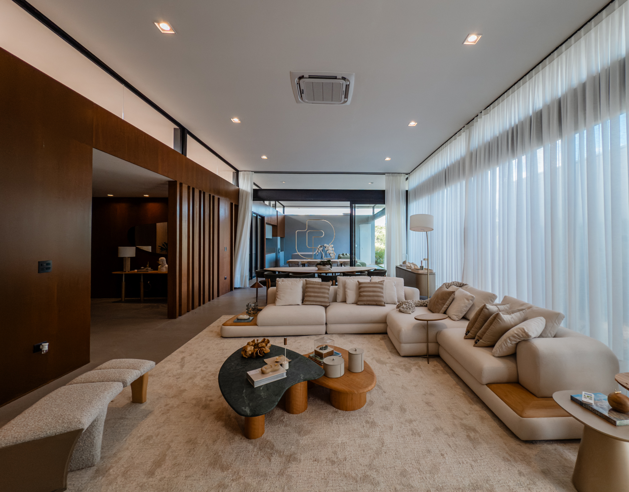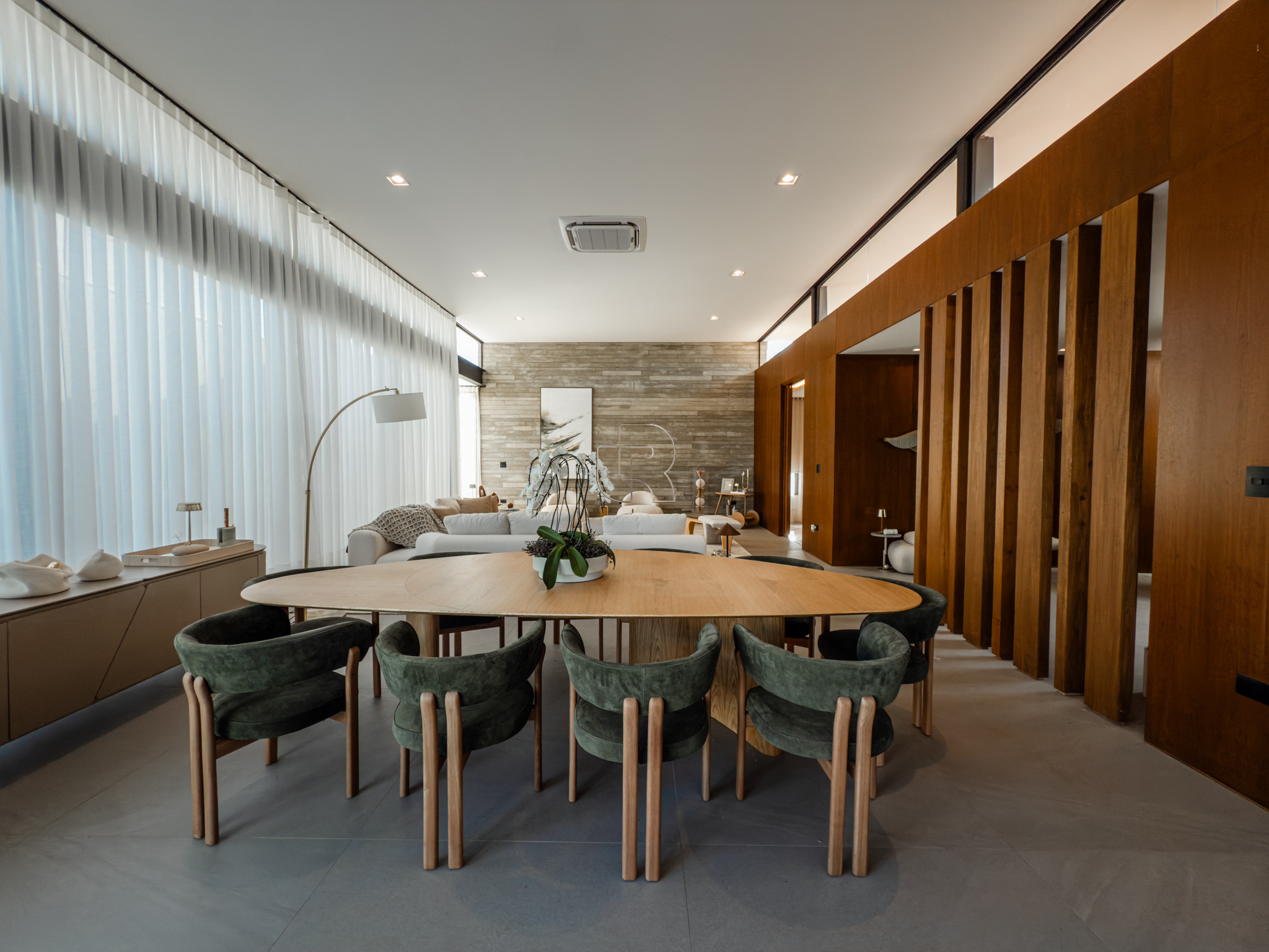 A área gourmet é equipada com cervejeira, cooktop, forno de pizza e churrasqueira, ideal para receber com conforto e elegância. Na área externa, a casa dispõe de piscina com borda infinita e spa com hidromassagem, proporcionando lazer e bem-estar. Os acabamentos refletem alto padrão, com piso em madeira nas suítes e porcelanato Portobello nos demais ambientes, além de portas painel do piso ao teto, que garantem amplitude, iluminação natural e um design marcante.