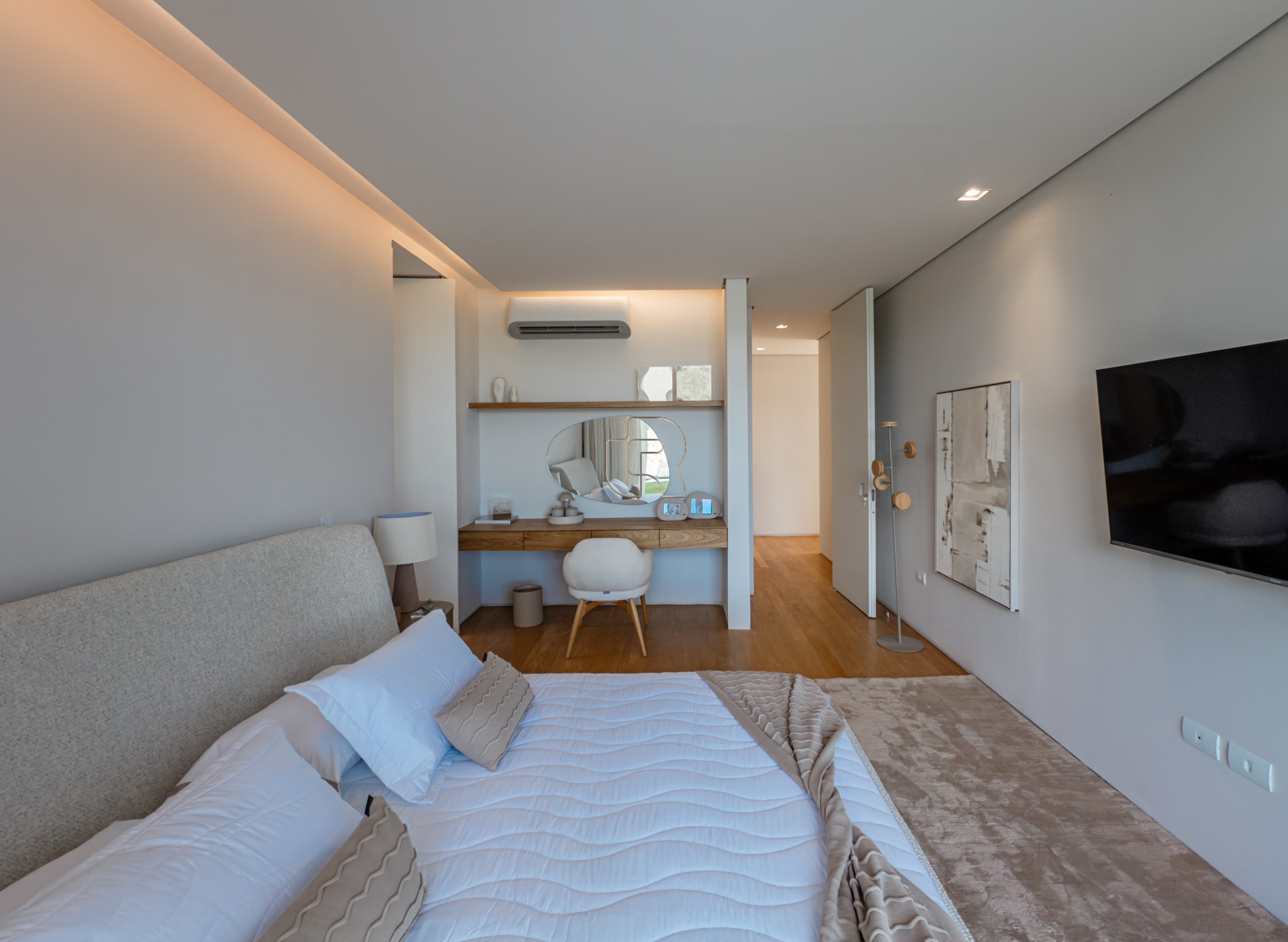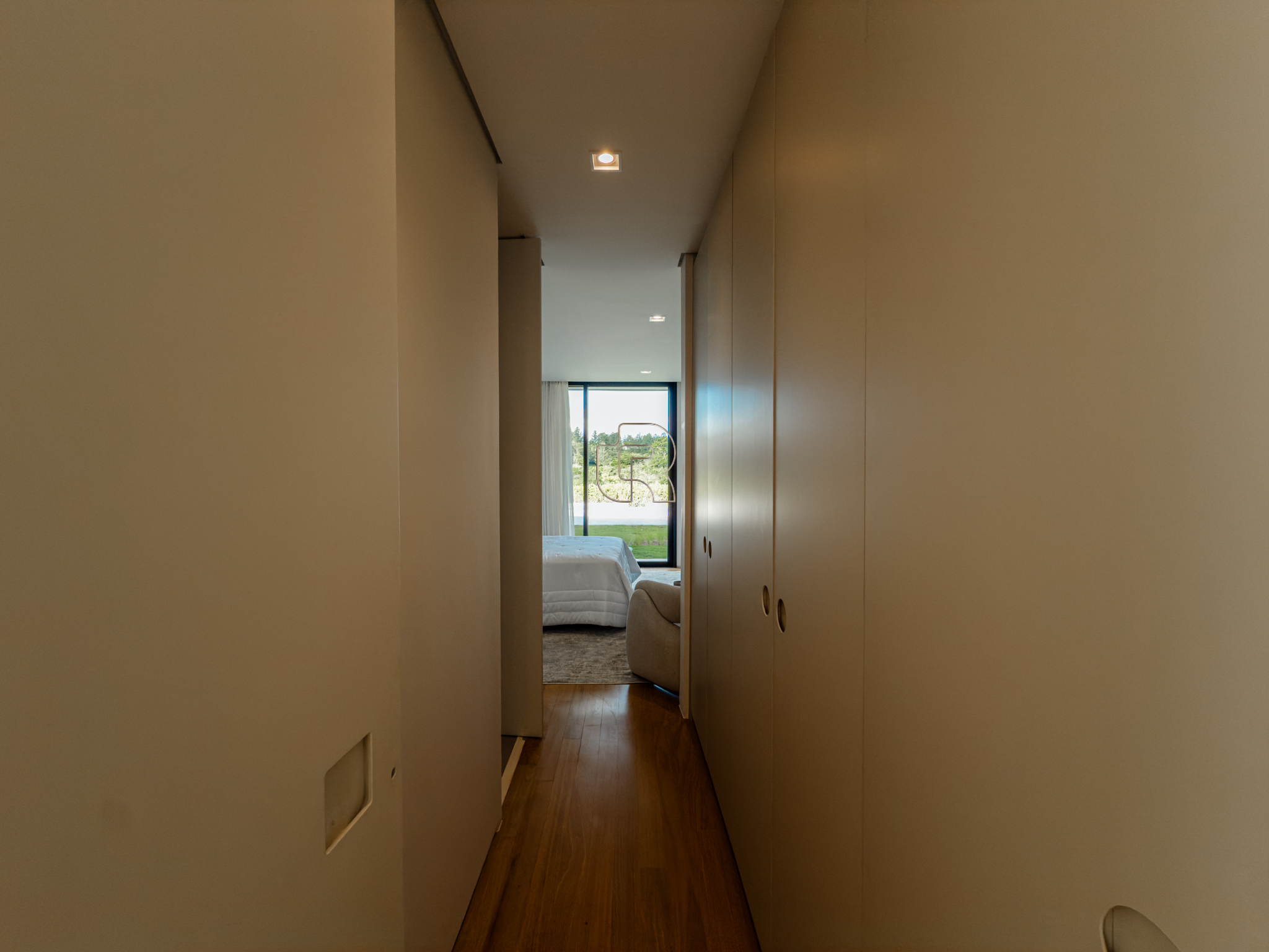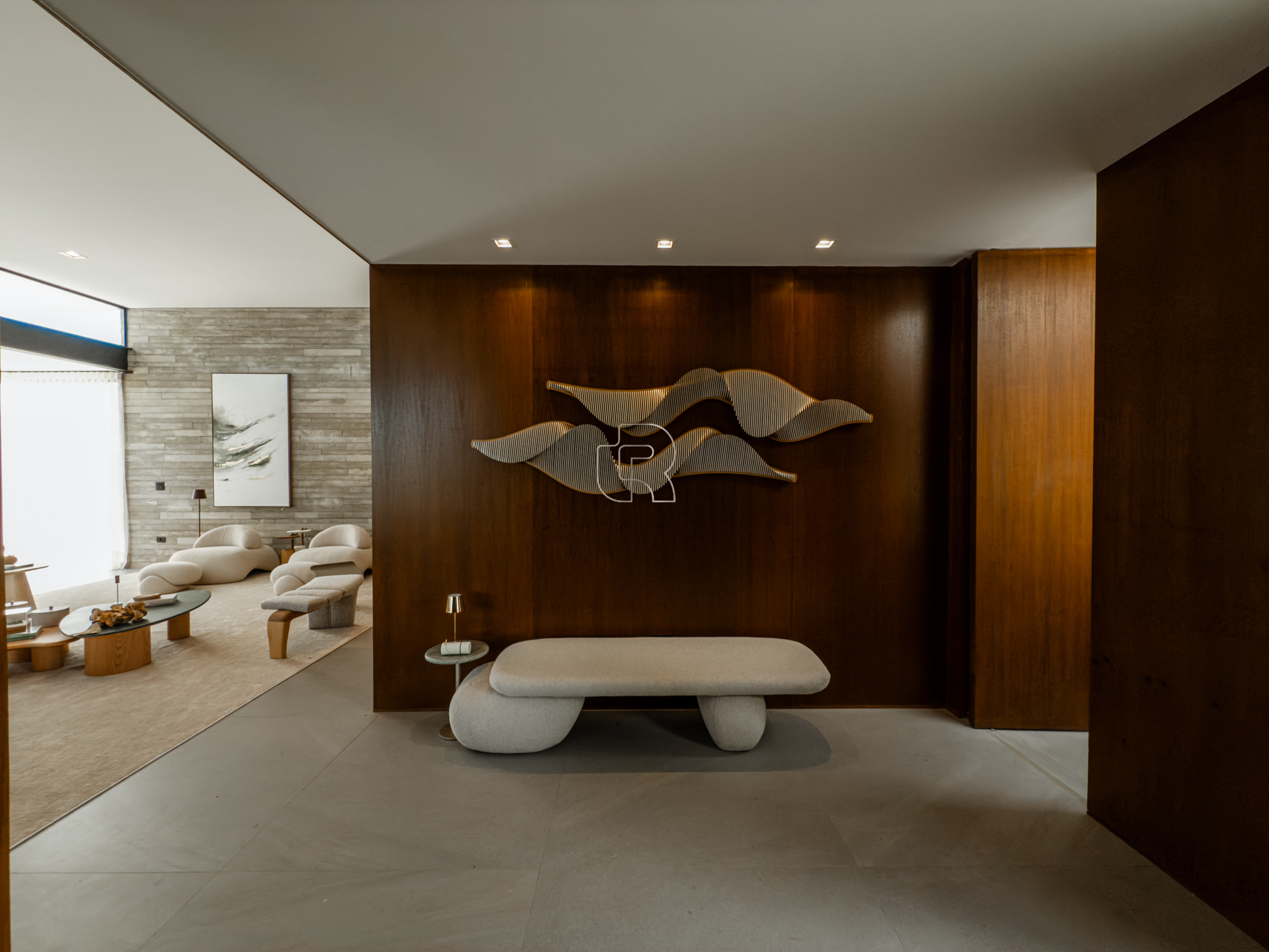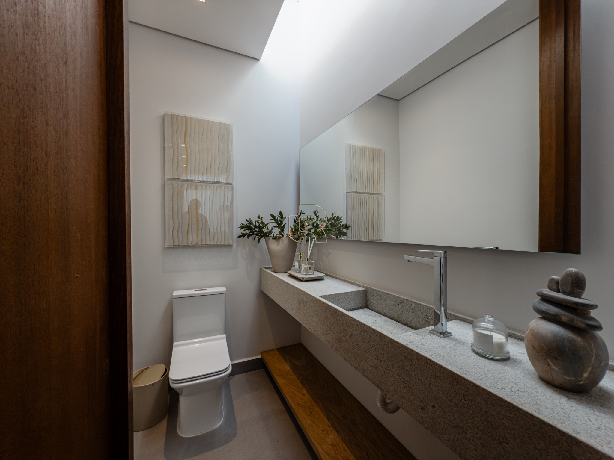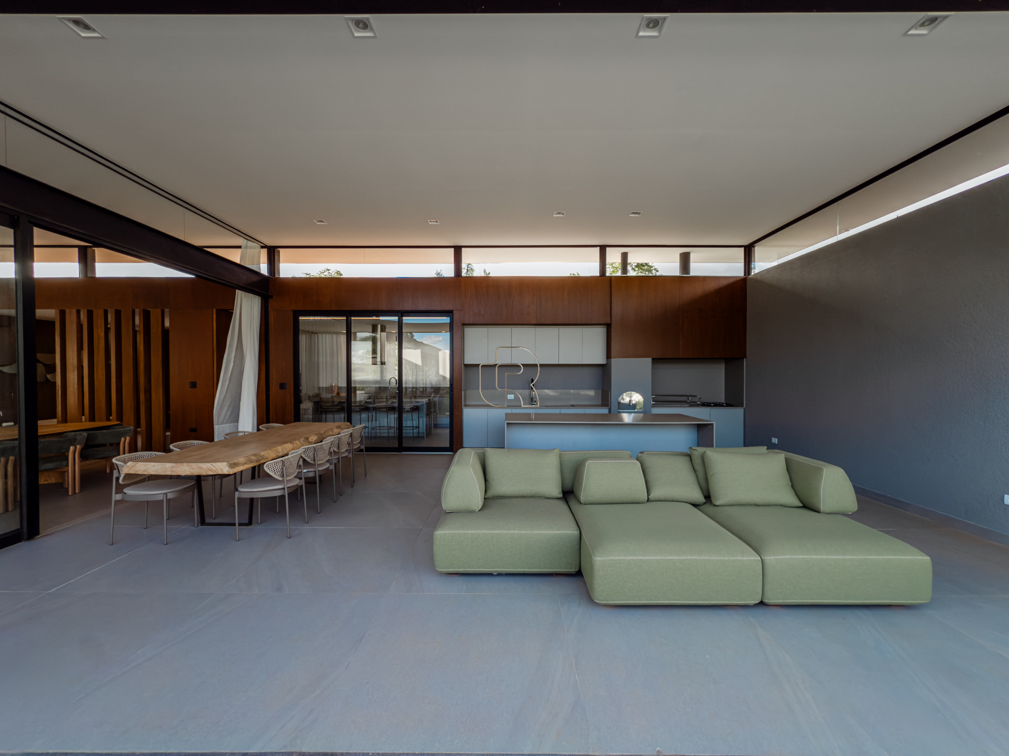 A área gourmet é equipada com cervejeira, cooktop, forno de pizza e churrasqueira, ideal para receber com conforto e elegância. Na área externa, a casa dispõe de piscina com borda infinita e spa com hidromassagem, proporcionando lazer e bem-estar. Os acabamentos refletem alto padrão, com piso em madeira nas suítes e porcelanato Portobello nos demais ambientes, além de portas painel do piso ao teto, que garantem amplitude, iluminação natural e um design marcante.