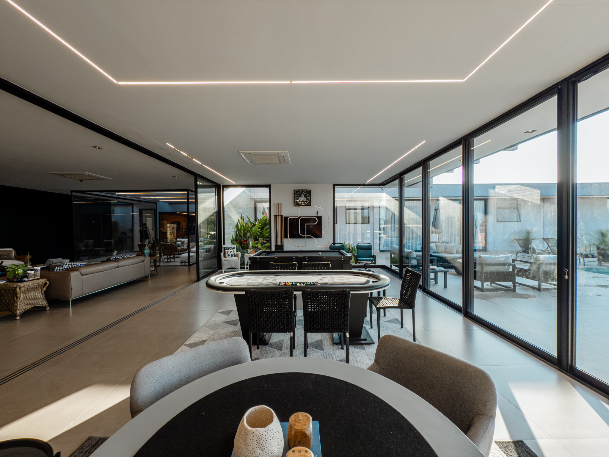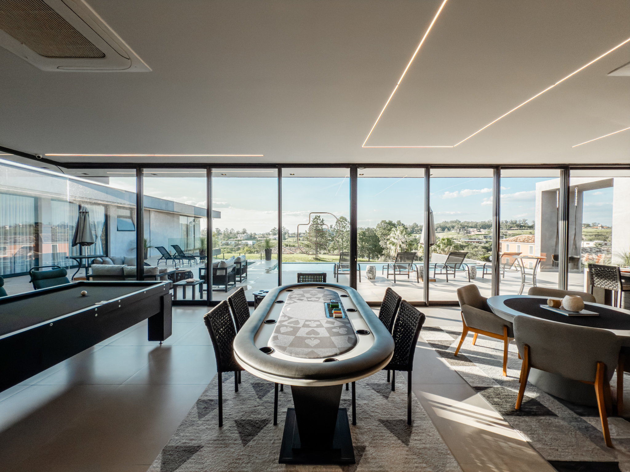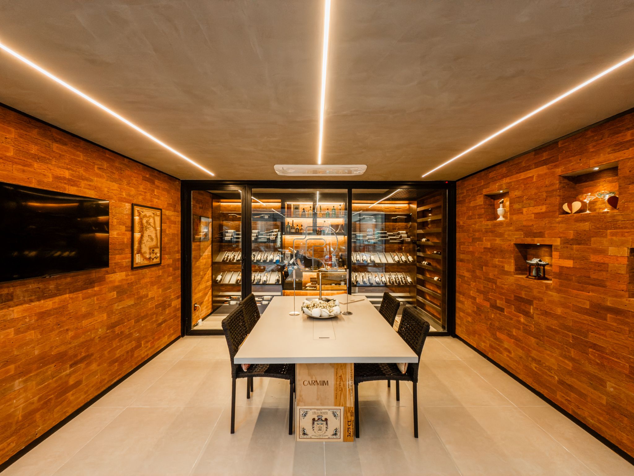 Os ambientes de lazer foram idealizados para momentos de convivência e contemplação, destacando-se a adega central climatizada e os espaços integrados ao paisagismo exuberante, que reforçam a harmonia entre elegância, conforto e natureza.