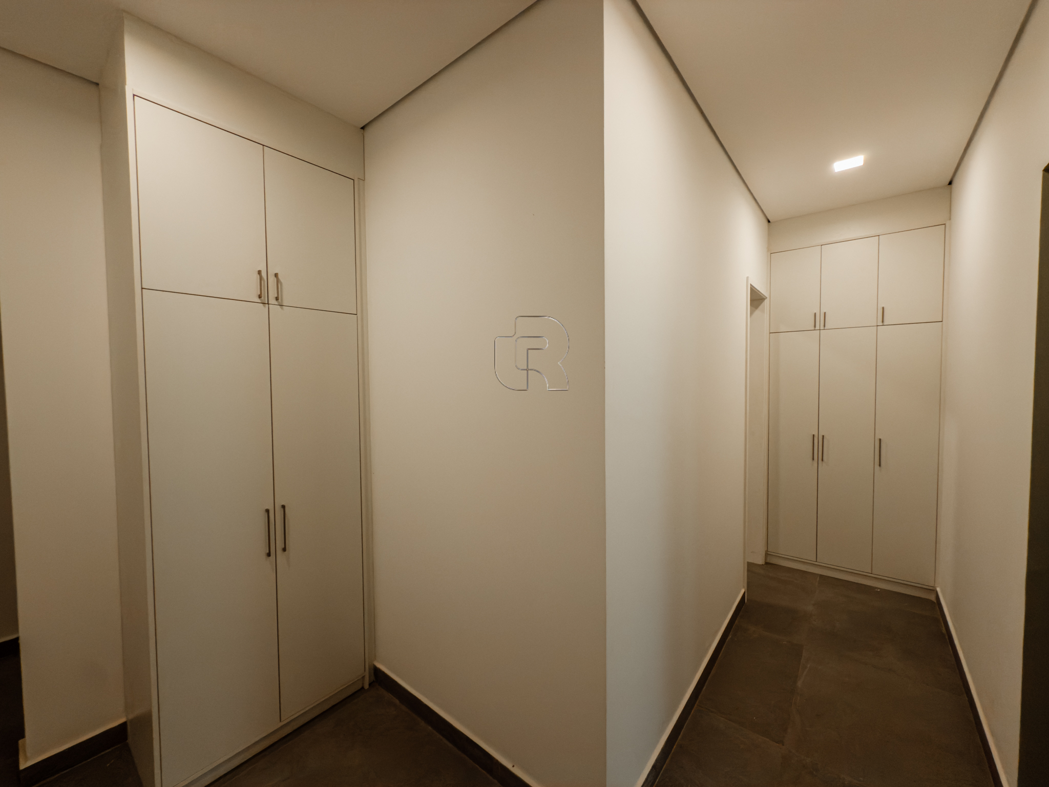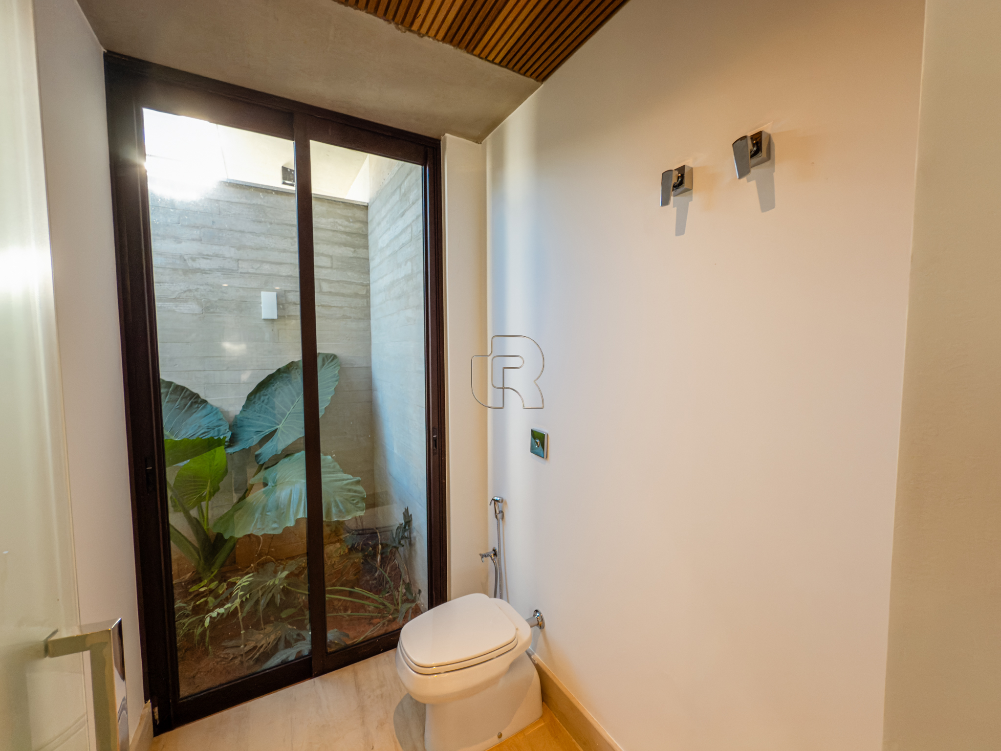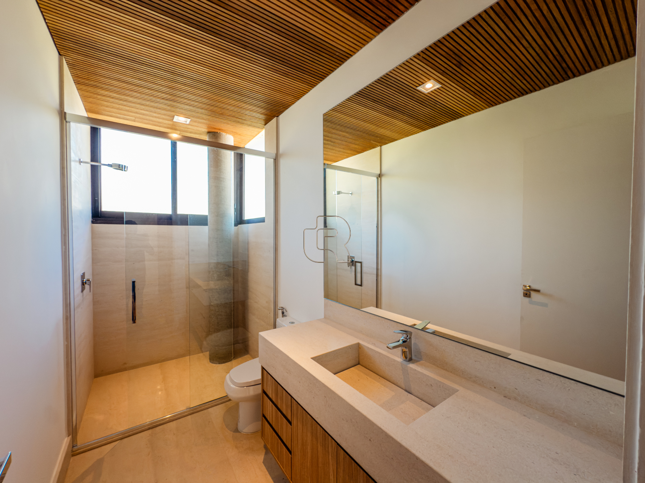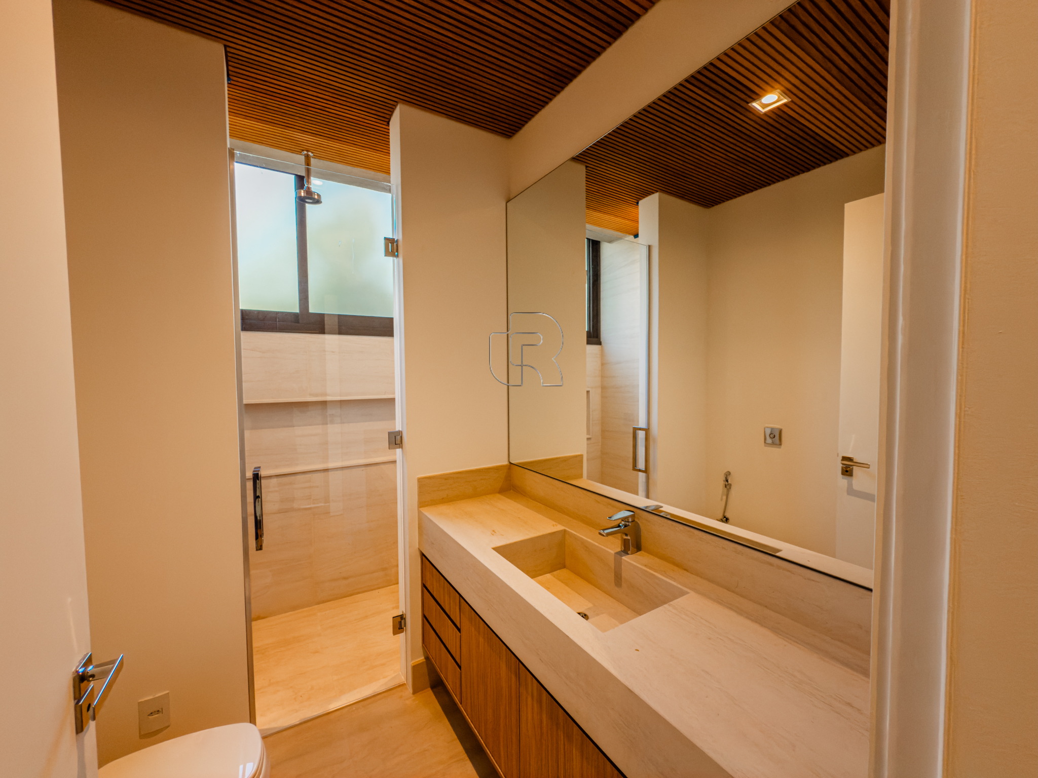 Projeto arquitetônico assinado por DBarquitetos – David Bastos Arquitetura. A residência conta com ampla sala integrada e pé-direito de 4,5 metros, cozinha com marcenaria planejada, lavabo social e banheiro de piscina. São cinco suítes com marcenaria, sendo a master com closet montado, além de roupeiro no corredor íntimo.