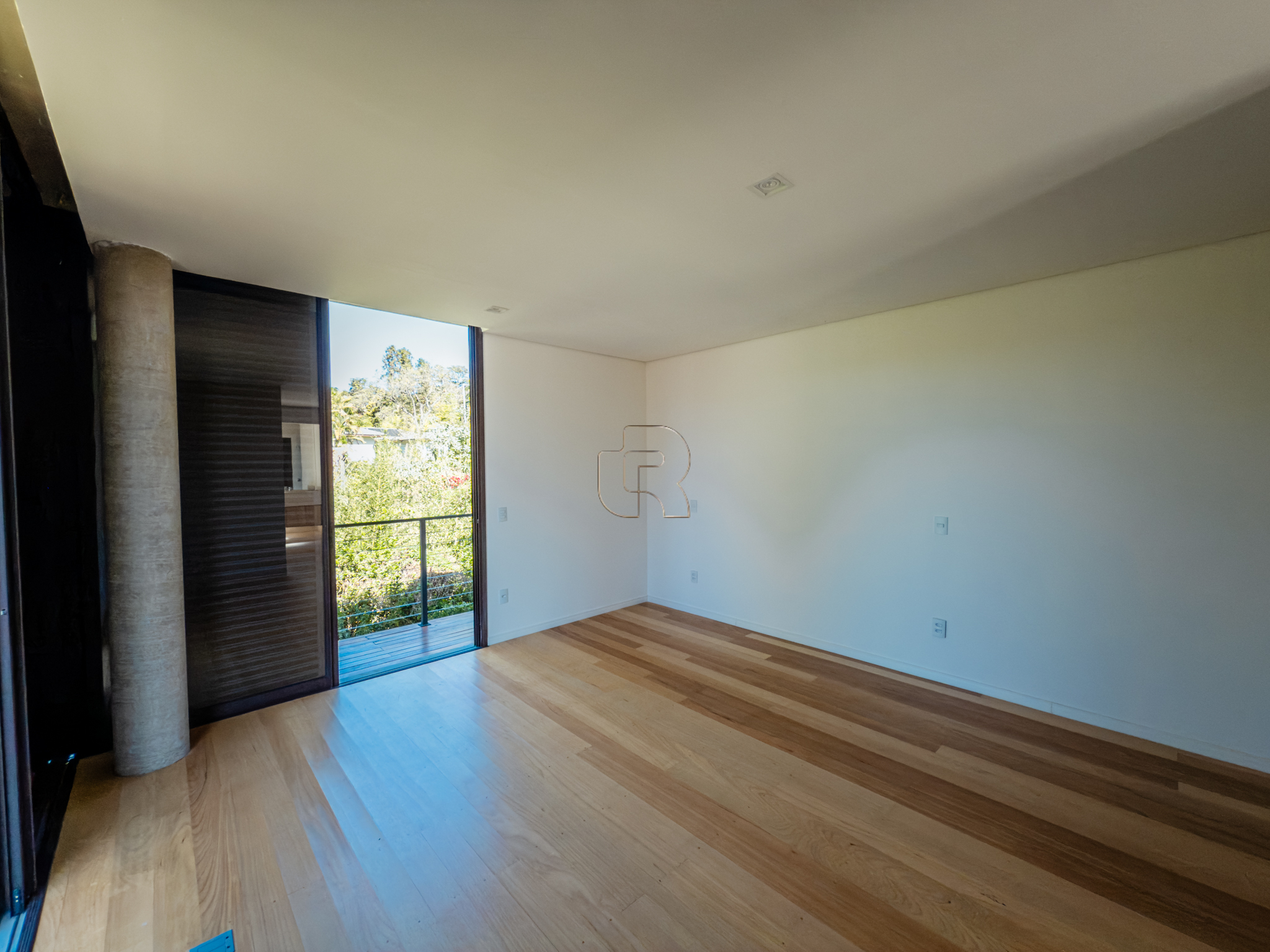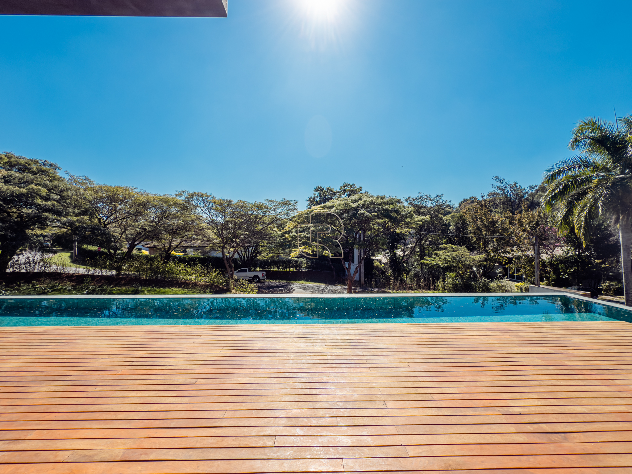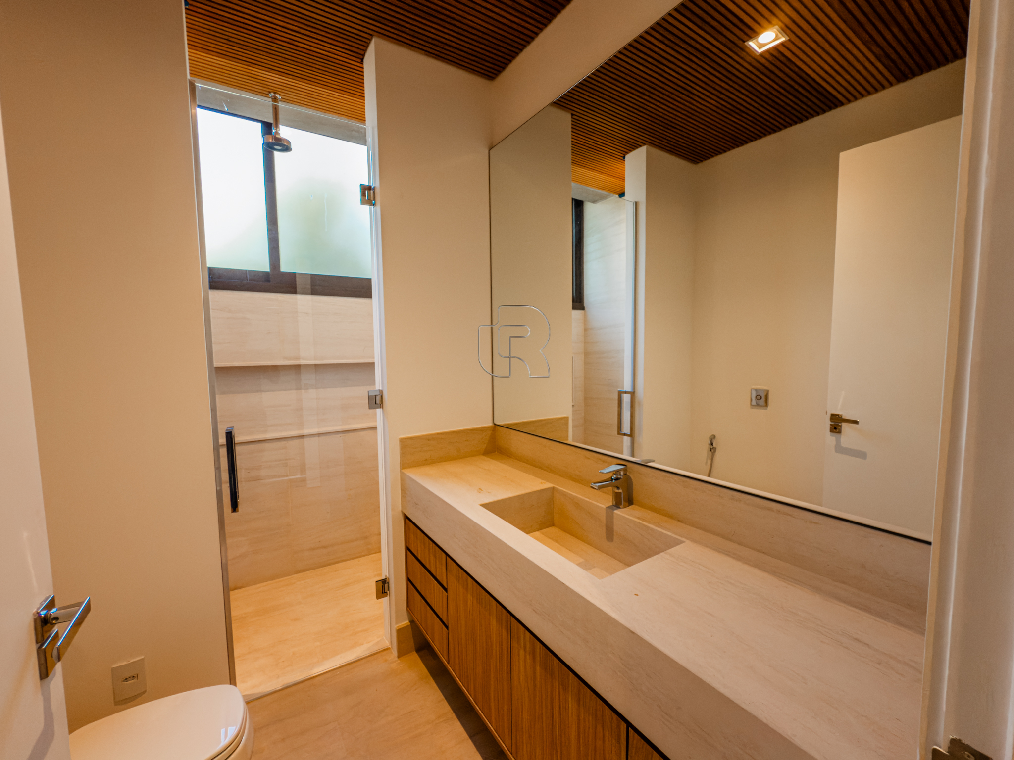 Projeto arquitetônico assinado por DBarquitetos – David Bastos Arquitetura. A residência conta com ampla sala integrada e pé-direito de 4,5 metros, cozinha com marcenaria planejada, lavabo social e banheiro de piscina. São cinco suítes com marcenaria, sendo a master com closet montado, além de roupeiro no corredor íntimo.